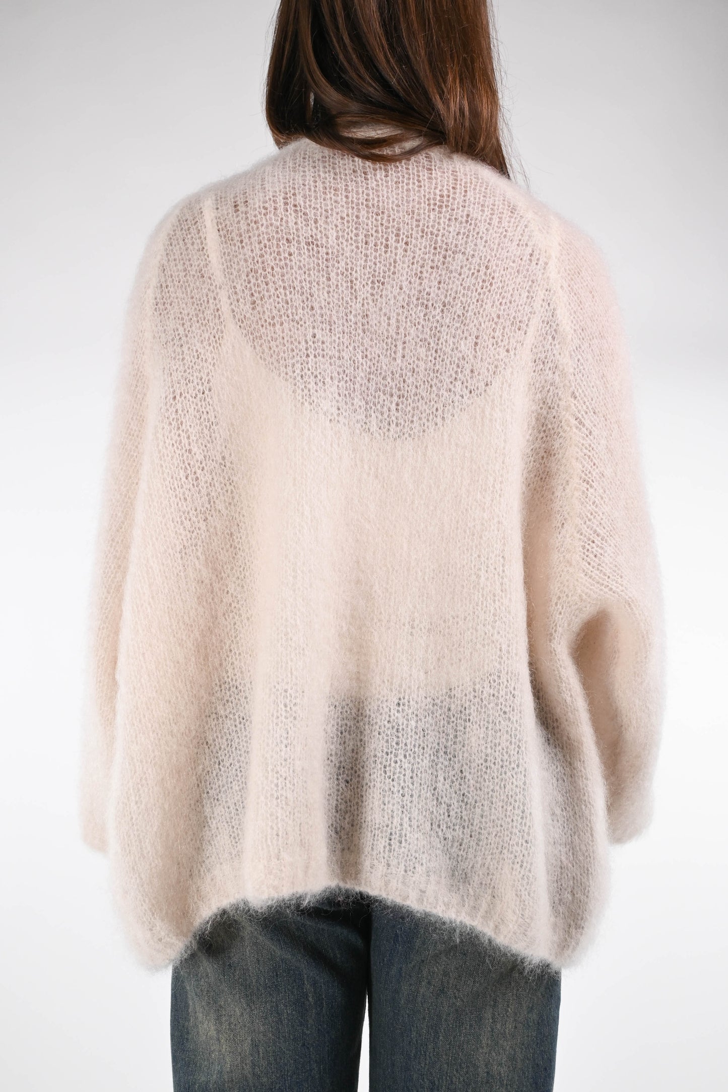 Cardigan over in kid mohair, senza bottoni, manica 7/8 ampia, color beige