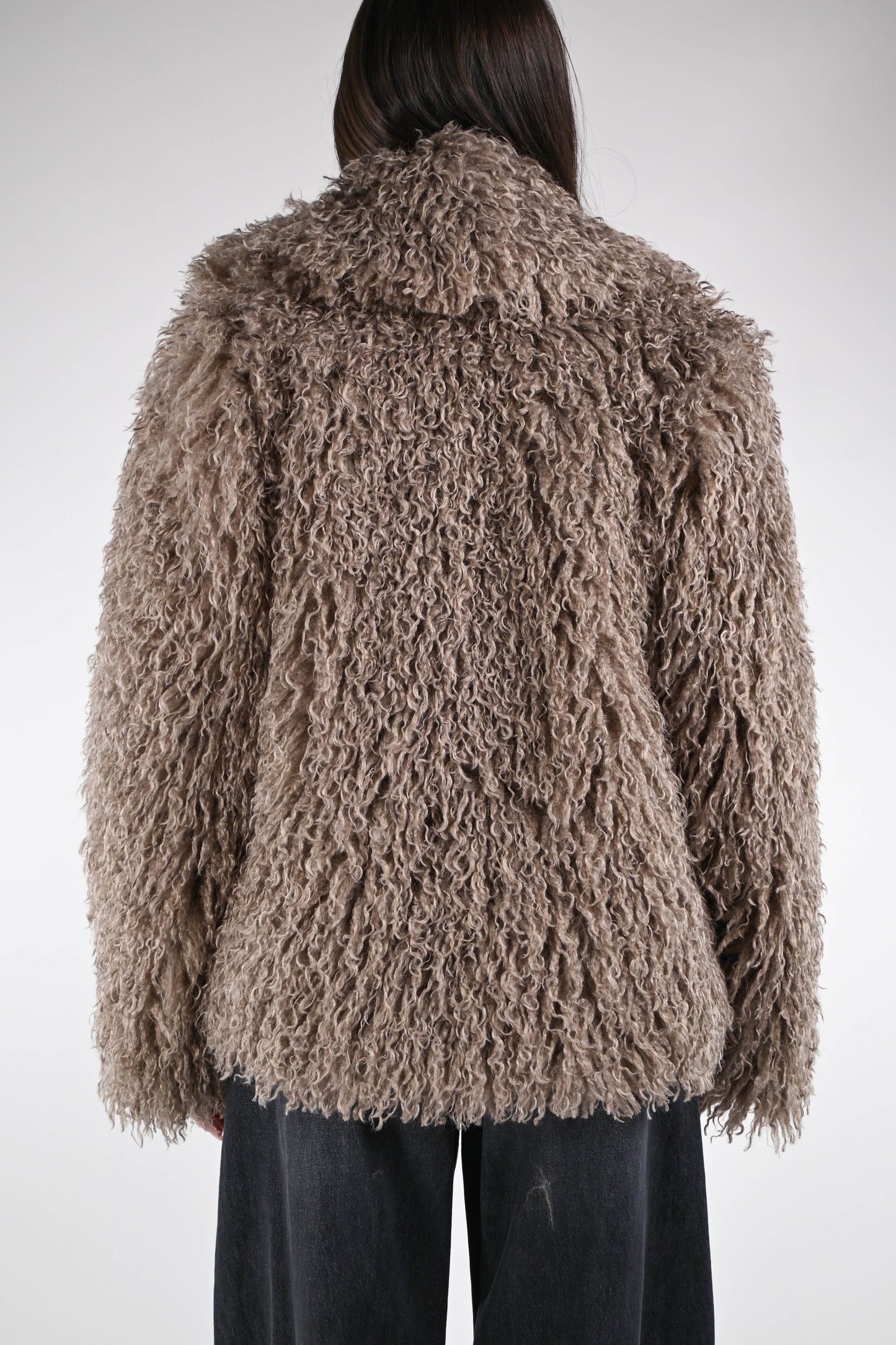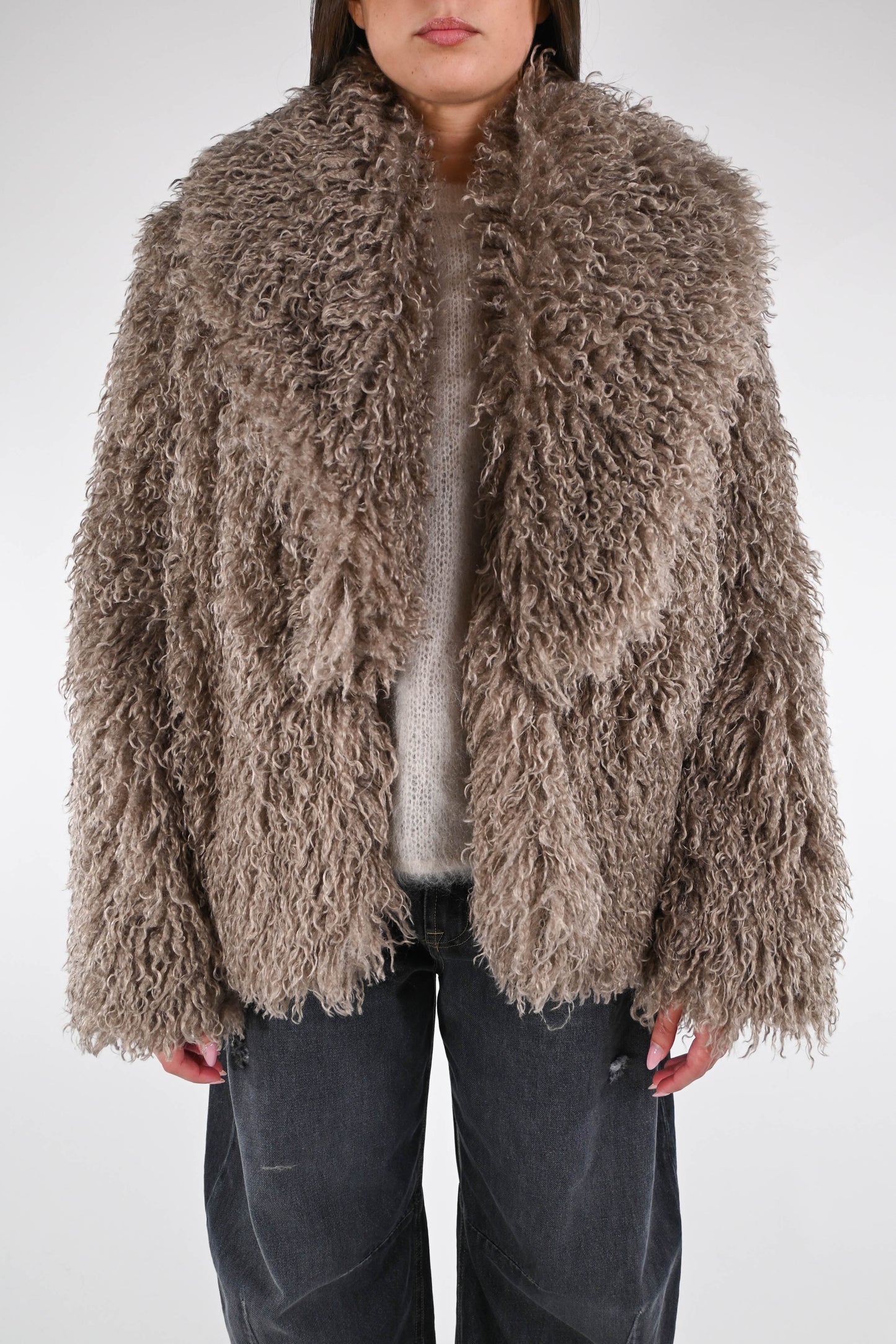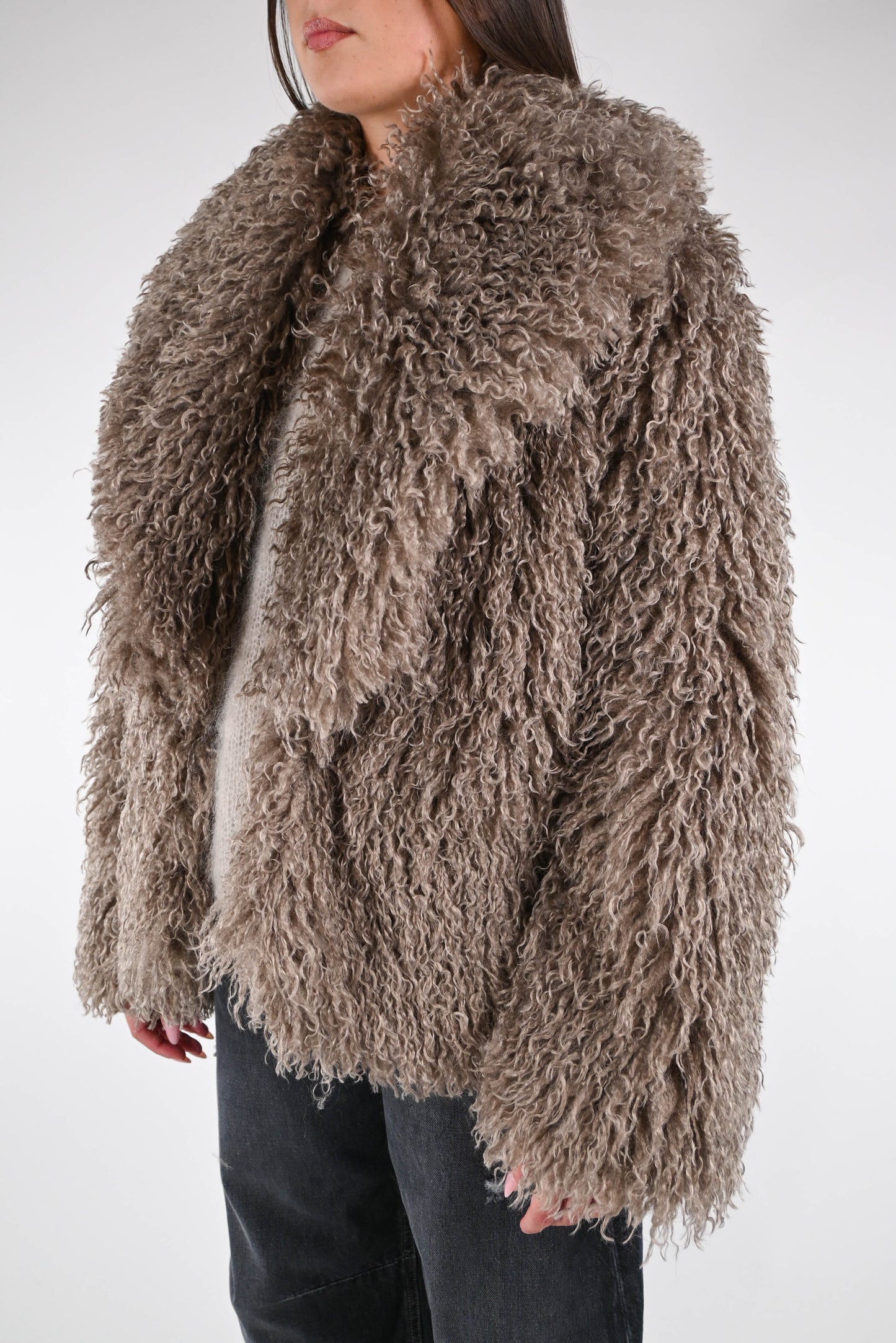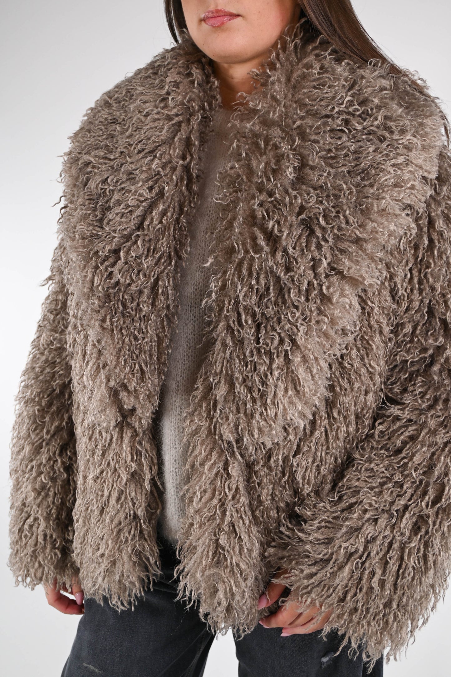 Ecopelliccia mongolia corta, con collo scialle, con tasche, foderata, colore Fango.