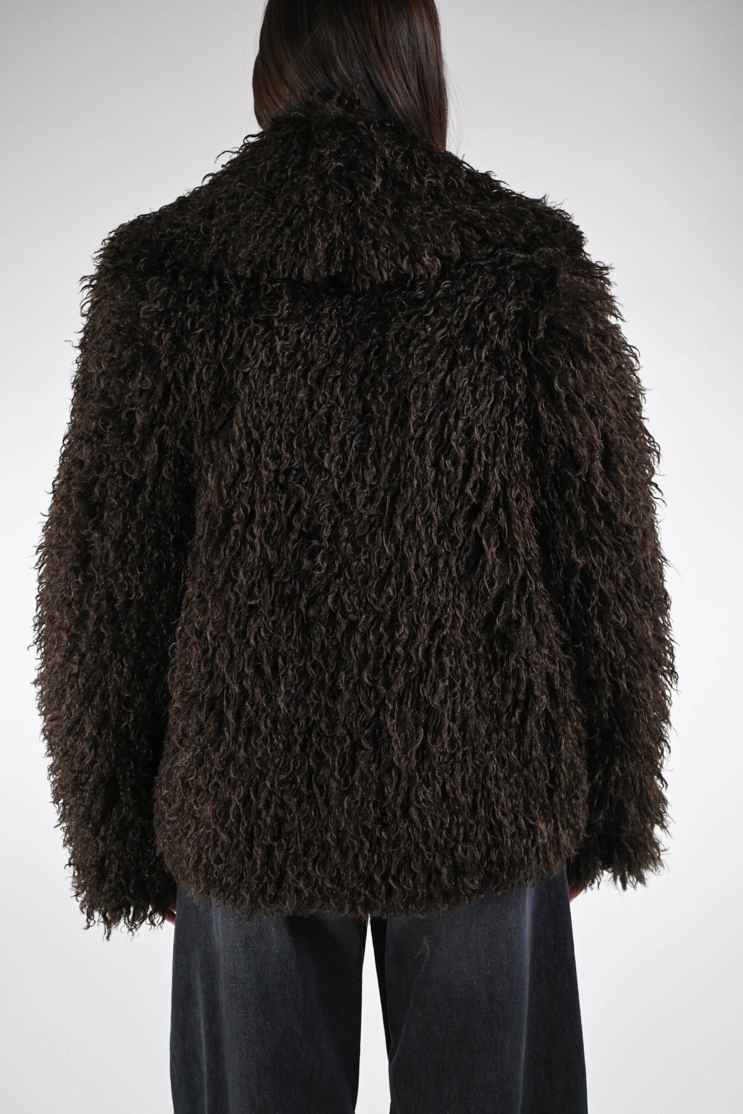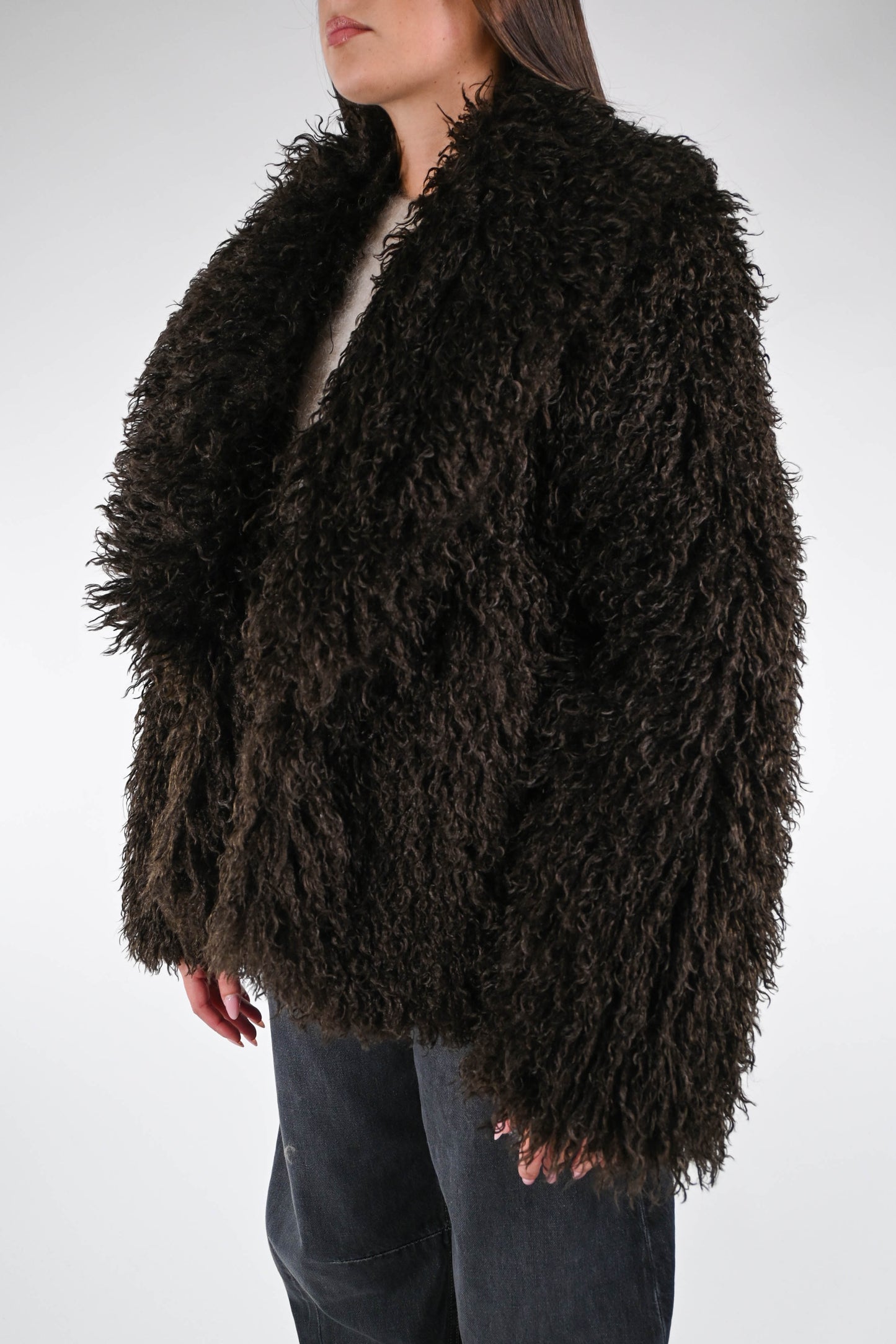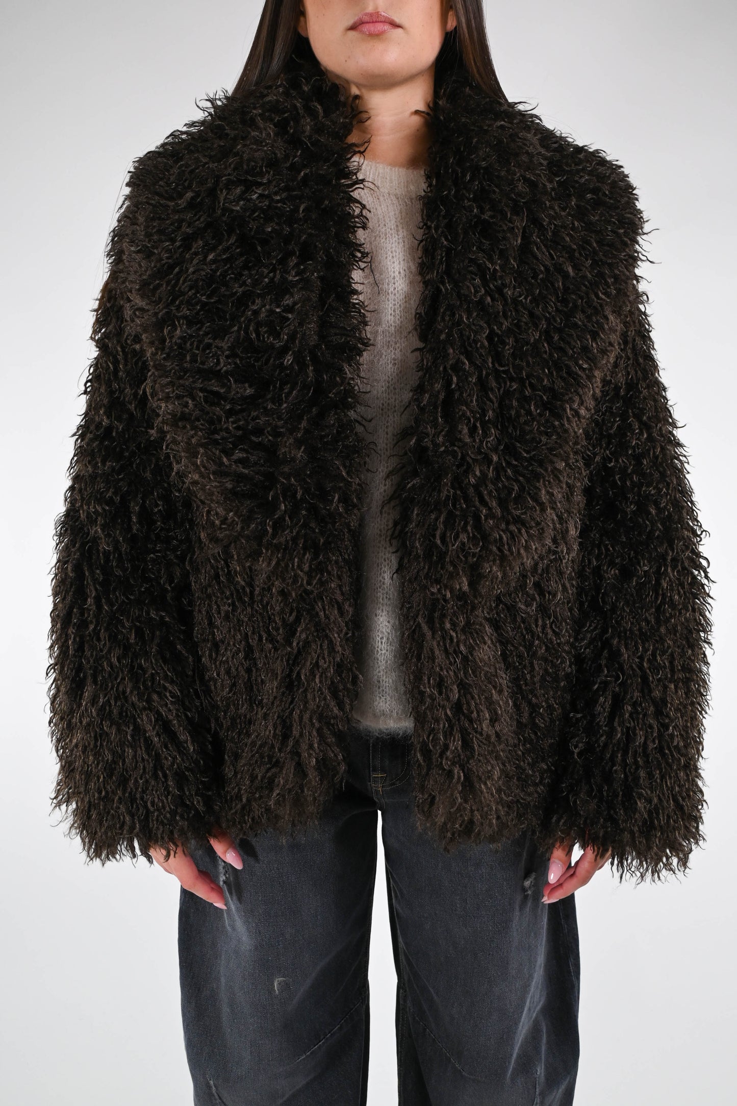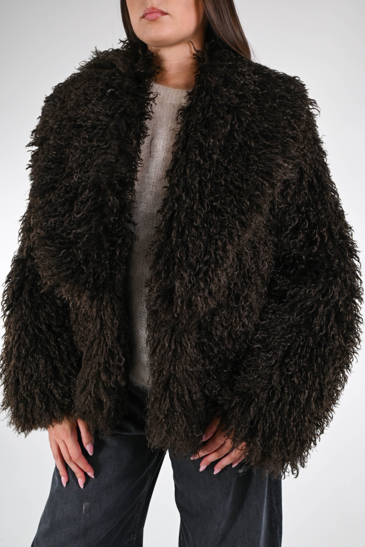 Ecopelliccia mongolia corta, con collo scialle, con tasche, foderata, colore Moro.