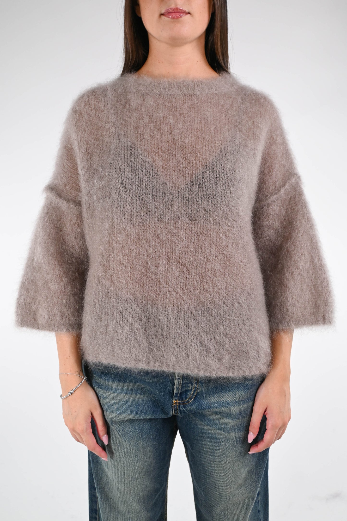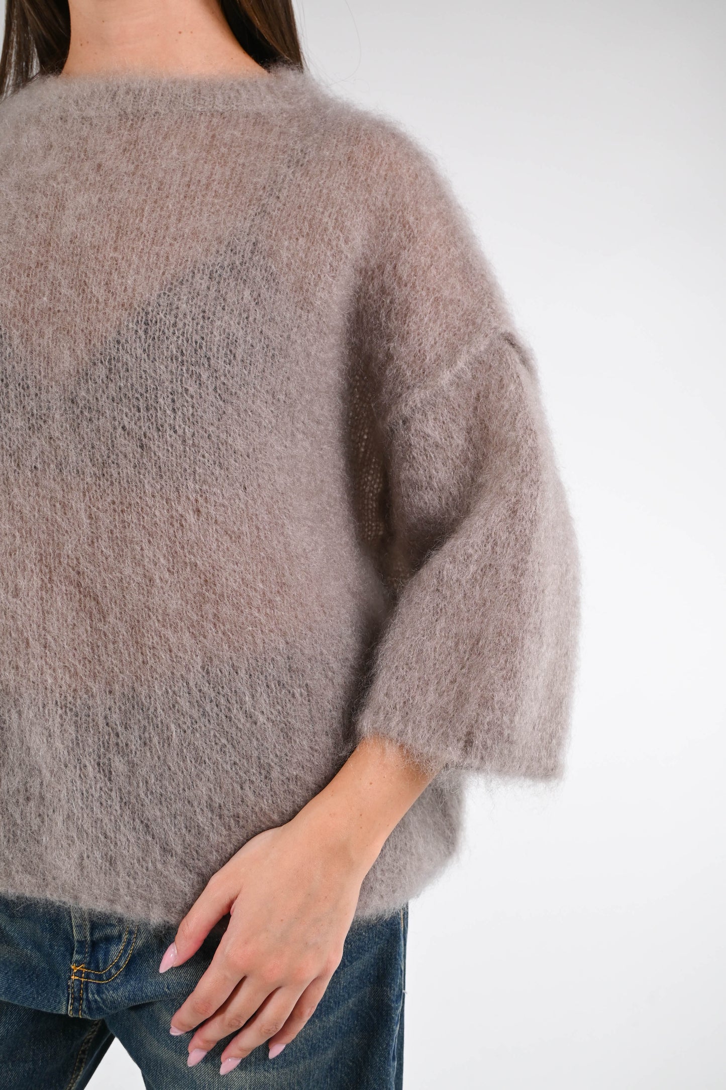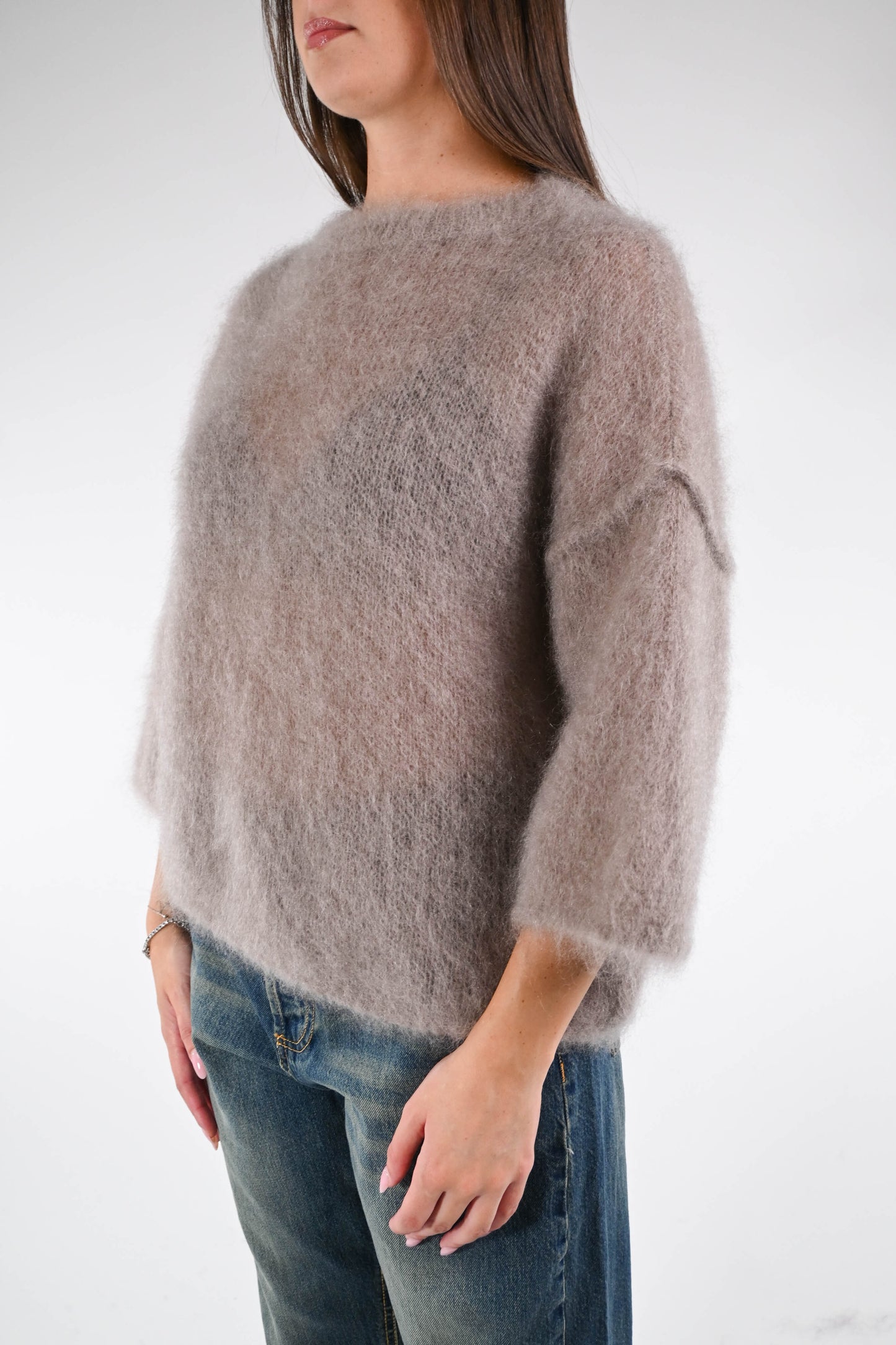 Maglia over a scatola in kid mohair, manica 3/4, girocollo, spalla scesa, cuciture a vista, colore Fango.