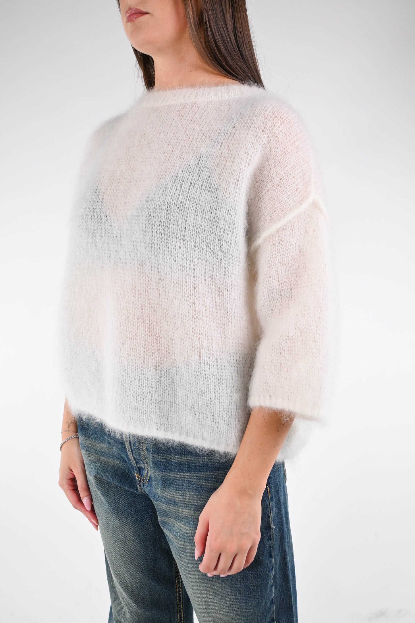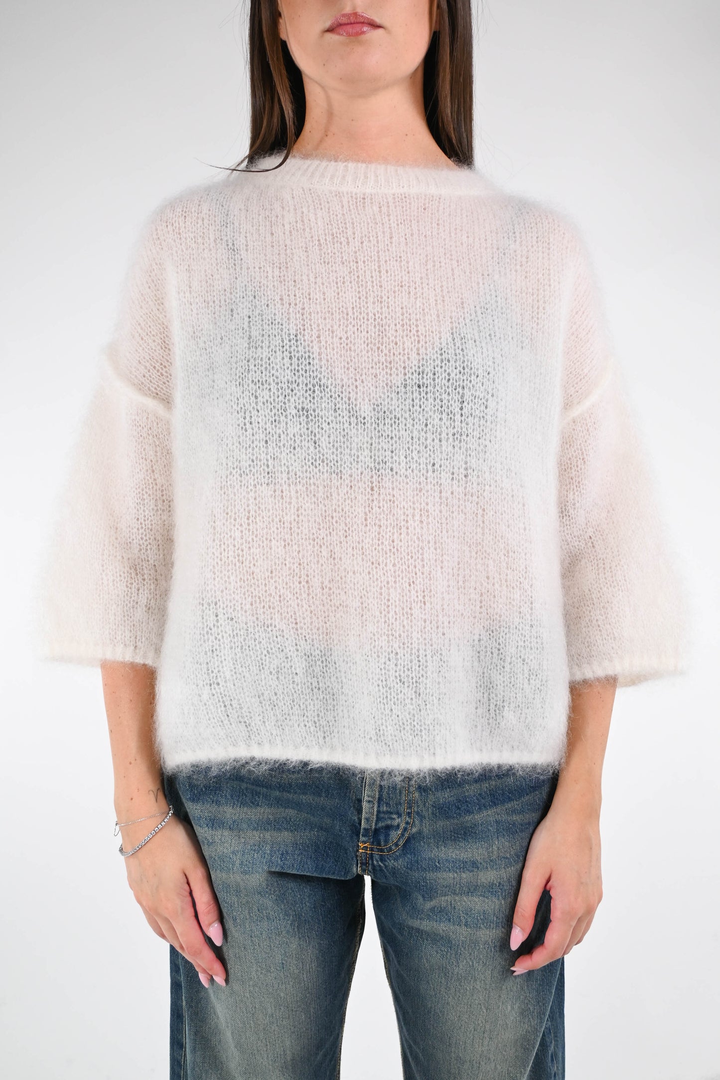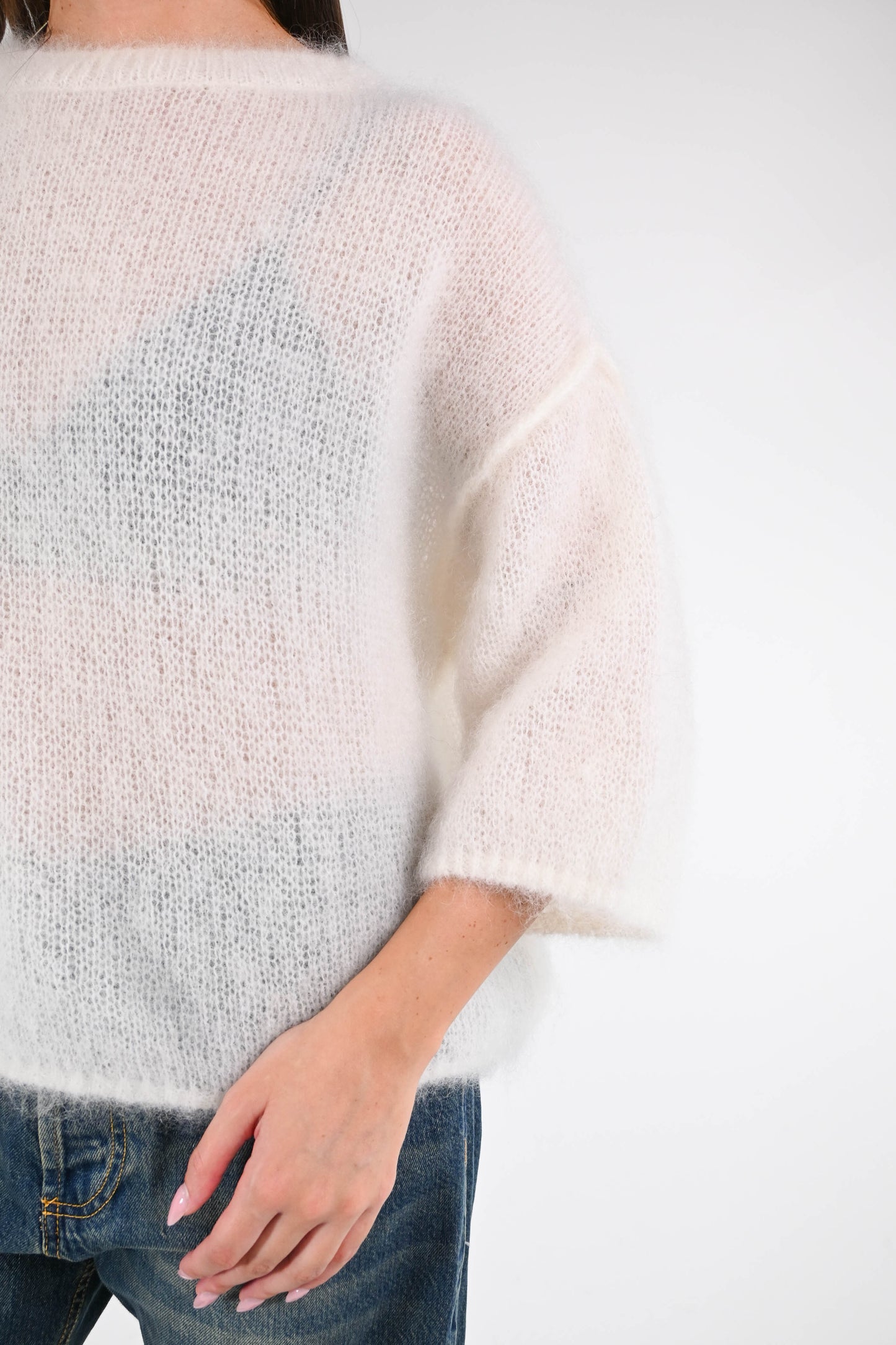 Maglia over a scatola in kid mohair, manica 3/4, girocollo, spalla scesa, cuciture a vista, colore Panna.
