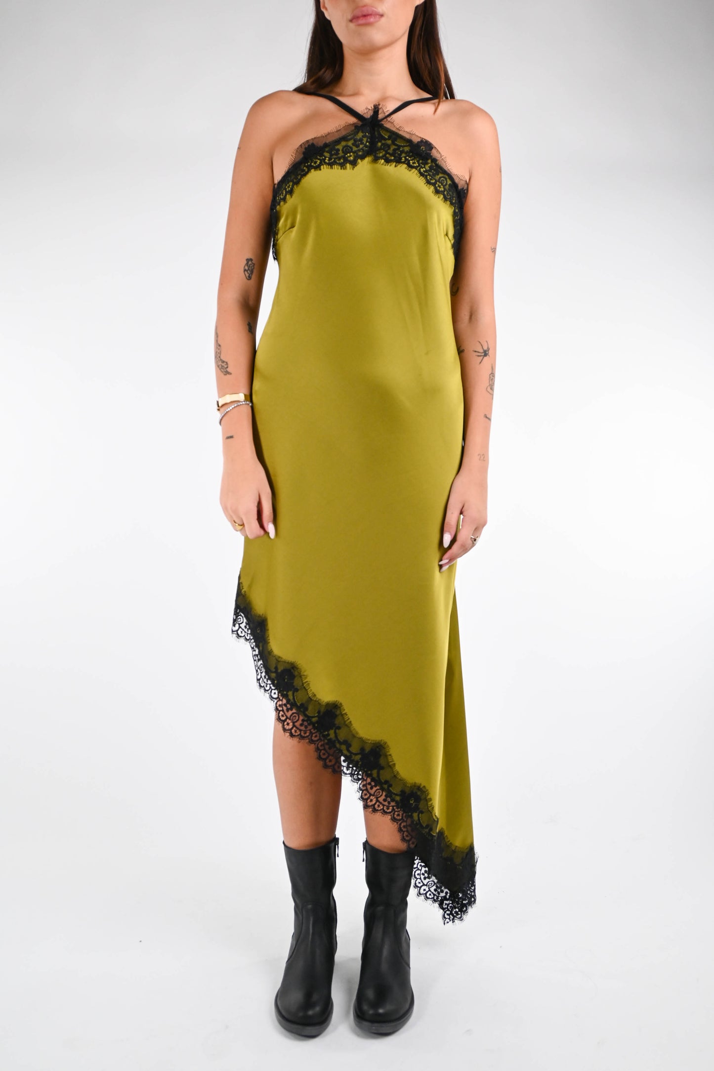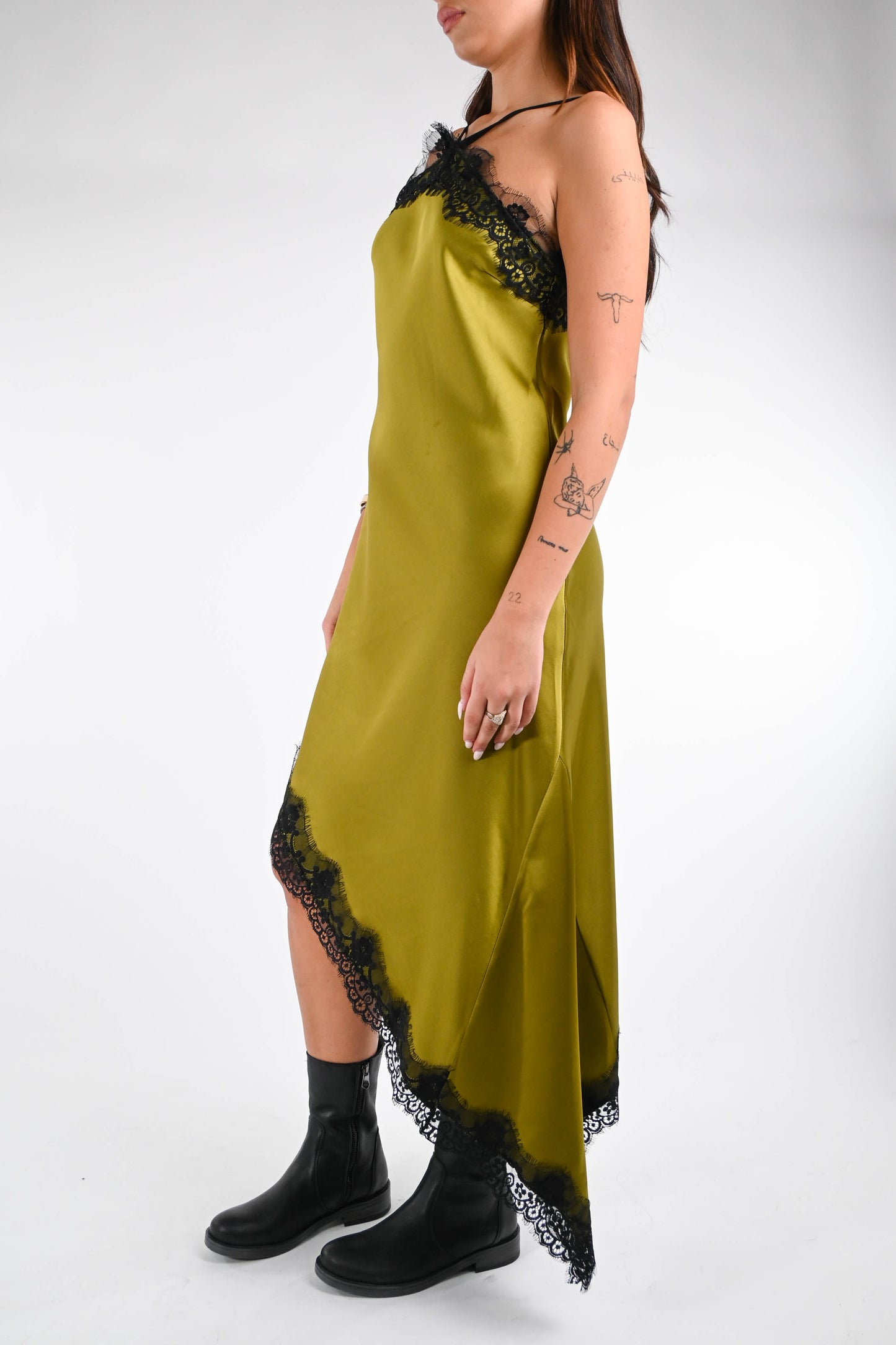 Abito assimetrico in satin con profili pizzo, con spalline regolabili, color olio