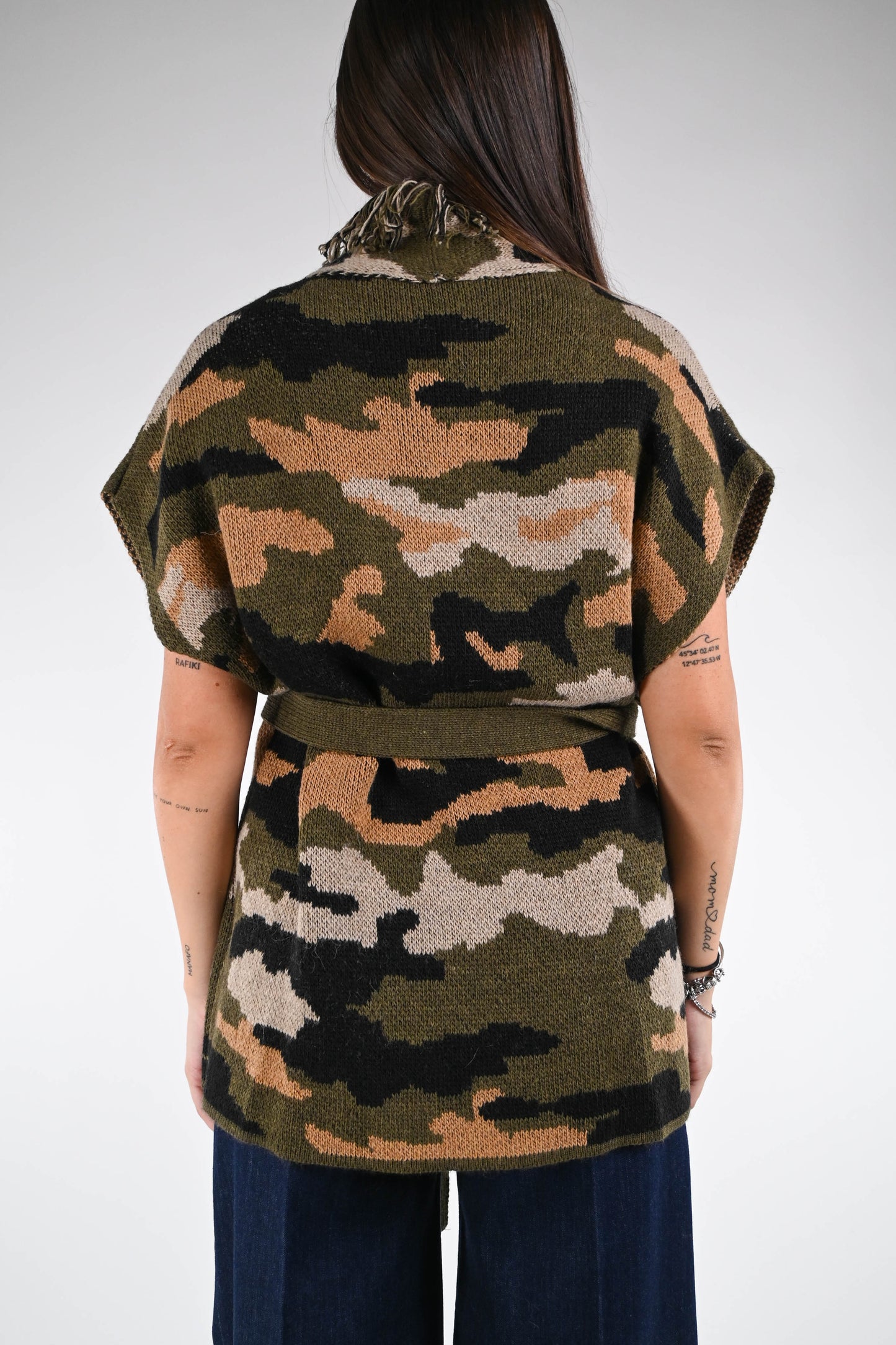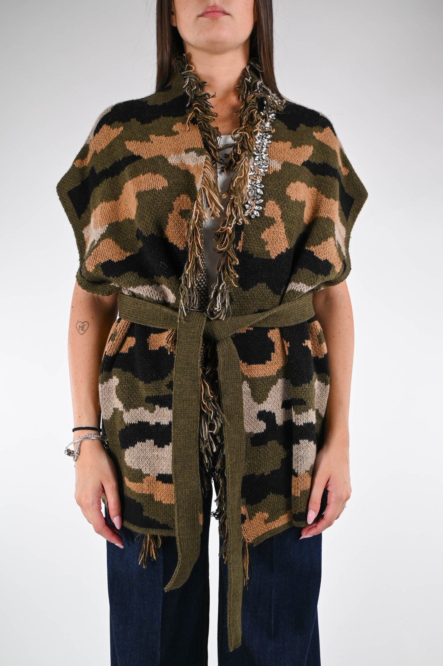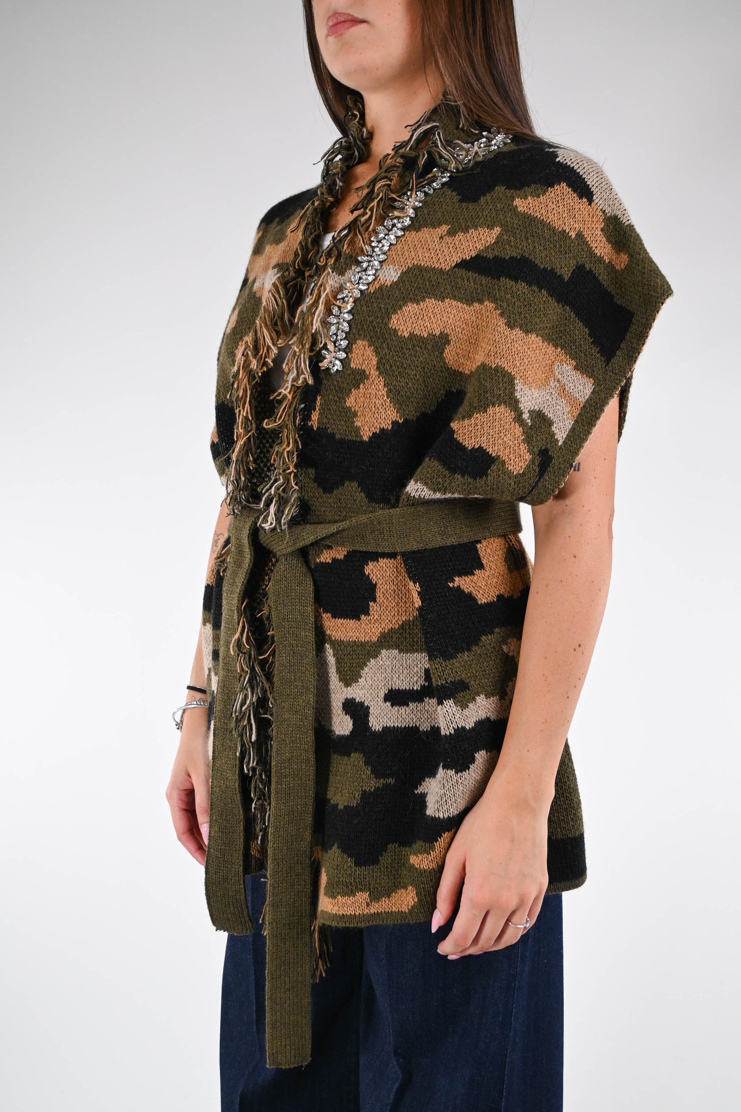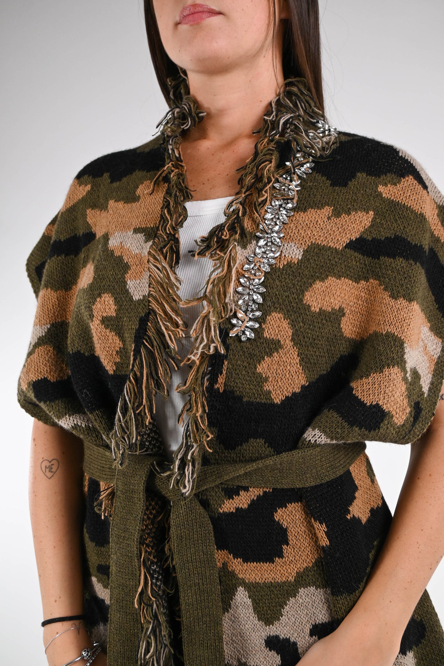 Gilet con frange e cabochon, con cintura, fantasia camouflage.