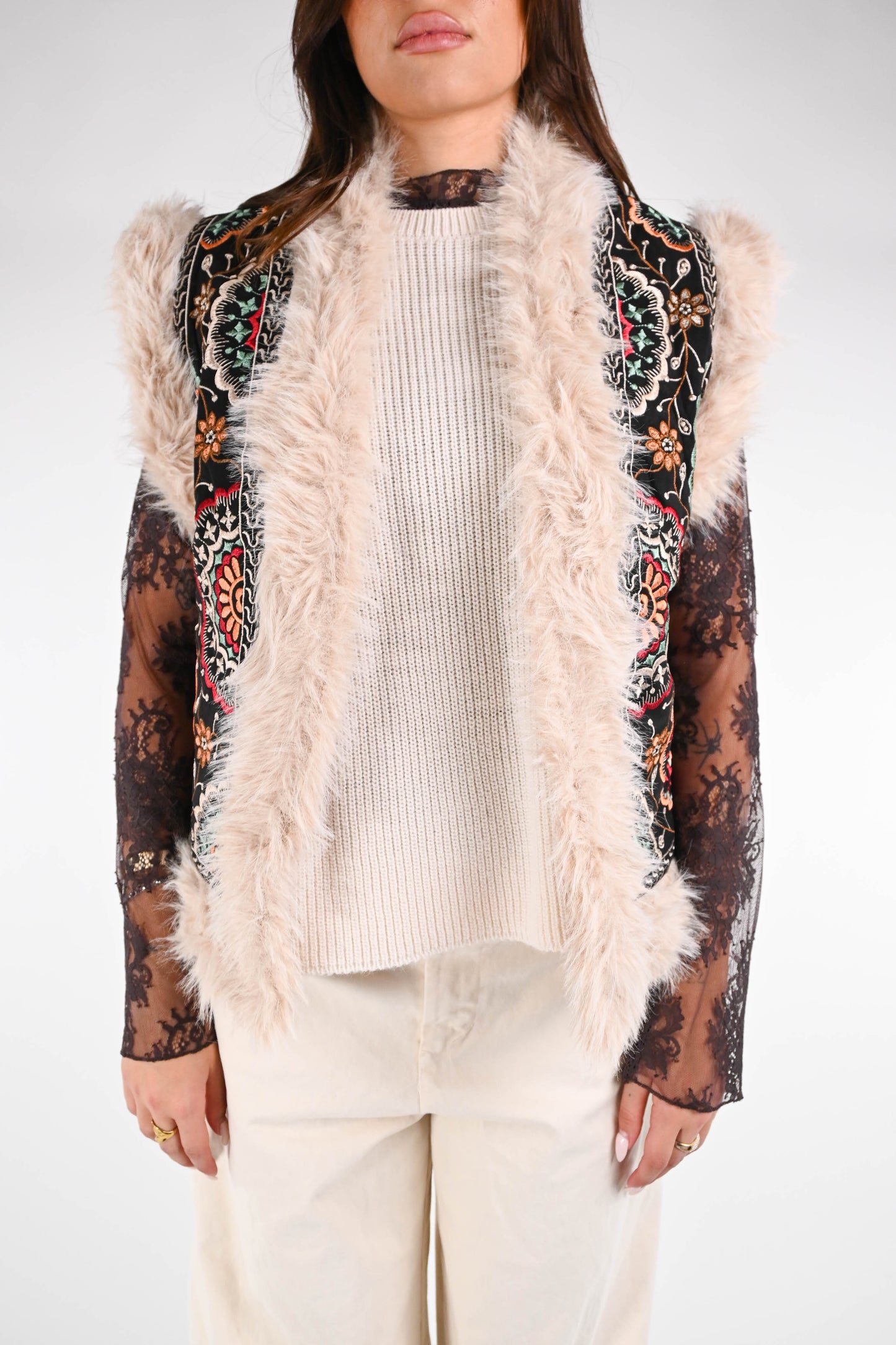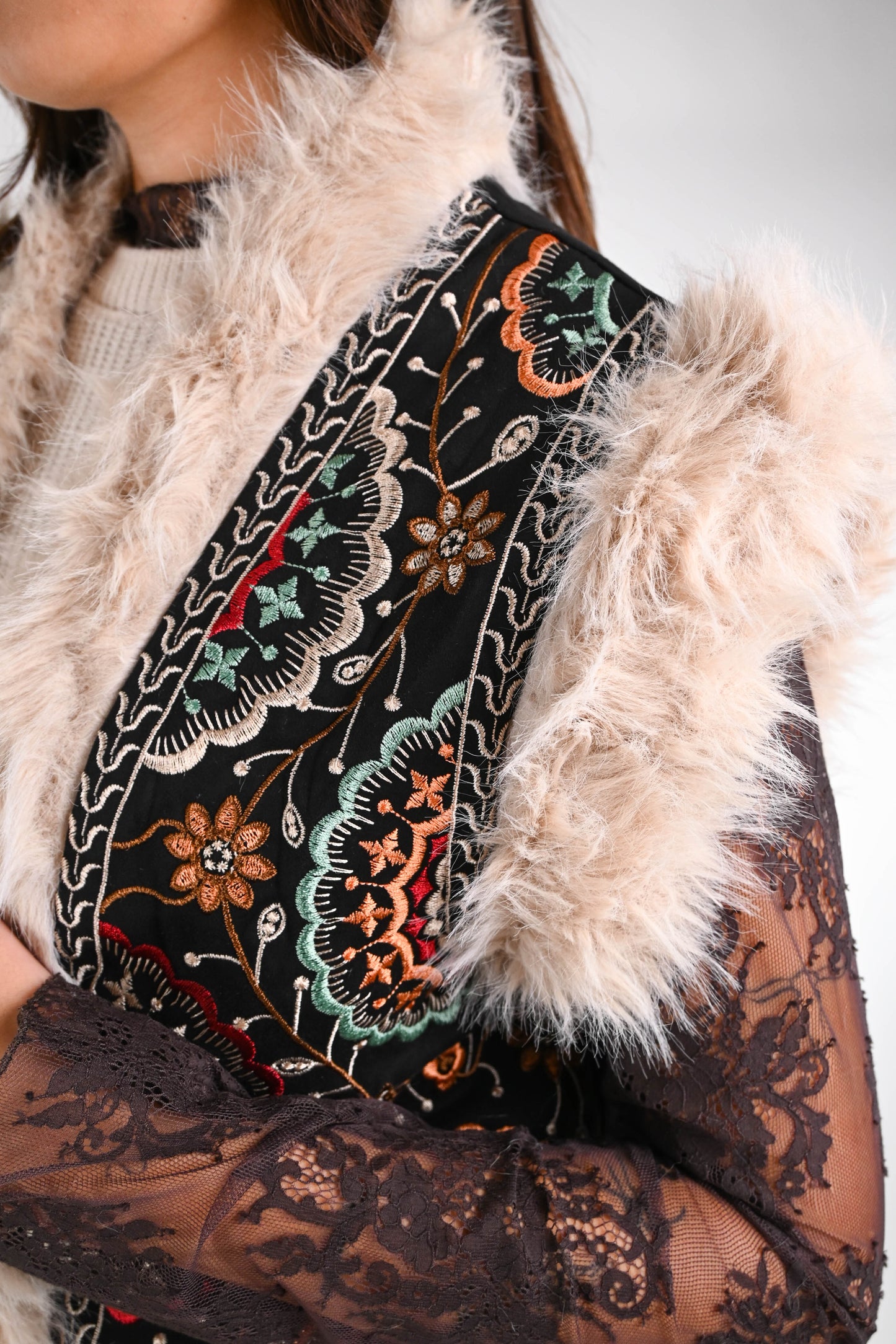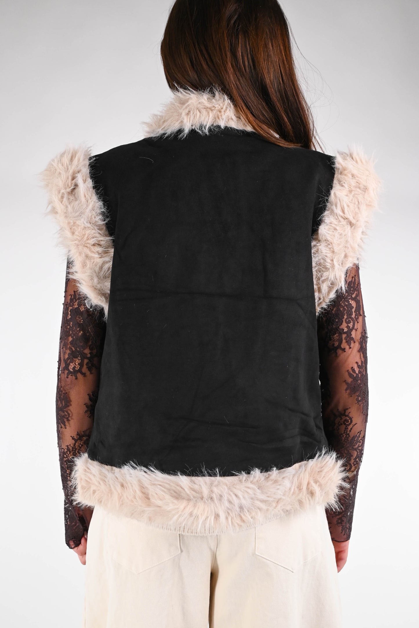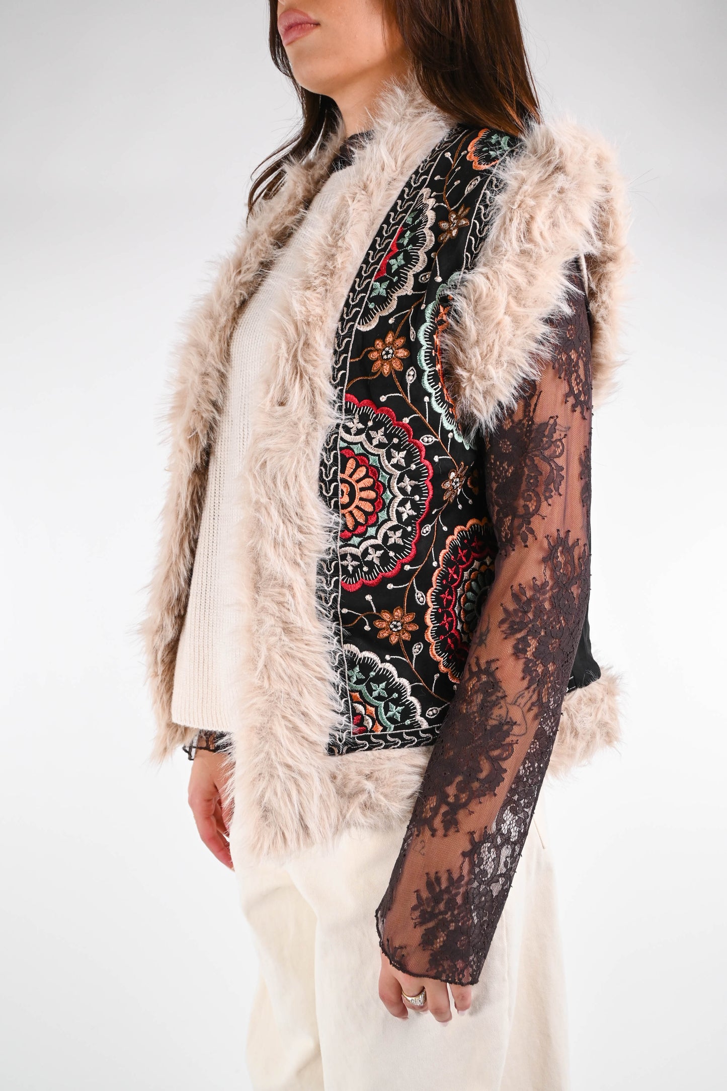 Gilet ecomontone ricamato, con profilo ecopelliccia, trapuntato all'interno, colore nero