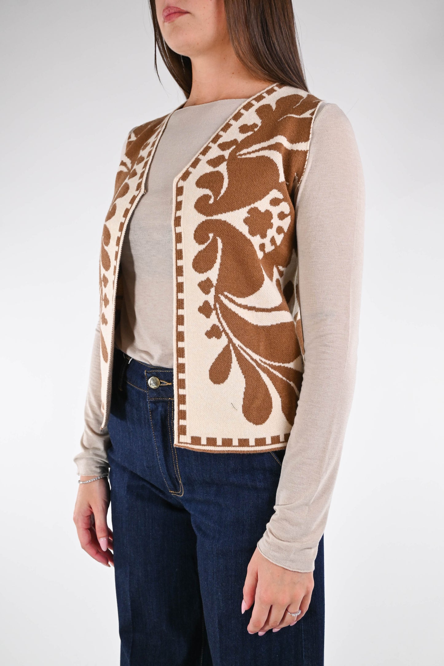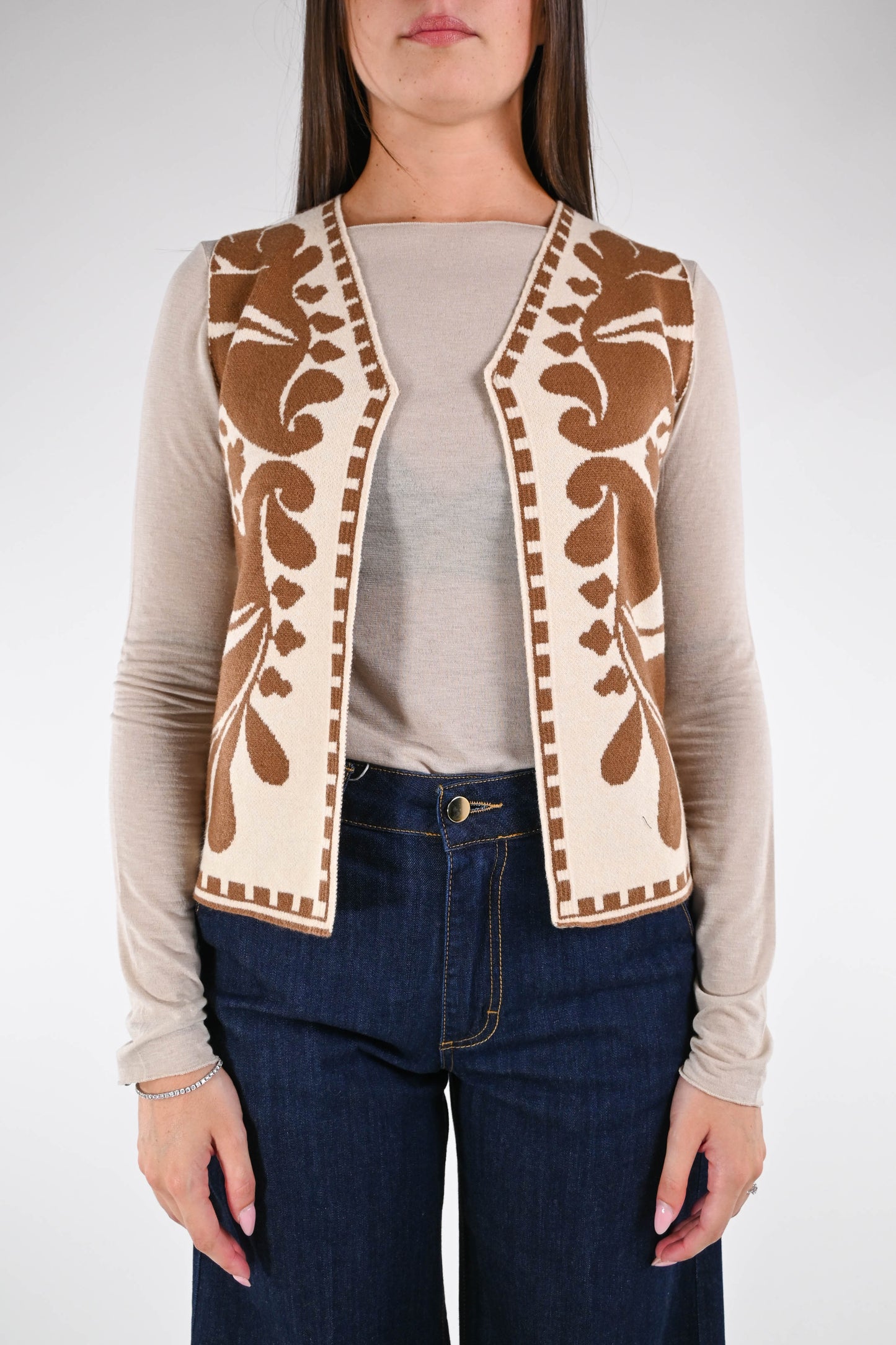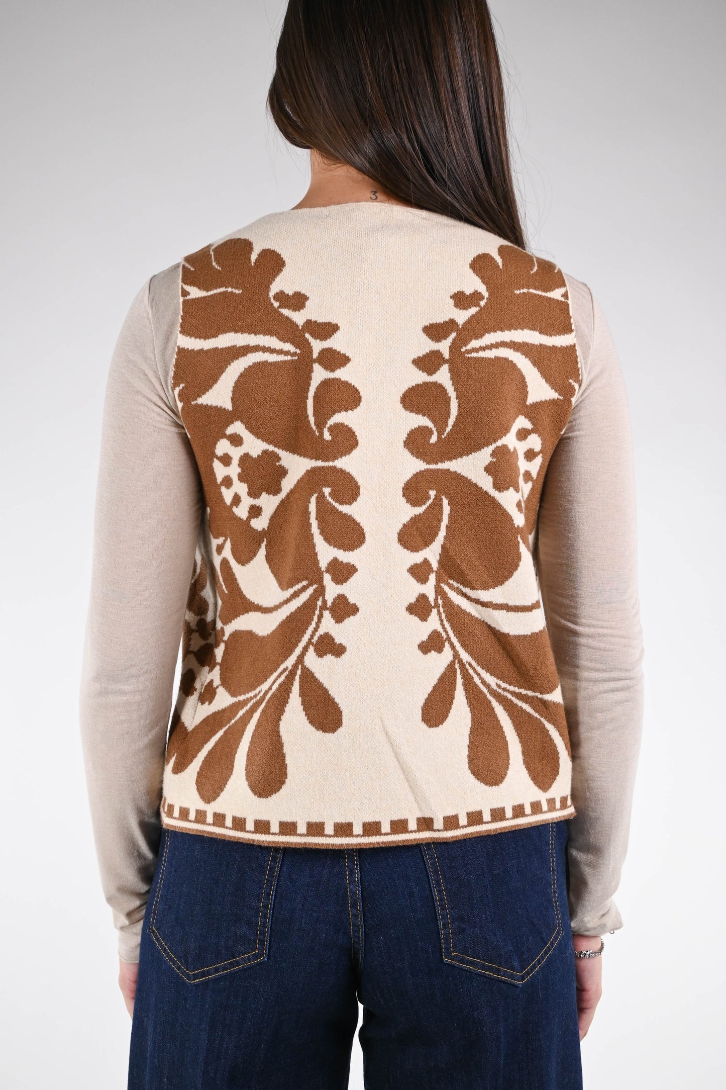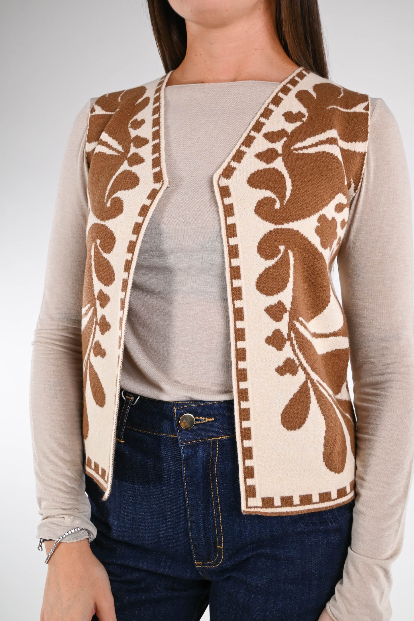 Gilet in maglia, con chiusura gancetto, elasticizzato, fantasia damascato, color cammello/burro.