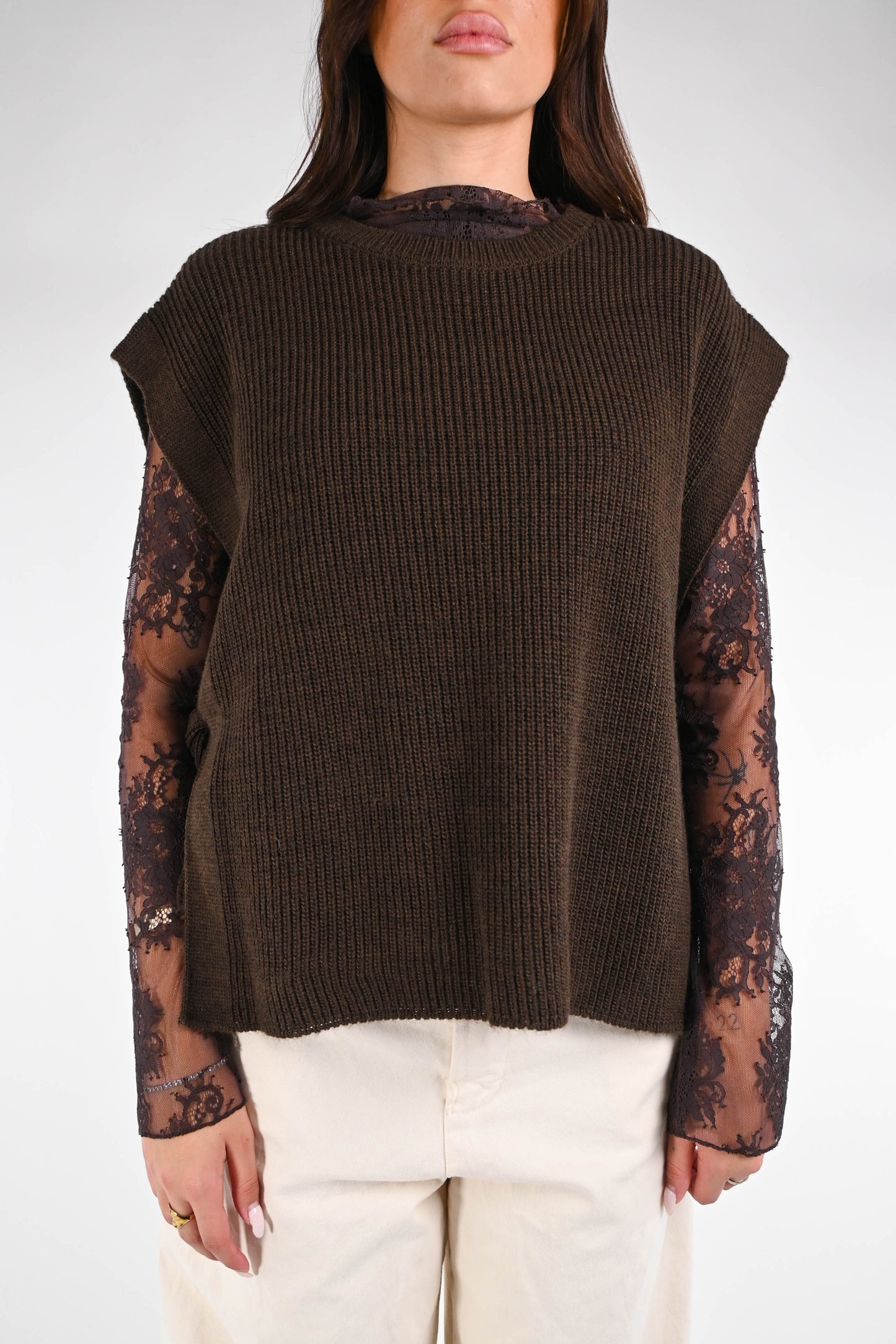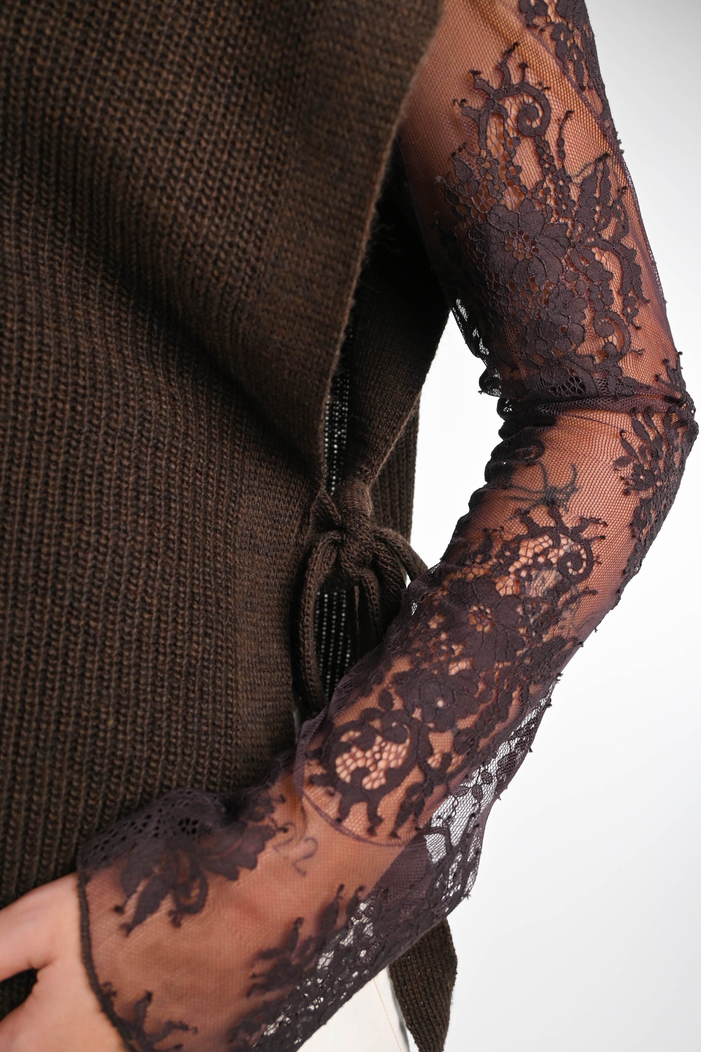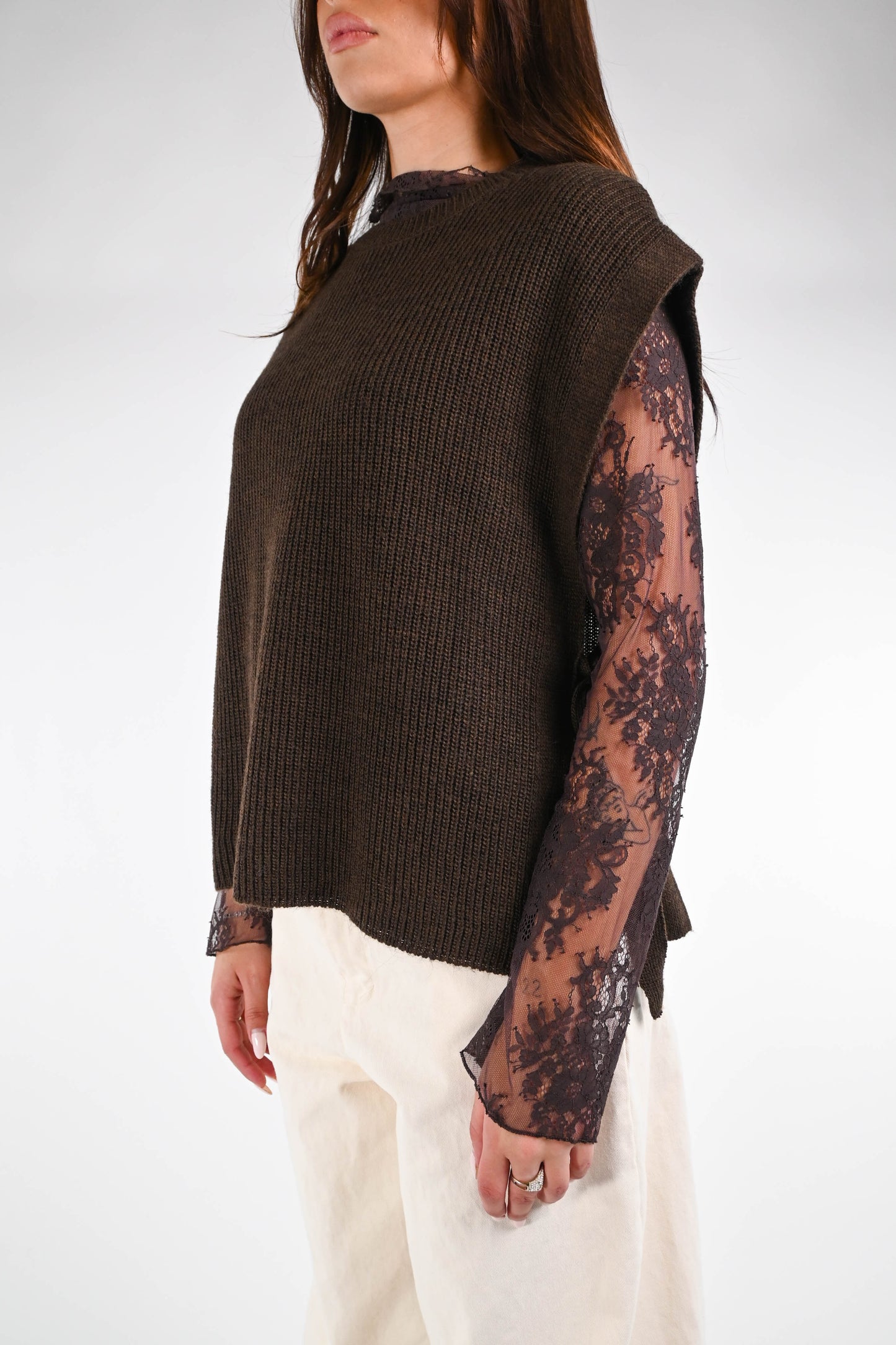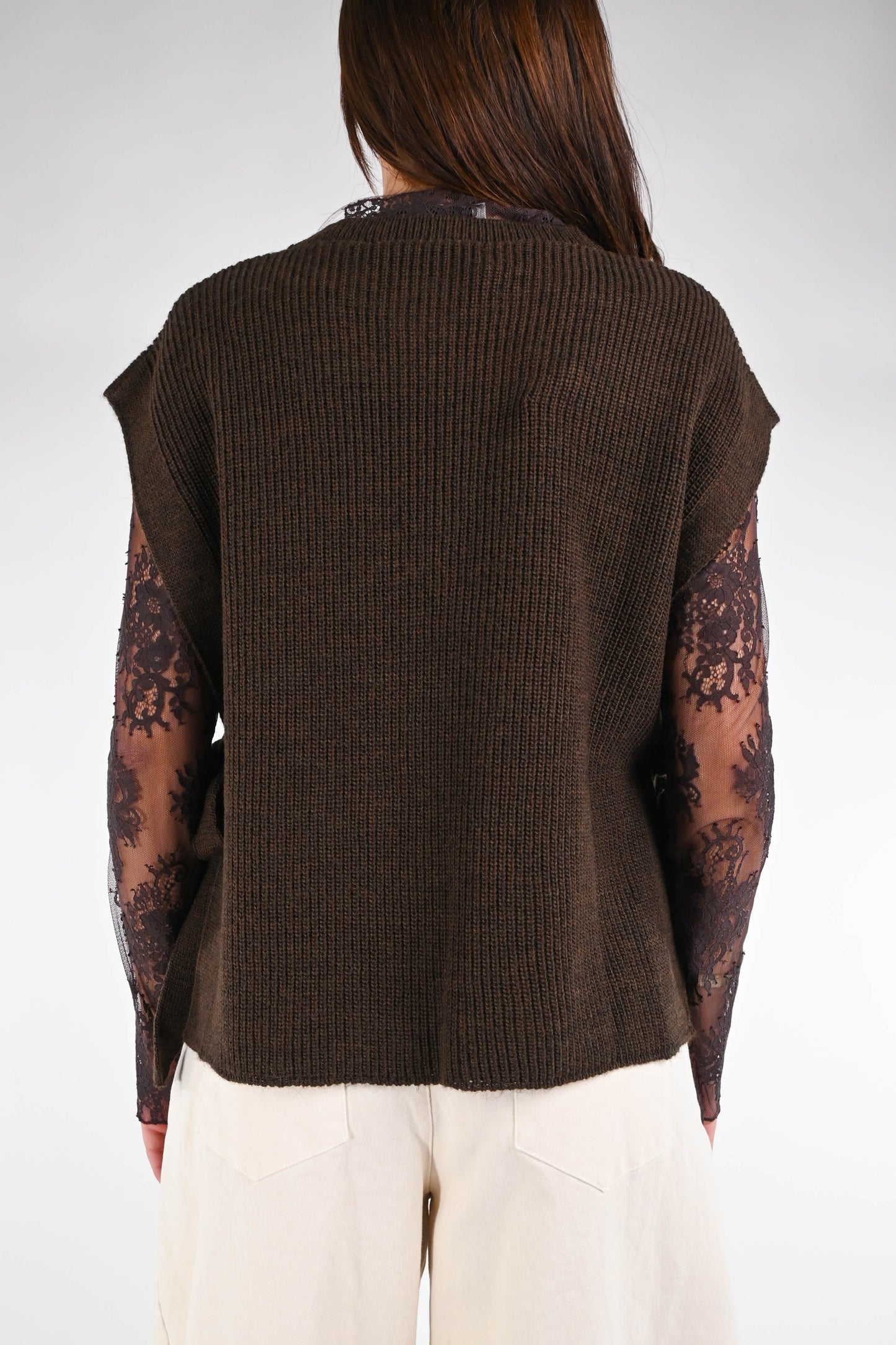Gilet in maglia costa inglese con fiocchi laterali, girocollo, color moro