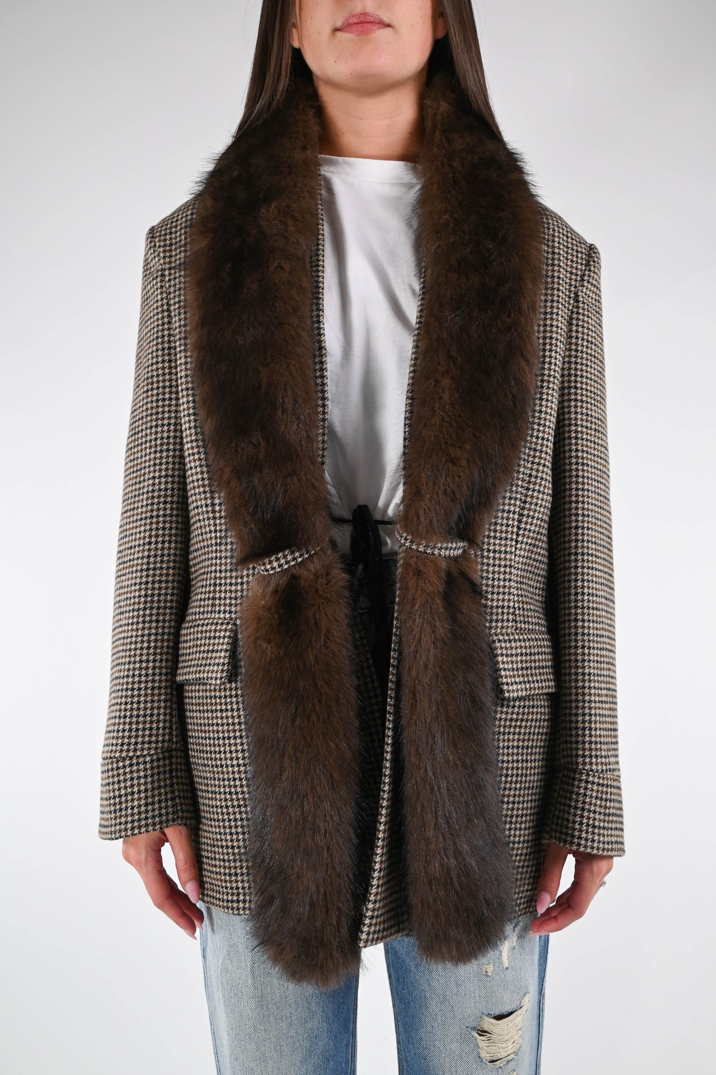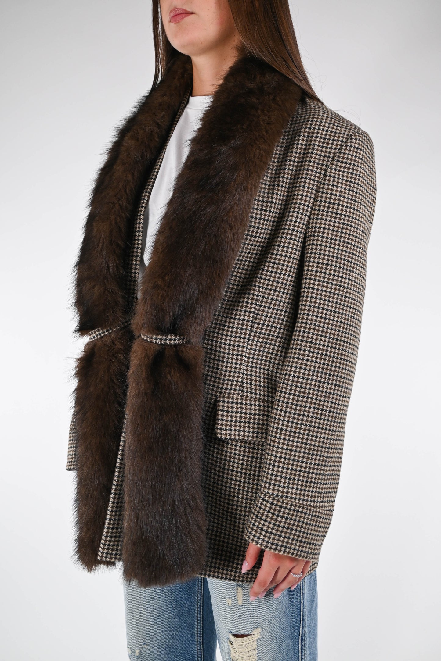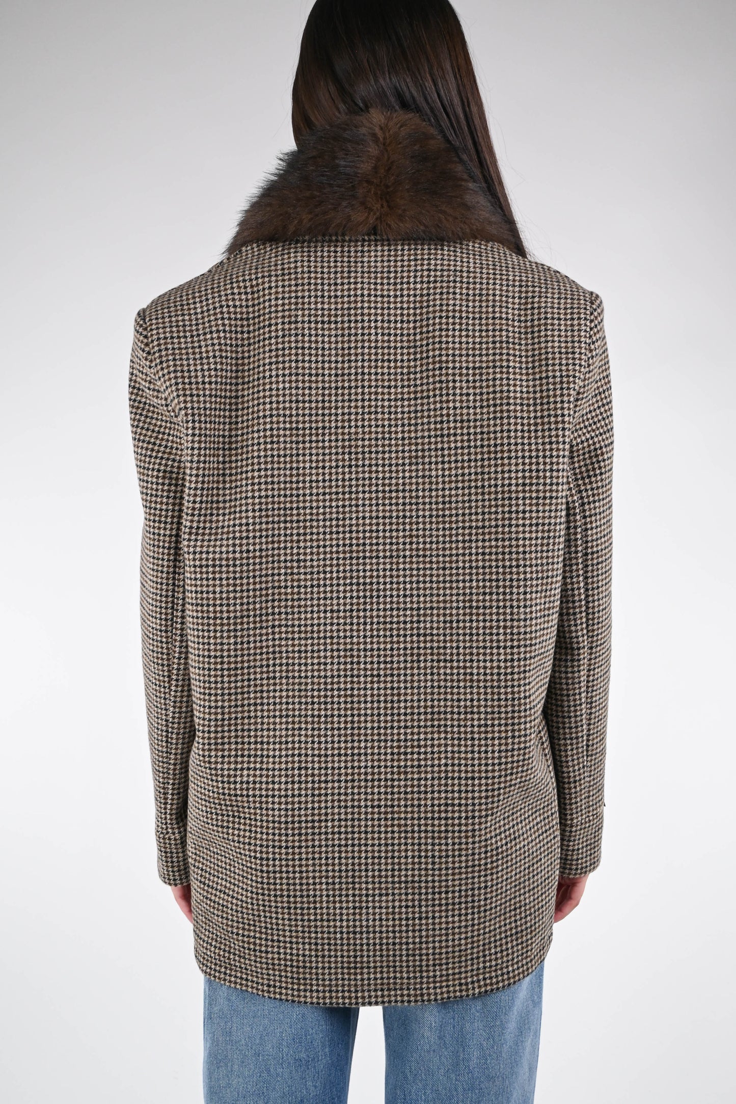 MOTEL - GIACCA PIED DI POULE CON COLLO ECOPELLICCIA ART. W25J522 - BEIGE/TABACCO
