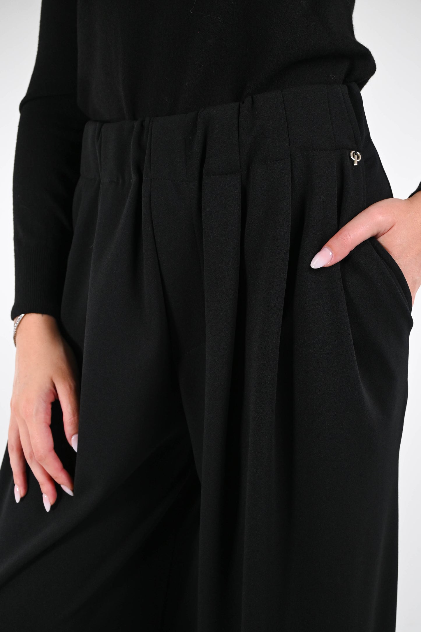Pantalone palazzo in crepe elasticizzato, con pence in vita, con elastico e coulisse, con elastico, colore nero.