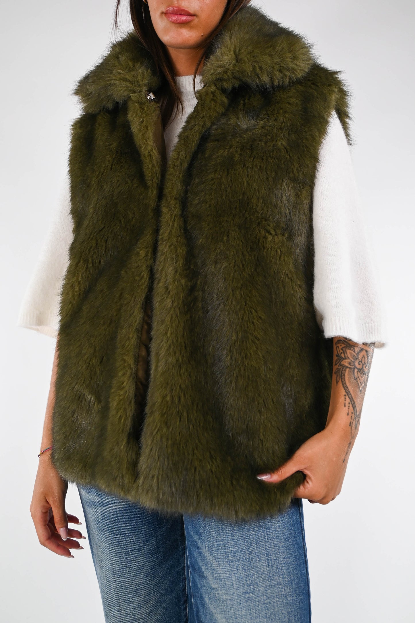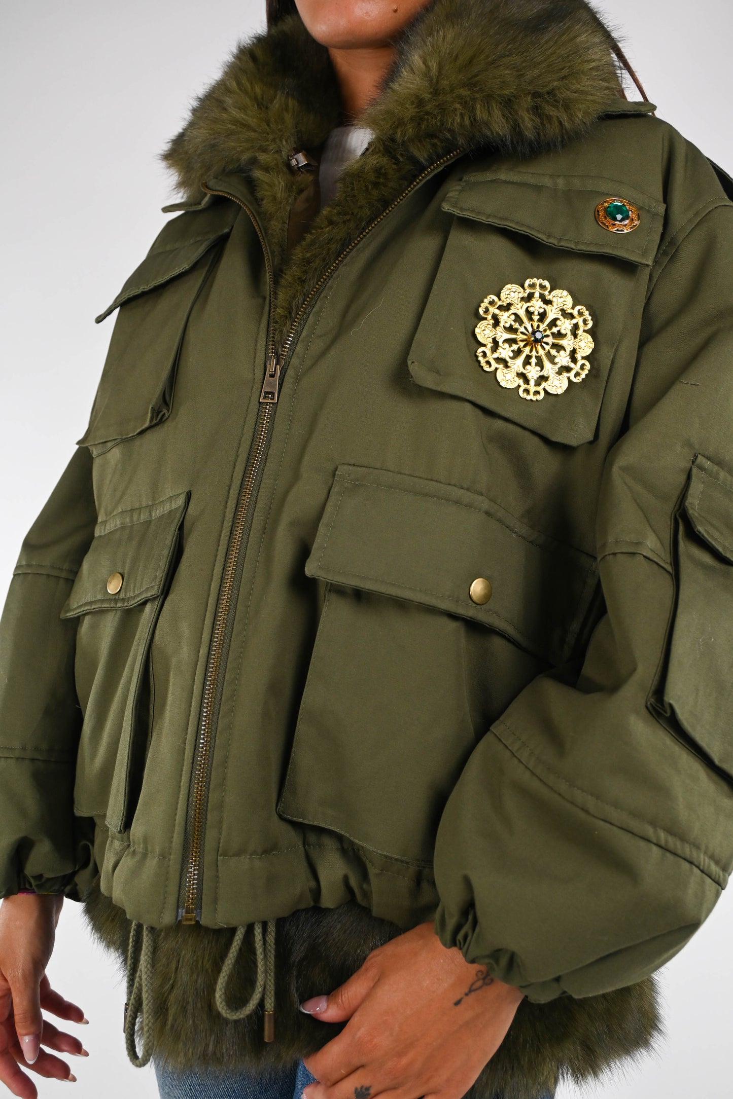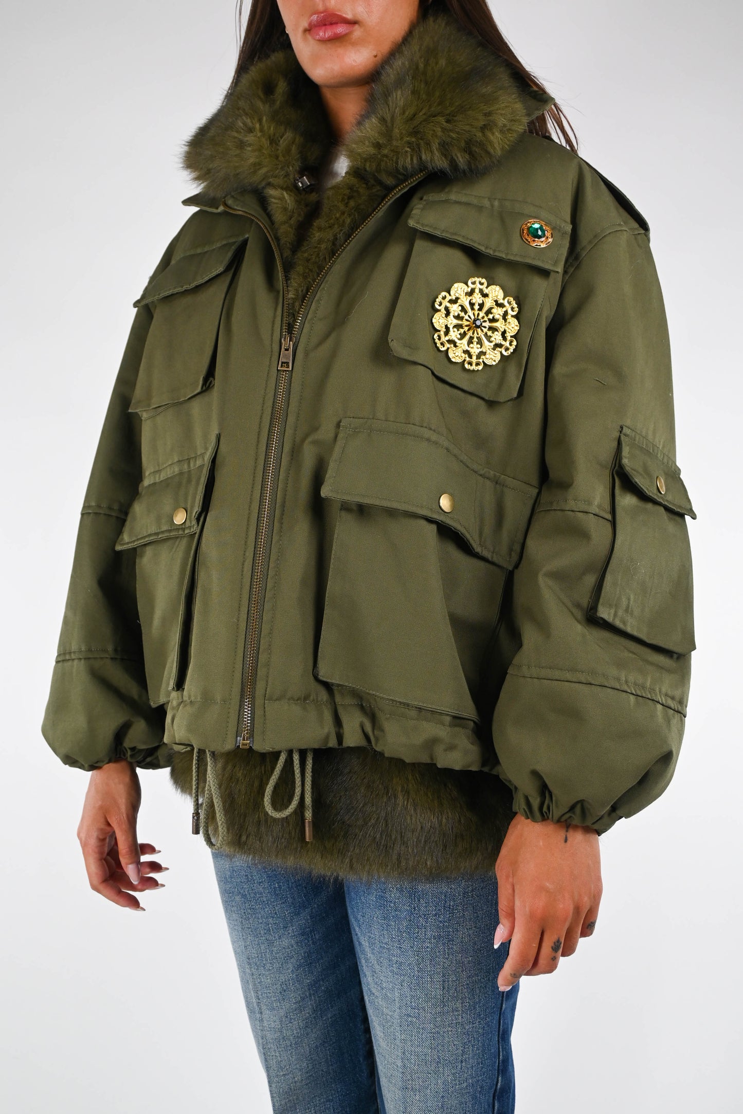 Parka + gilet in ecopelliccia, con tasche applicate e spille, con manica e fondo arricciati, color militare, il gilet in ecopelliccia è foderato, con gancetti a chiusura, color moro