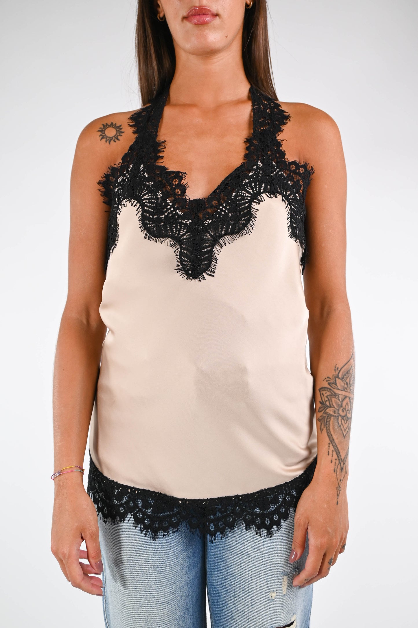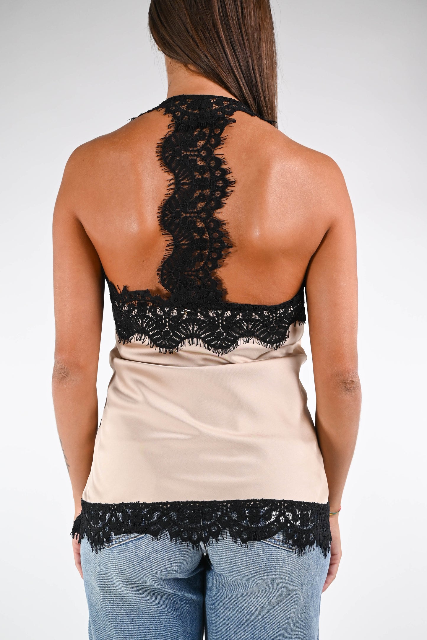 Top con spallina, con pizzo, scollo americana, colore Champagne.