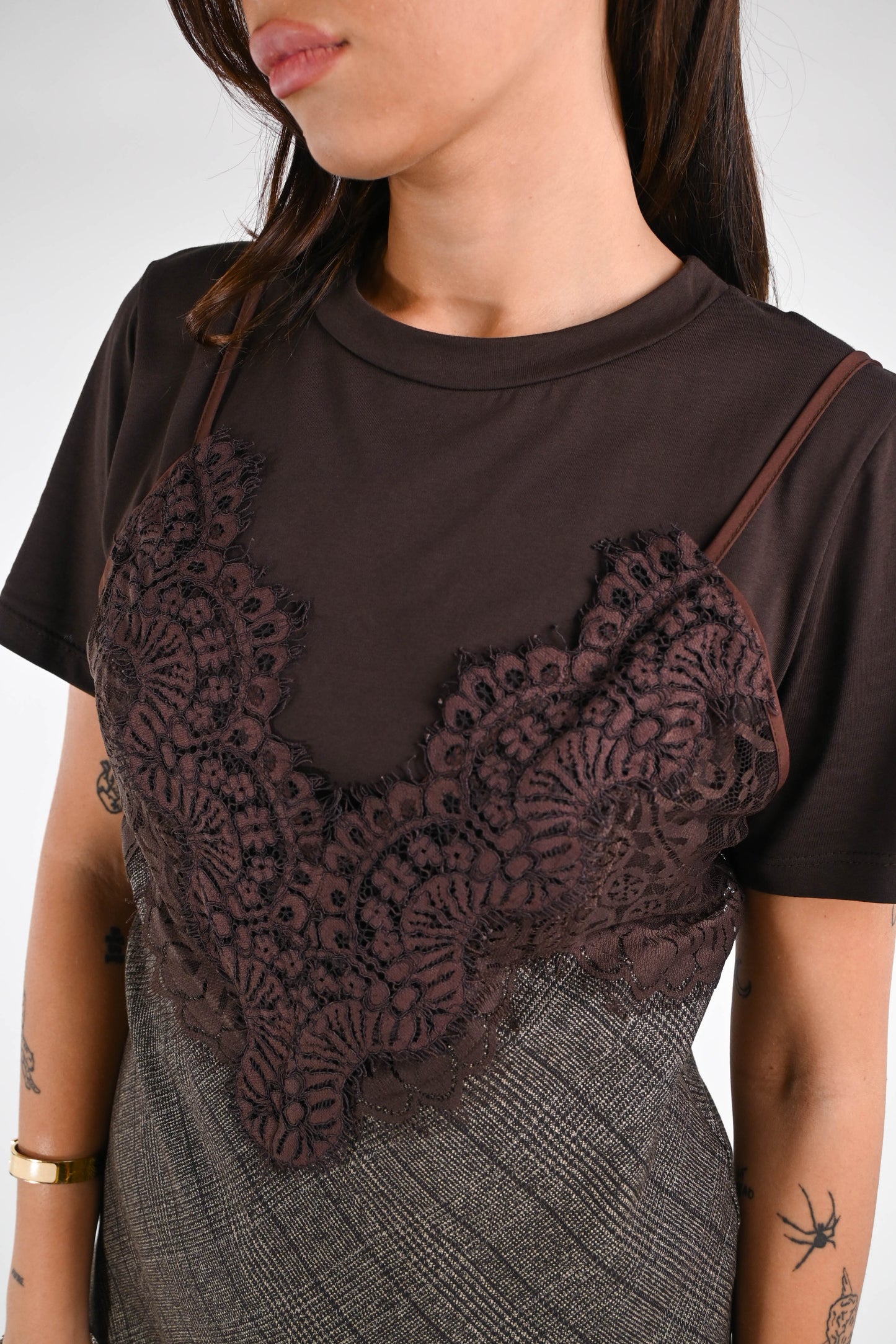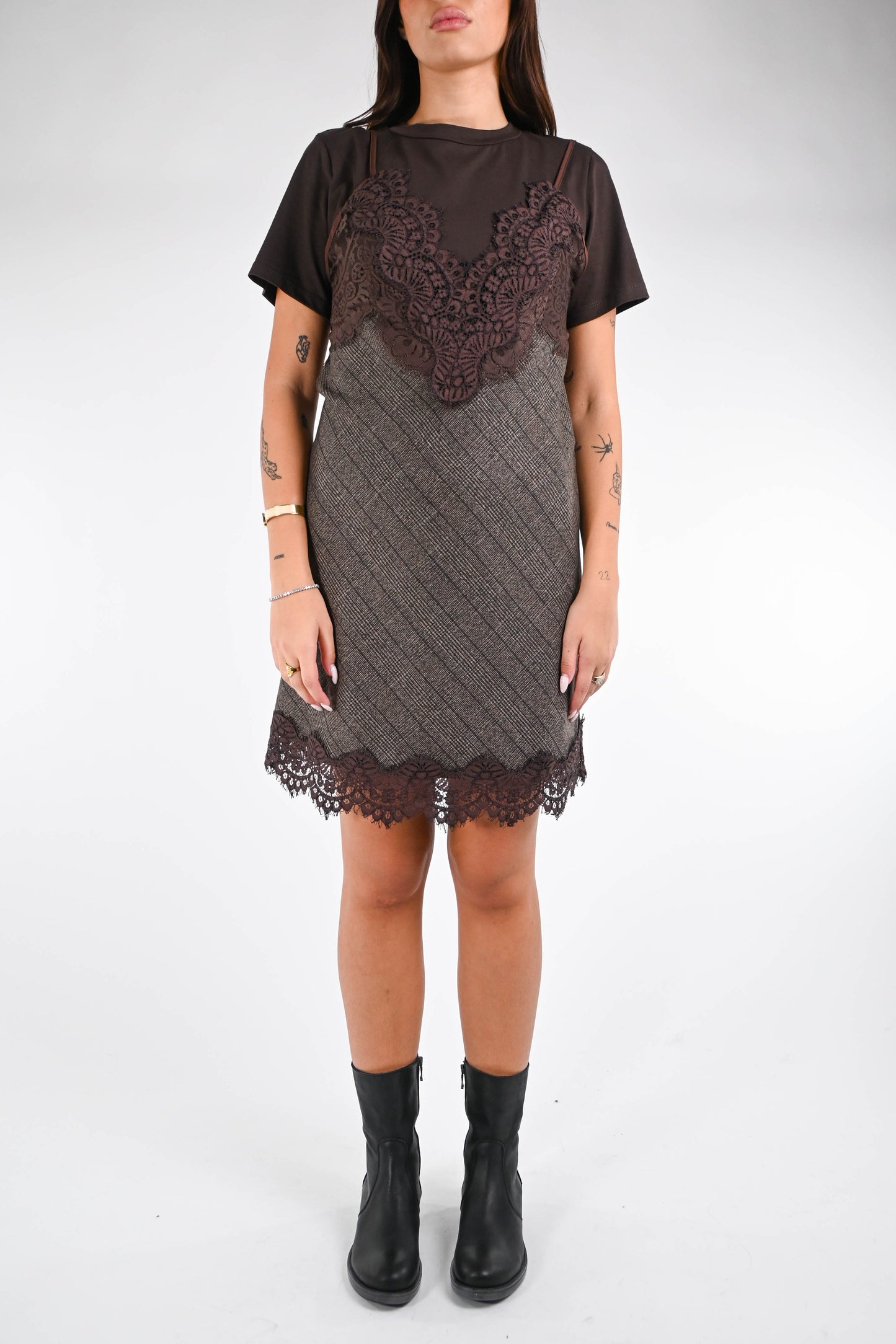 Abito + t-shirt removibile, fantasia check, con pizzo, colore moro.