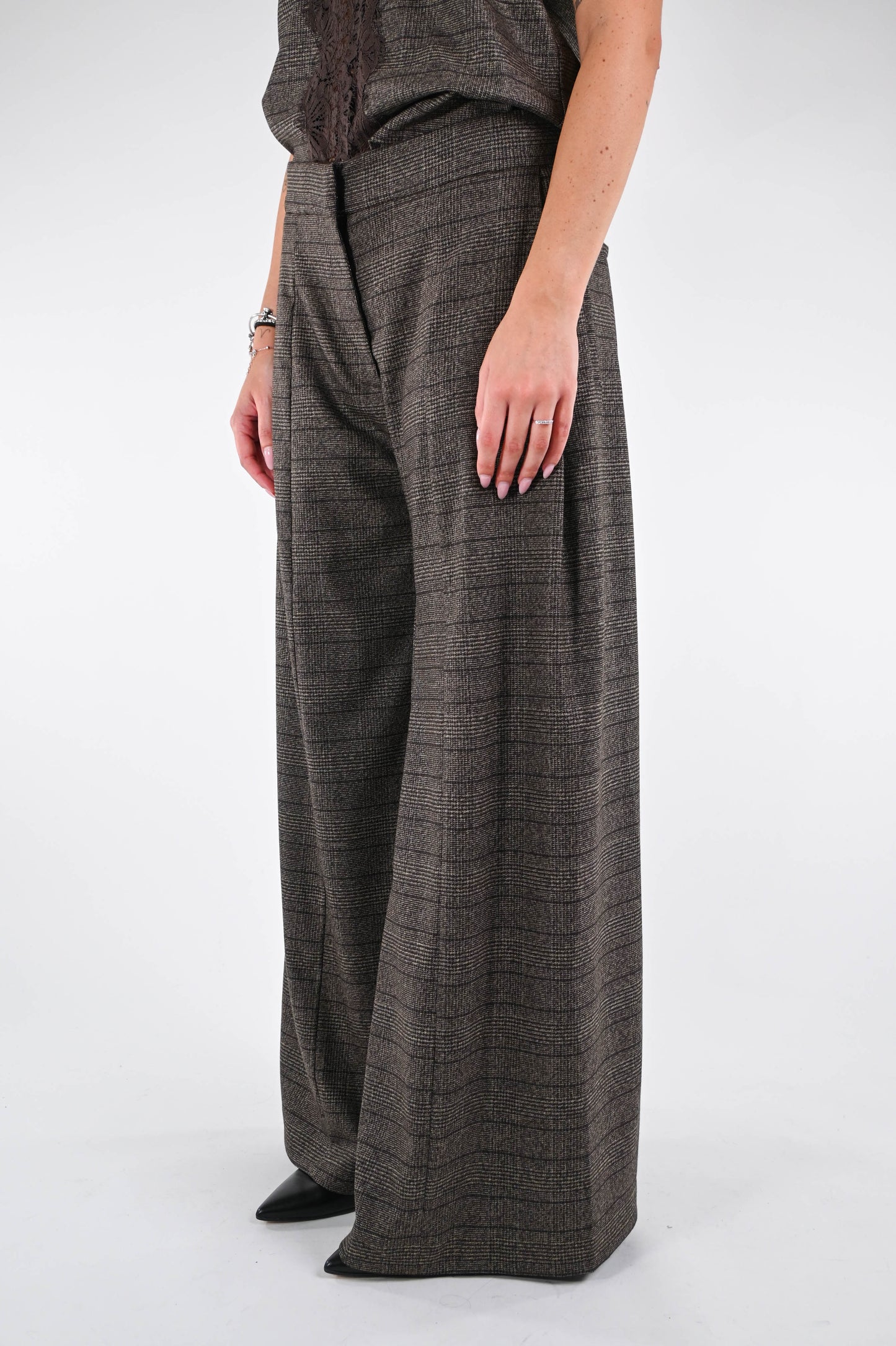Pantalone check a palazzo, con pinces davanti, con tasca a filo, colore moro