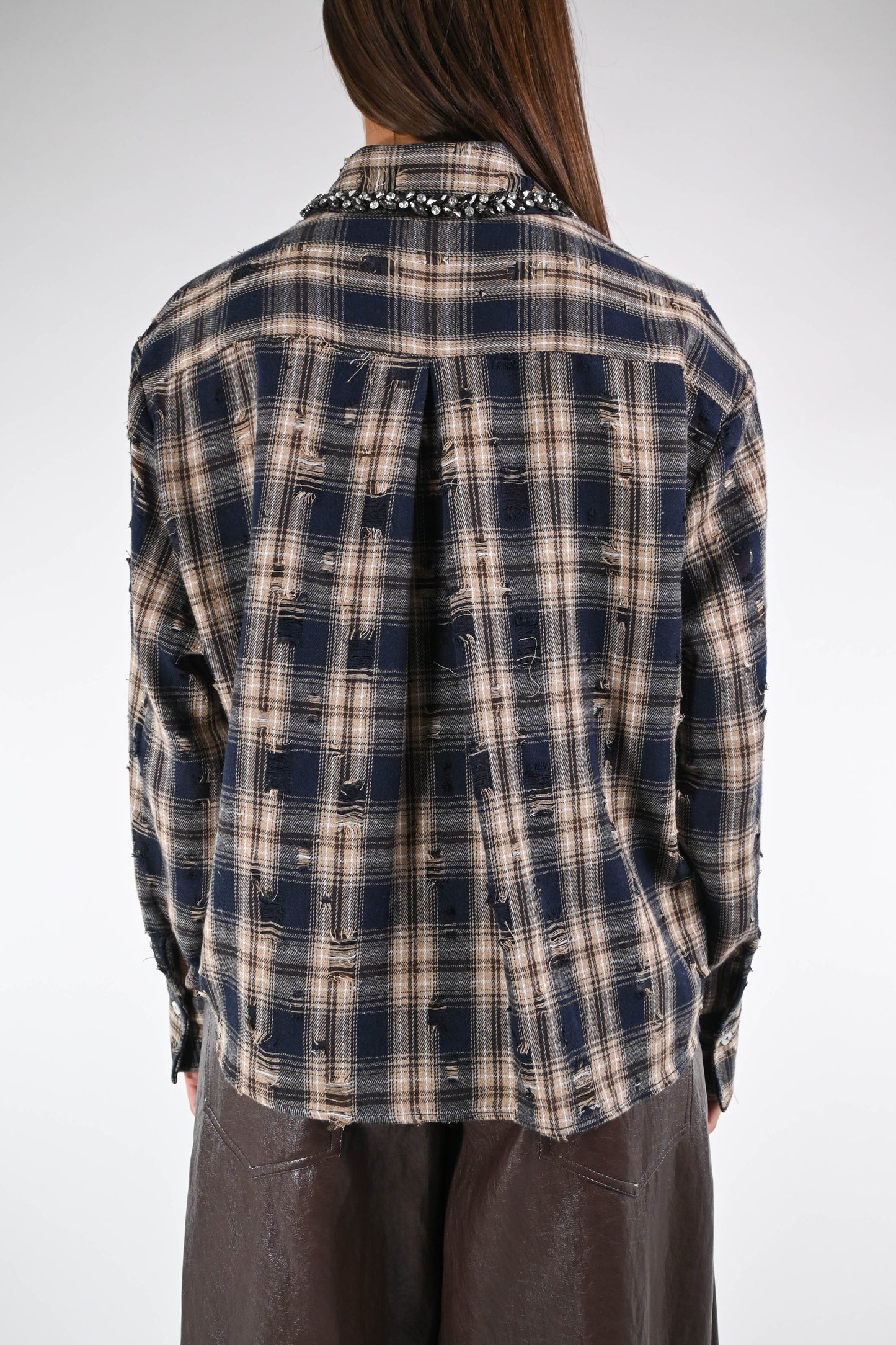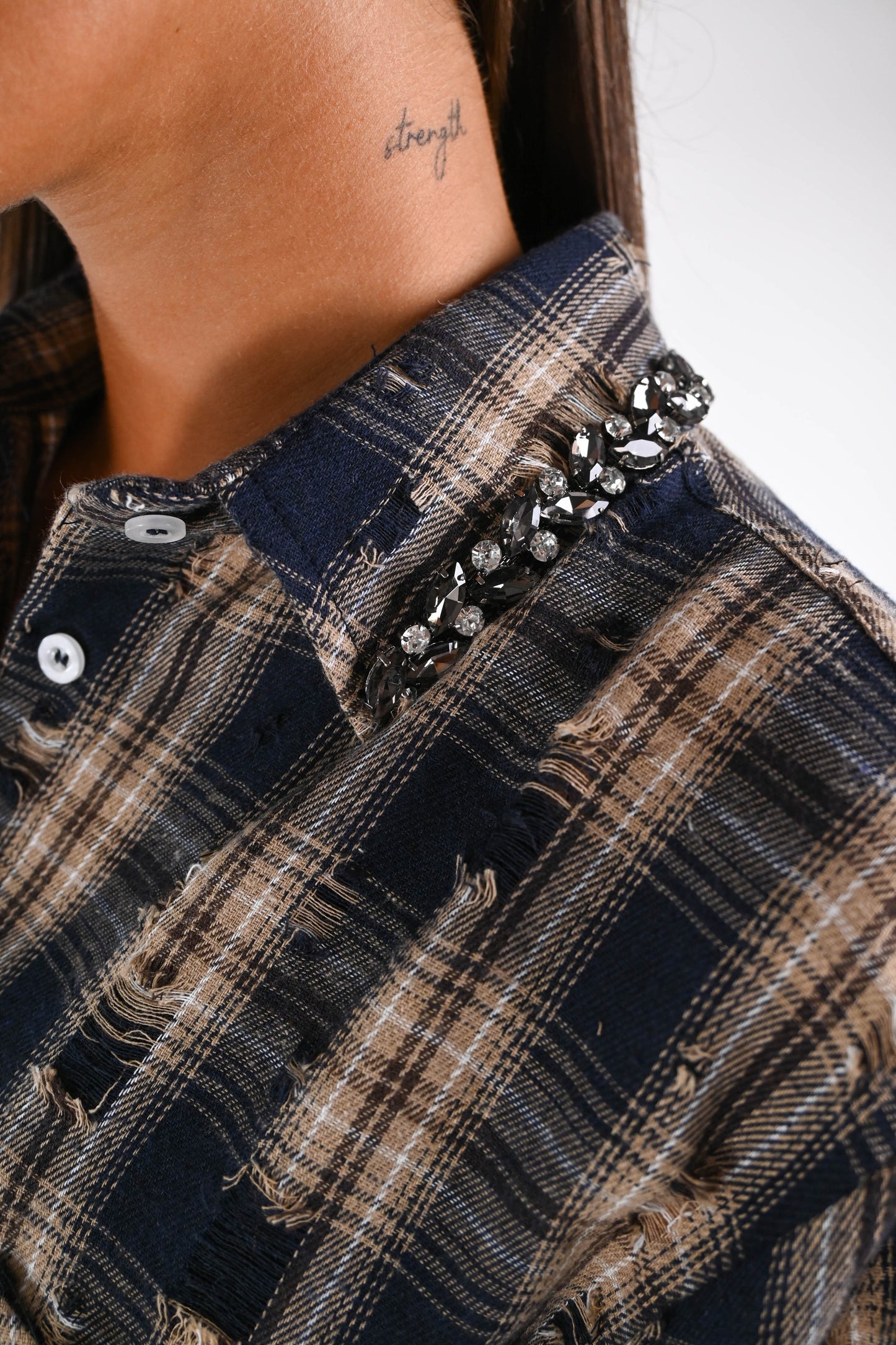 Camicia scozzese con colletto, con applicazioni cabochon, rotture handmade, colore Blu/Beige.