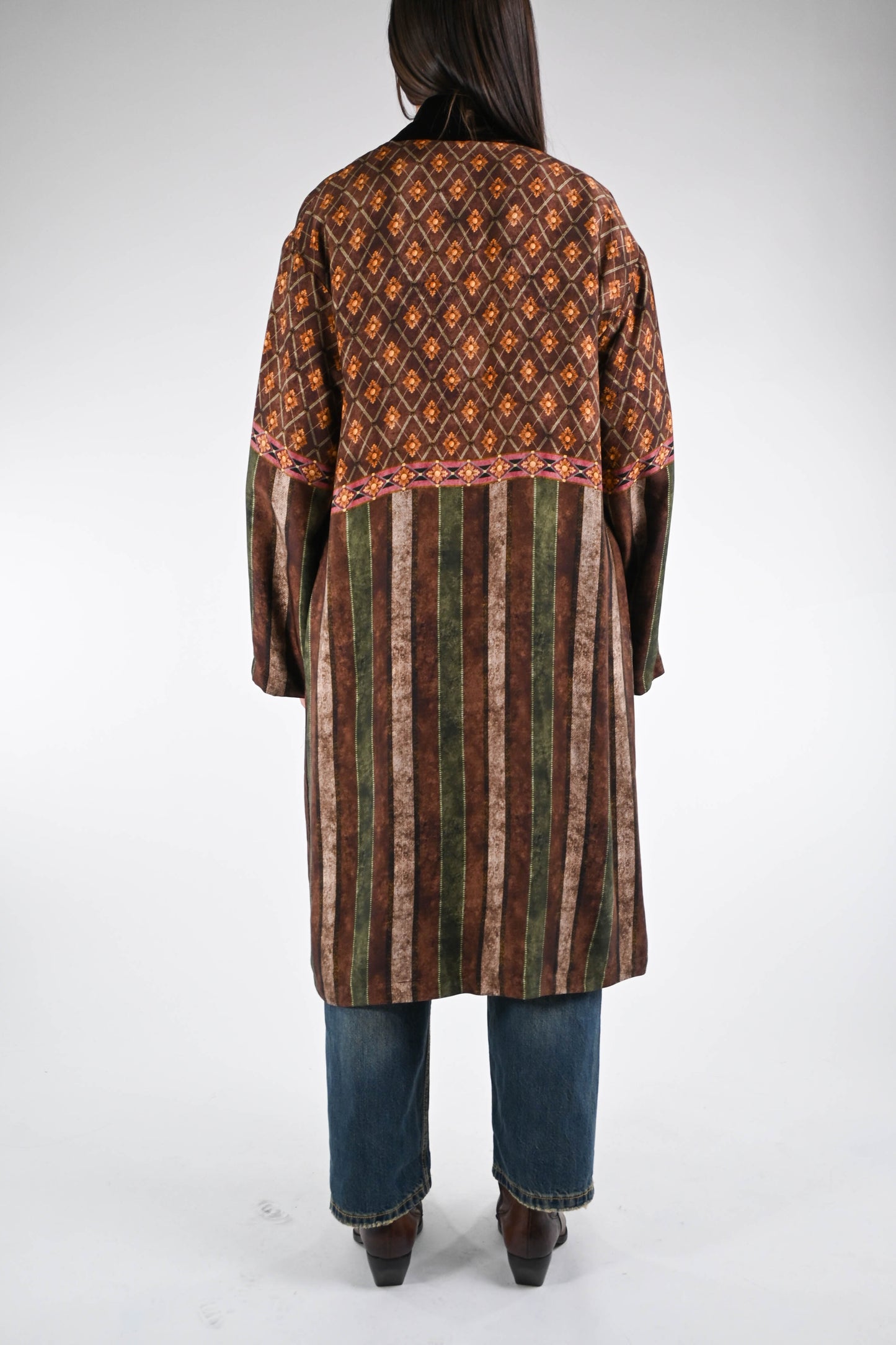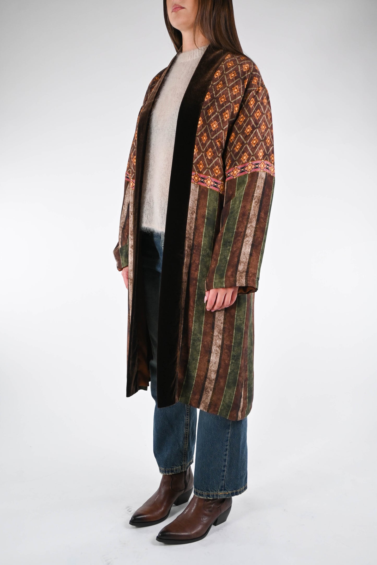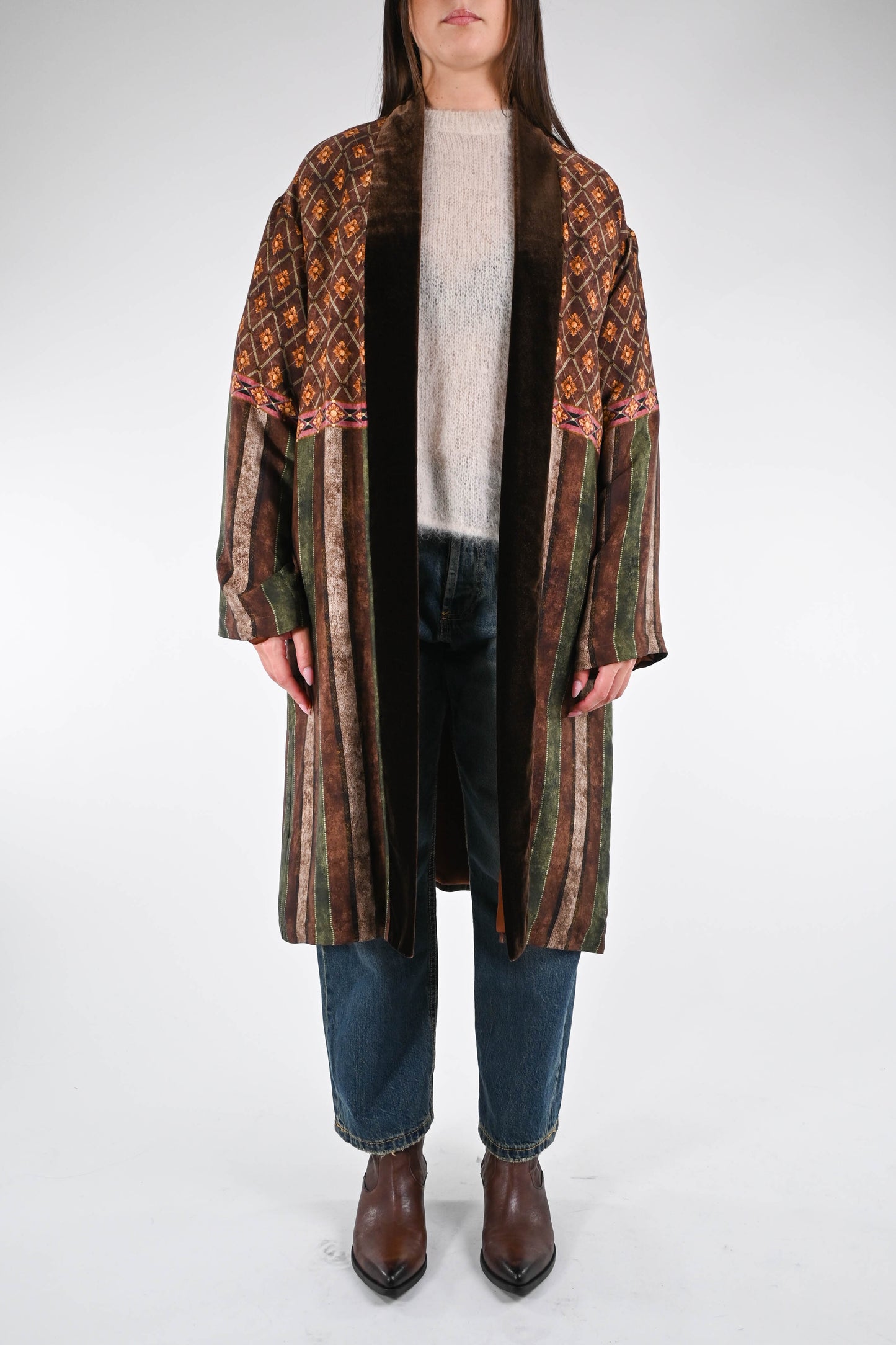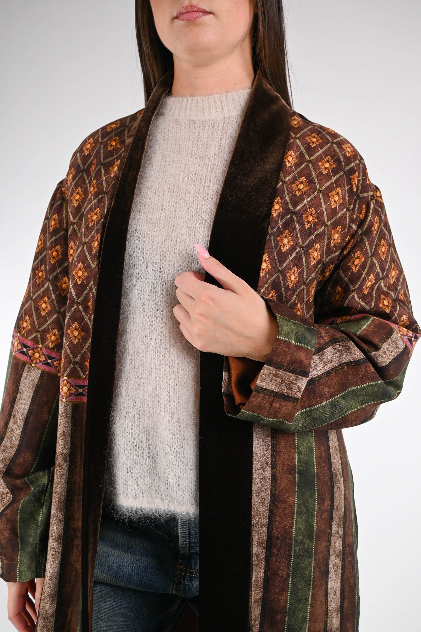 Kimono lungo, fantasia floreale/gessata, con profili in velluto liscio, con fodera tinta unita, con tasche, color moro