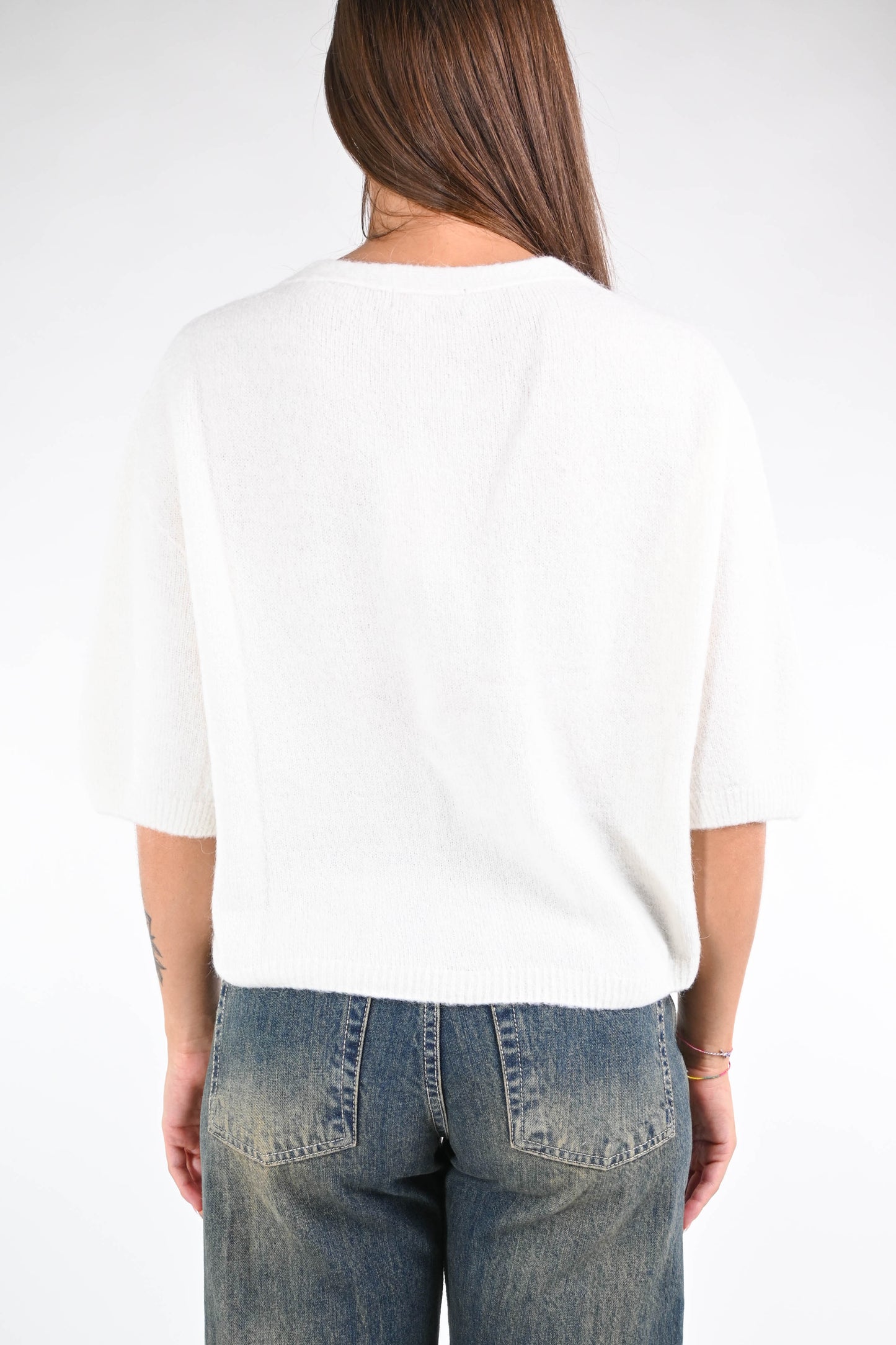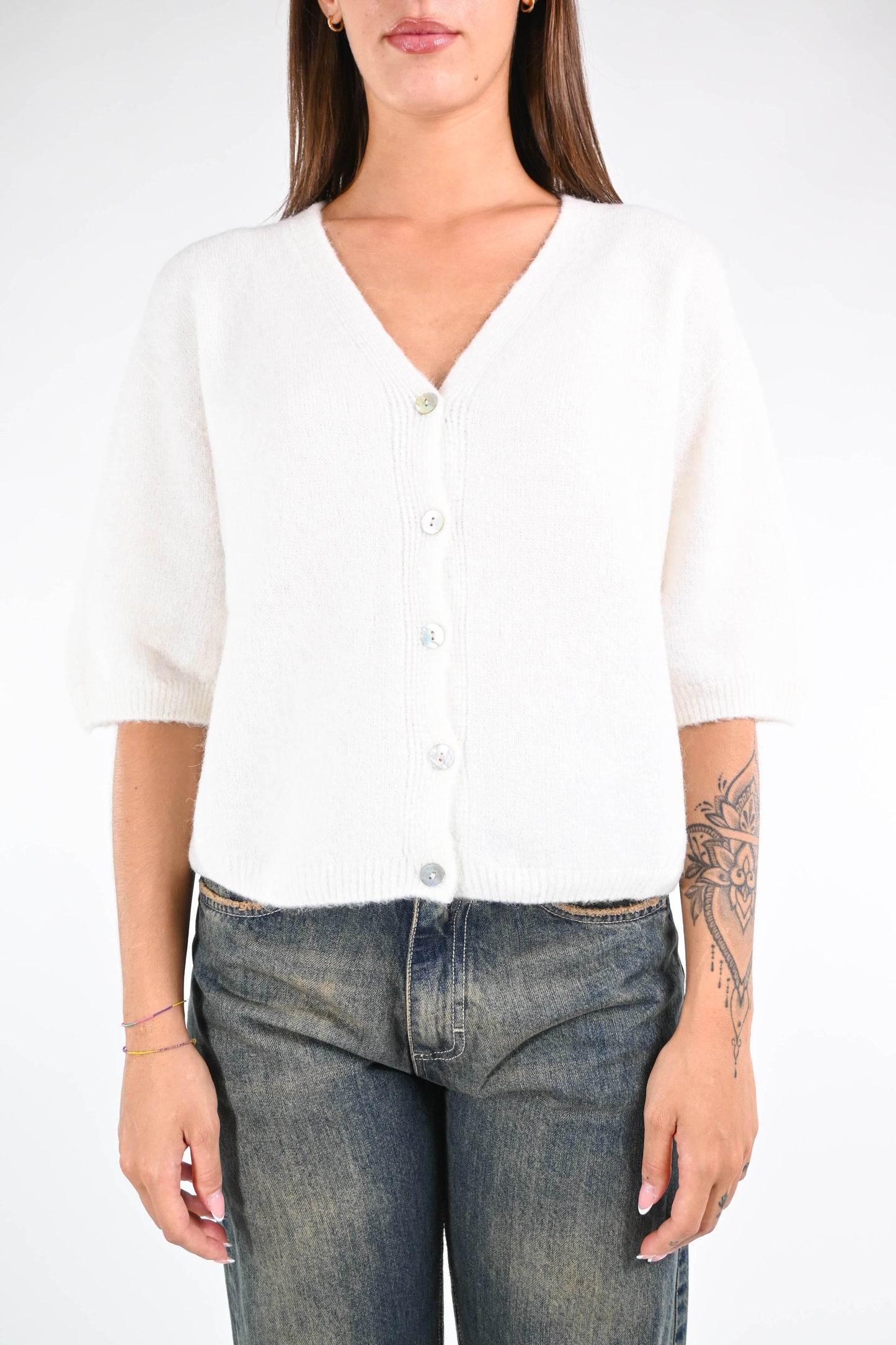 Cardigan over in baby alpaca, mezza mica con spalla scesa, bottoni madreperla, color Panna.