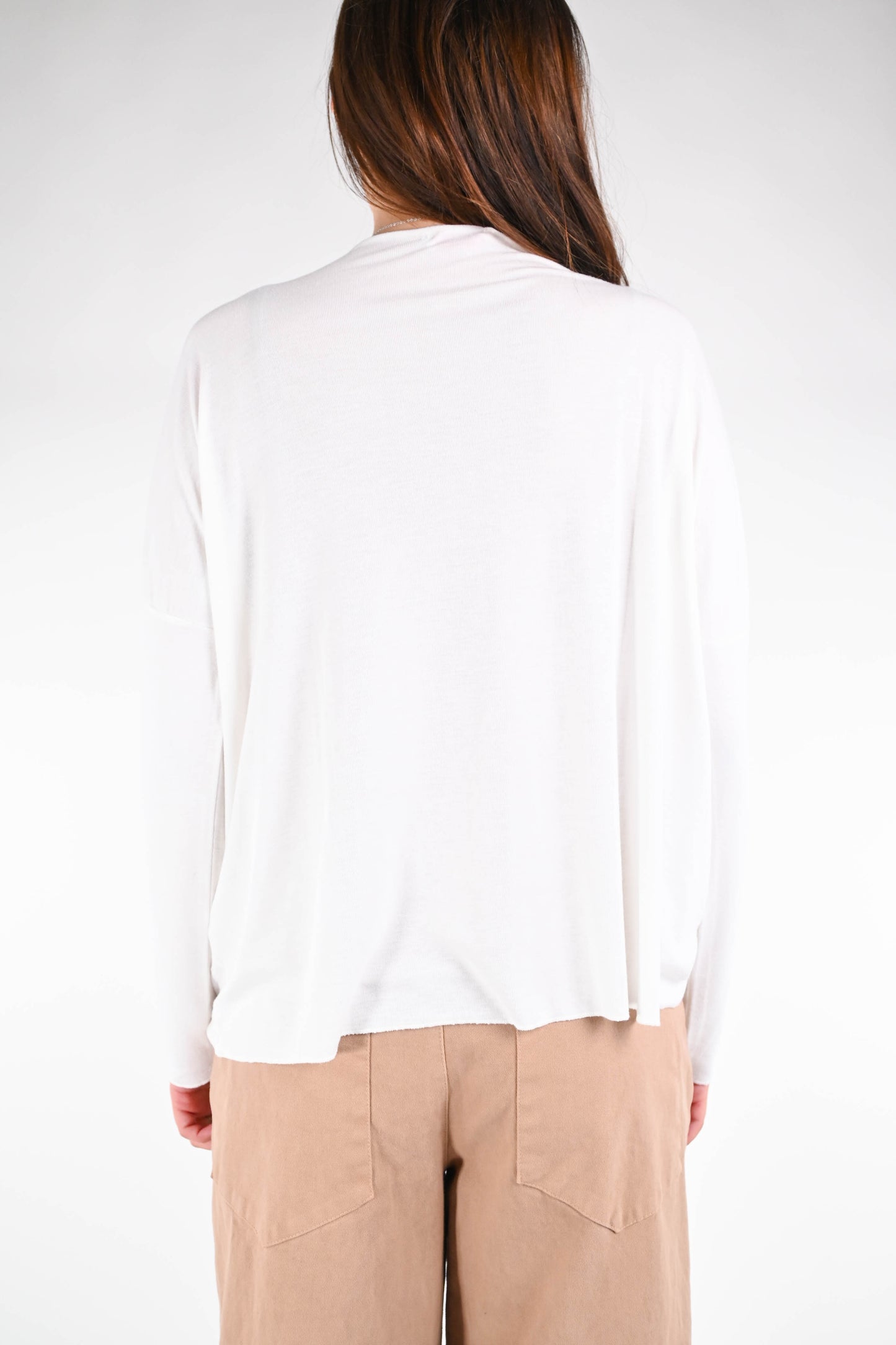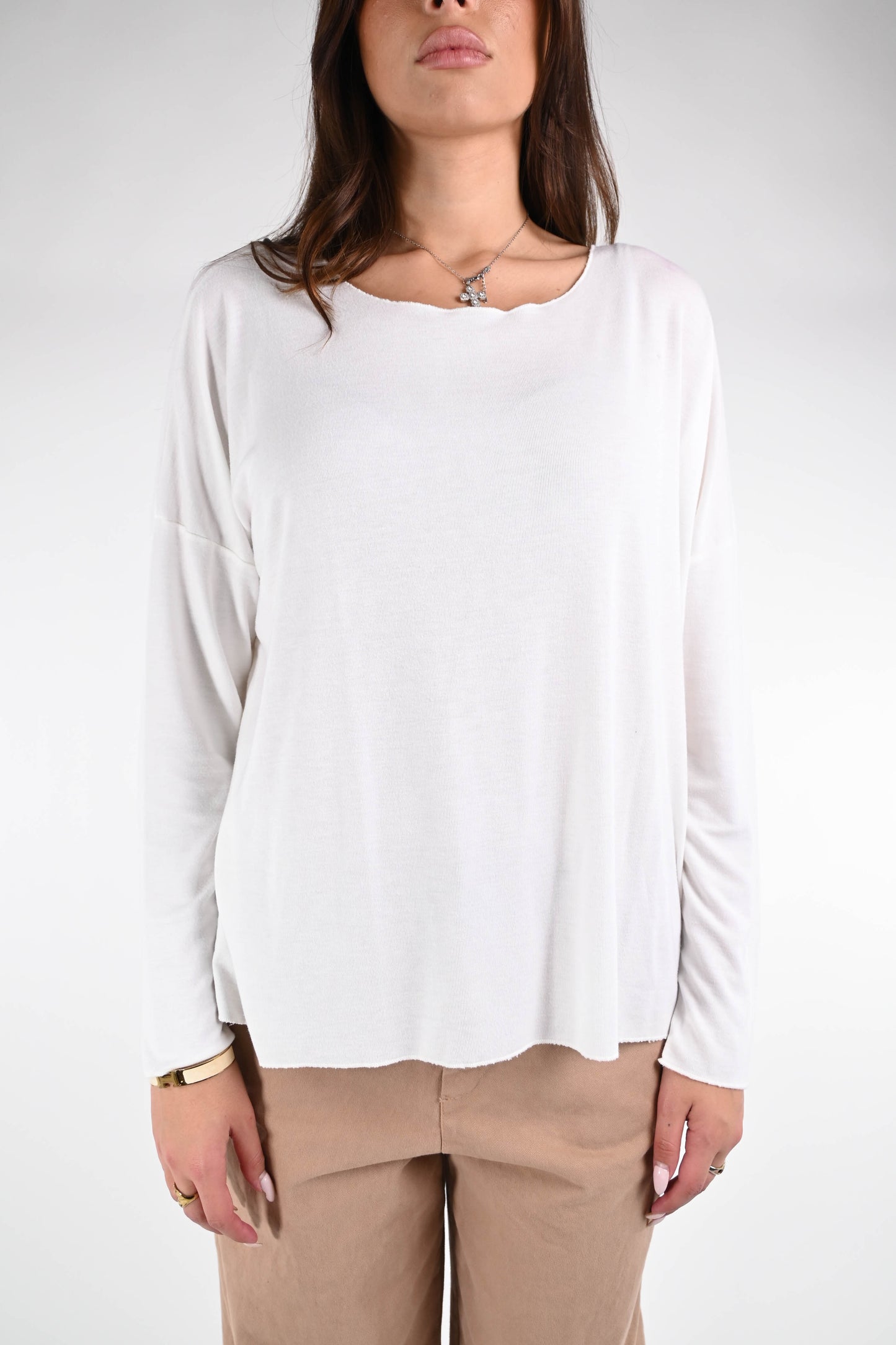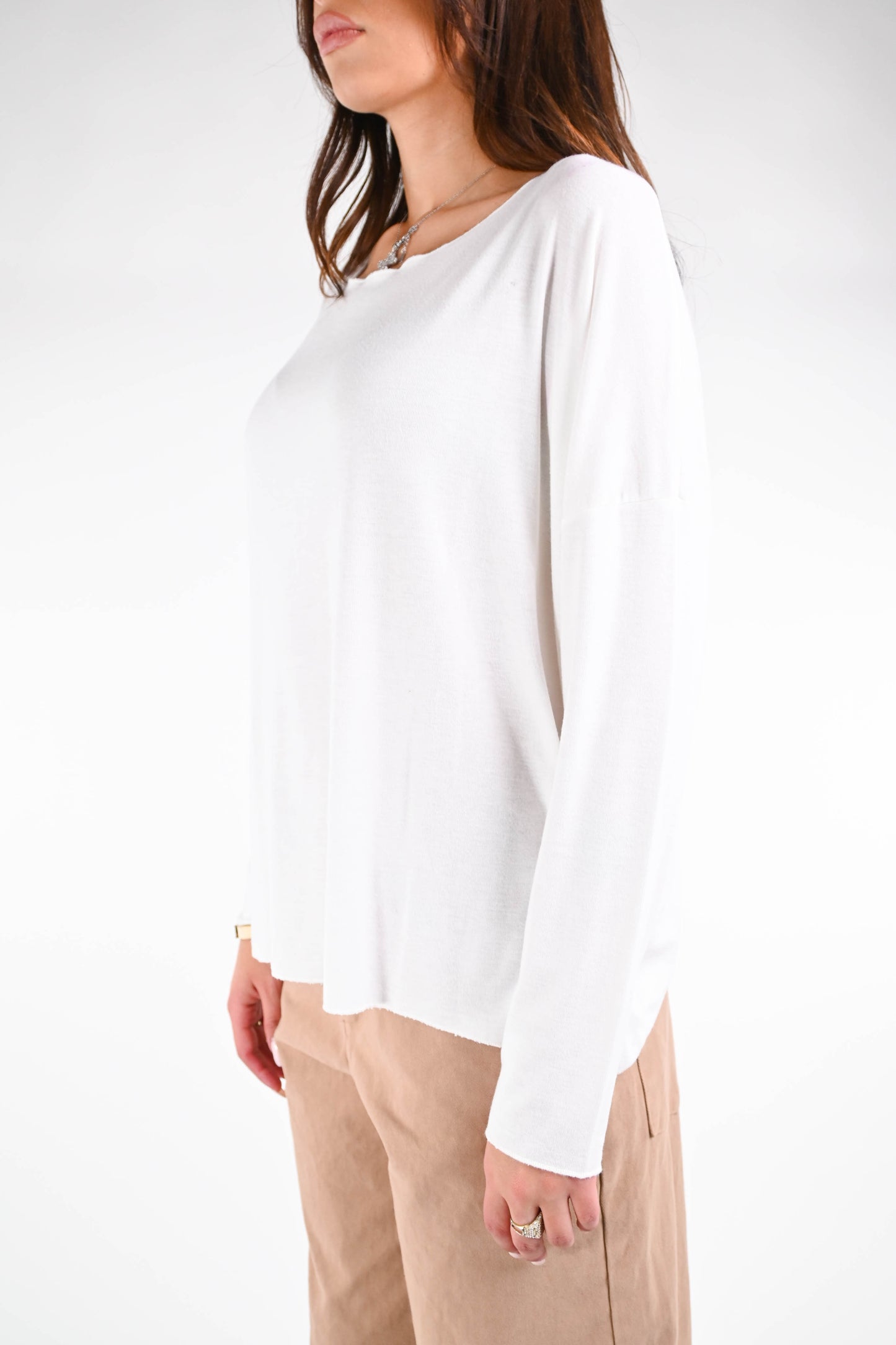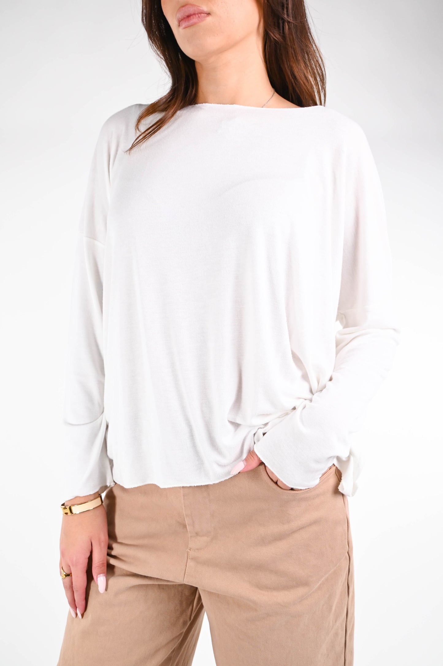 T-shirt a scatola manica lunga in lyocell elasticizzata, scollo madonna, colore Panna