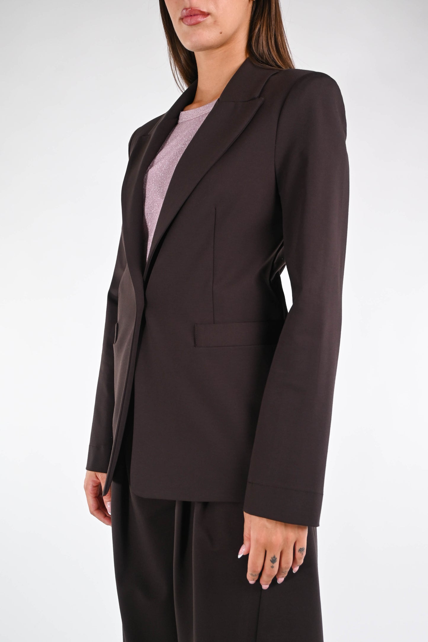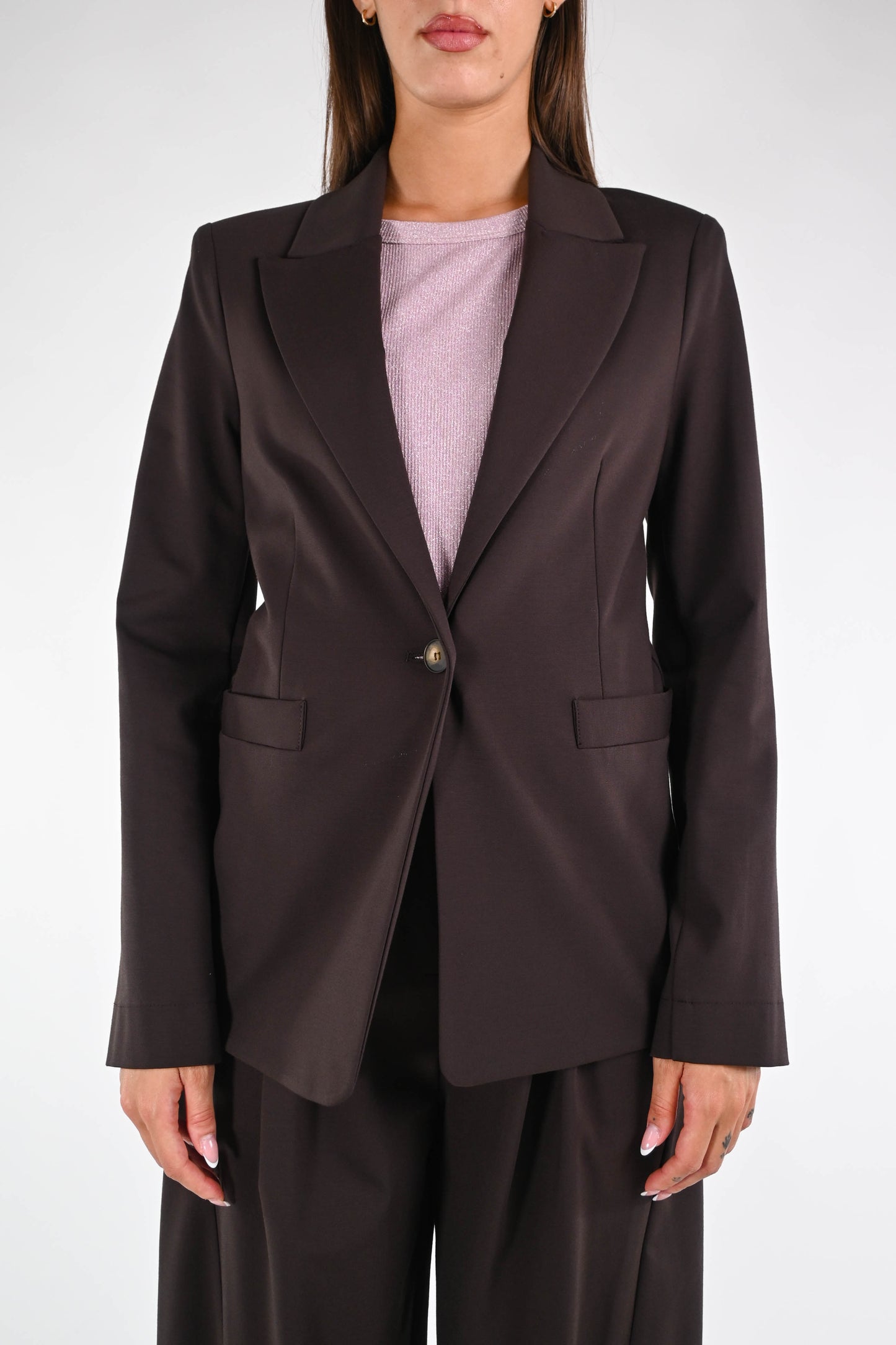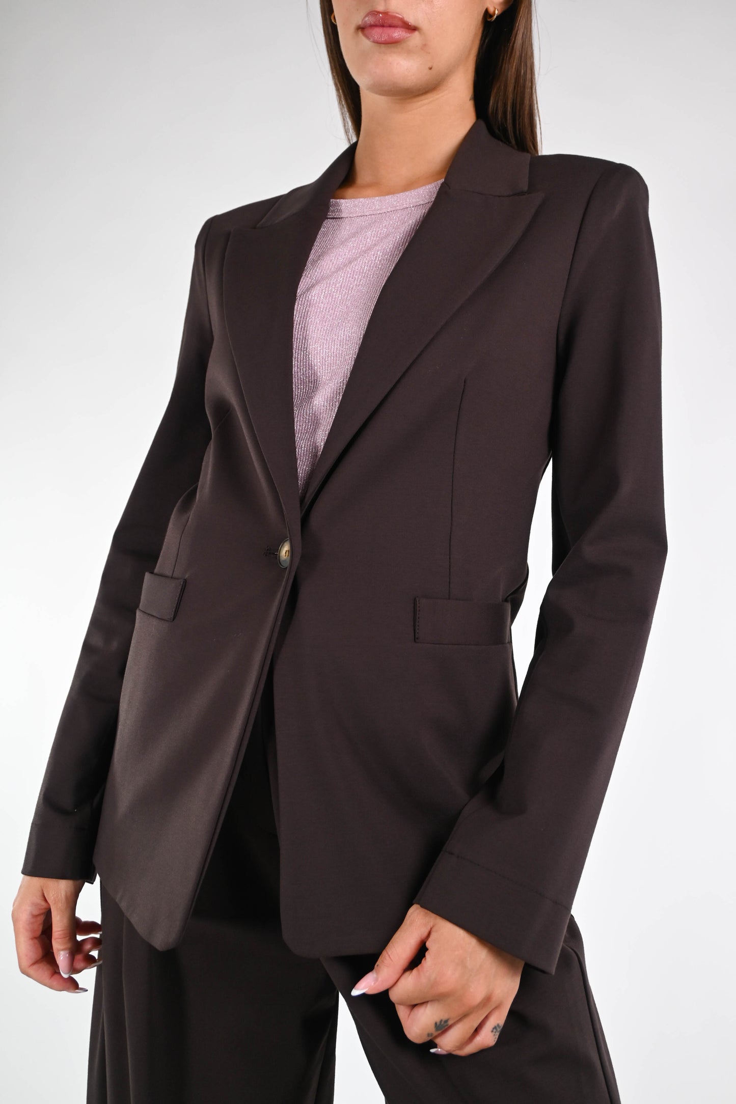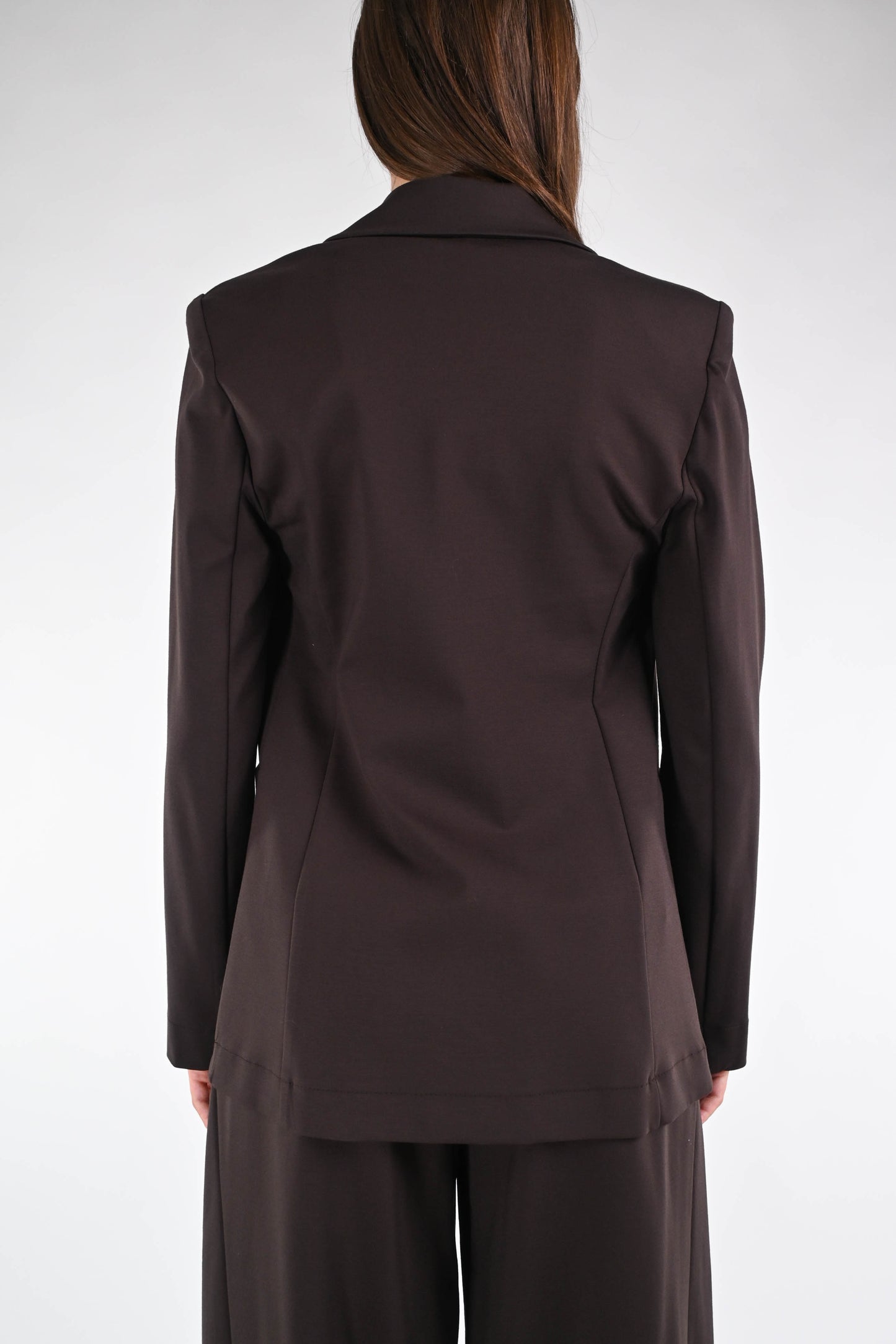 Giacca collo lancia in punto milano elasticizzato, ad un bottone, color moro