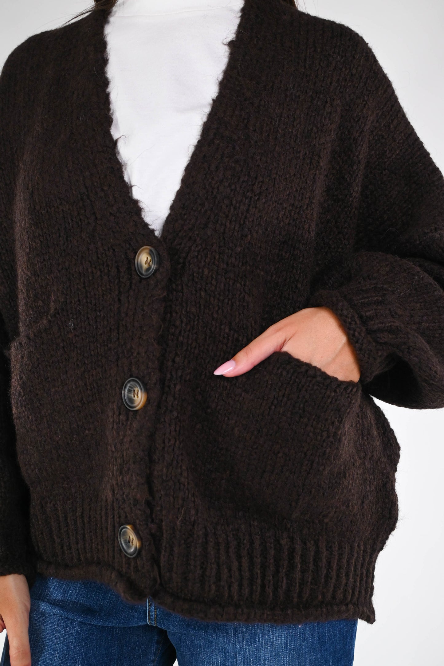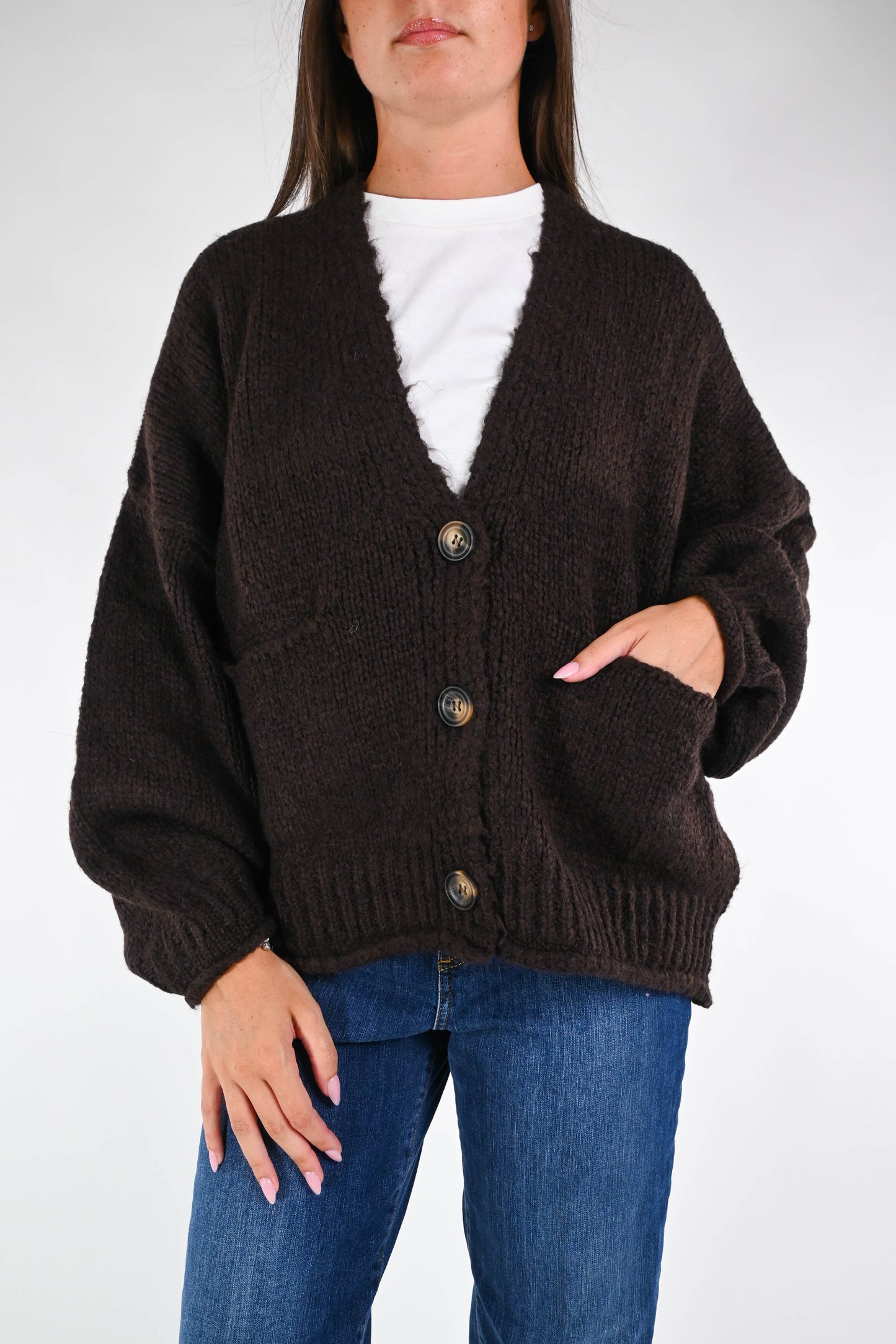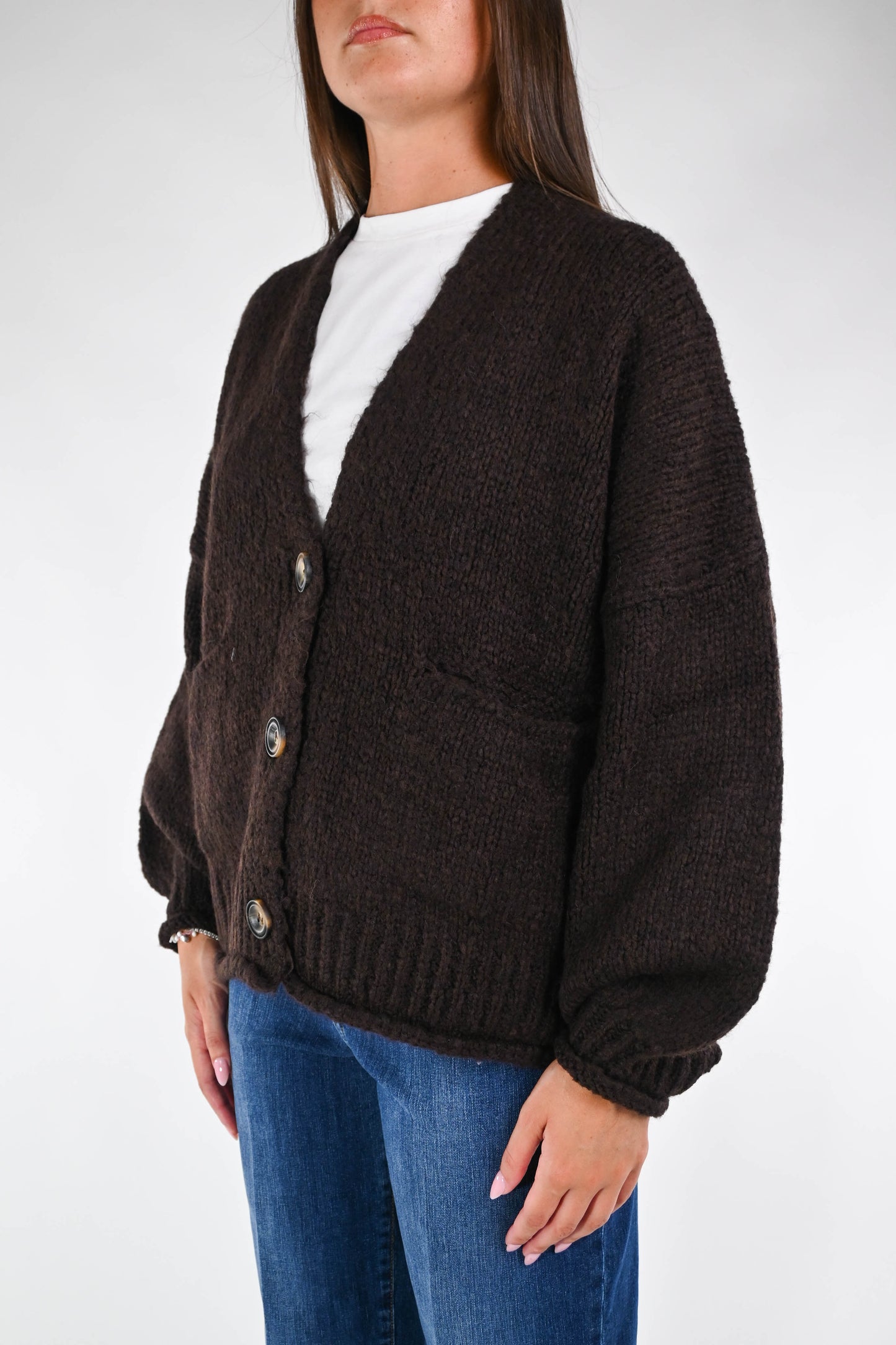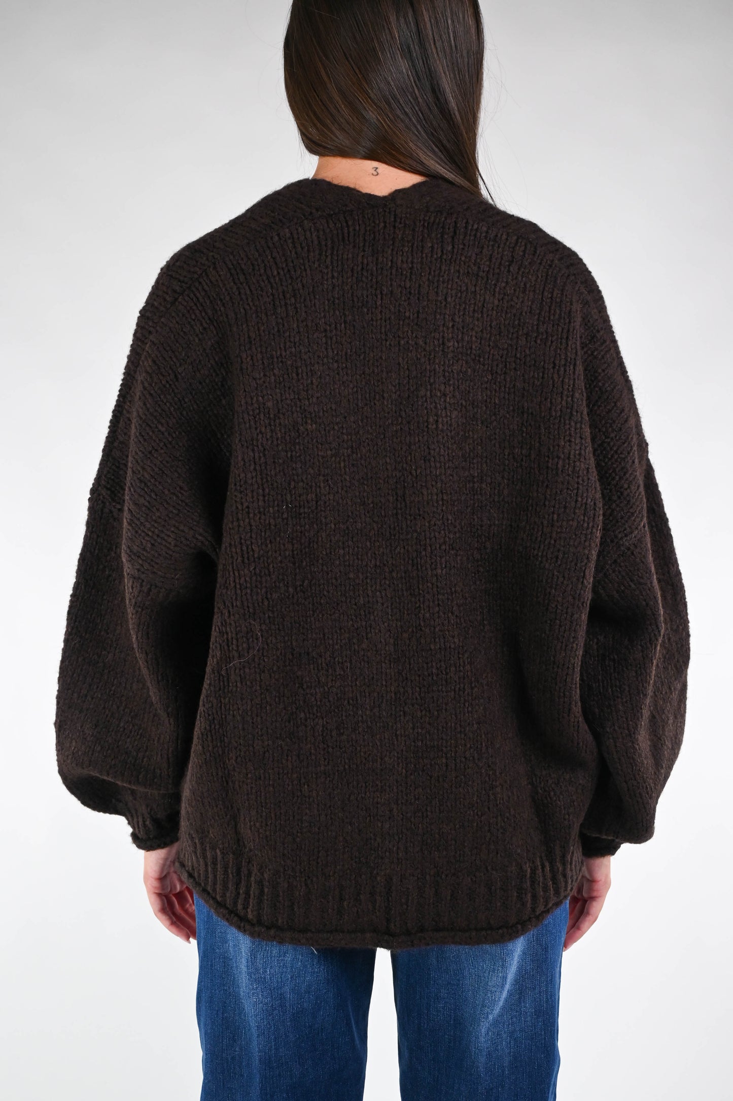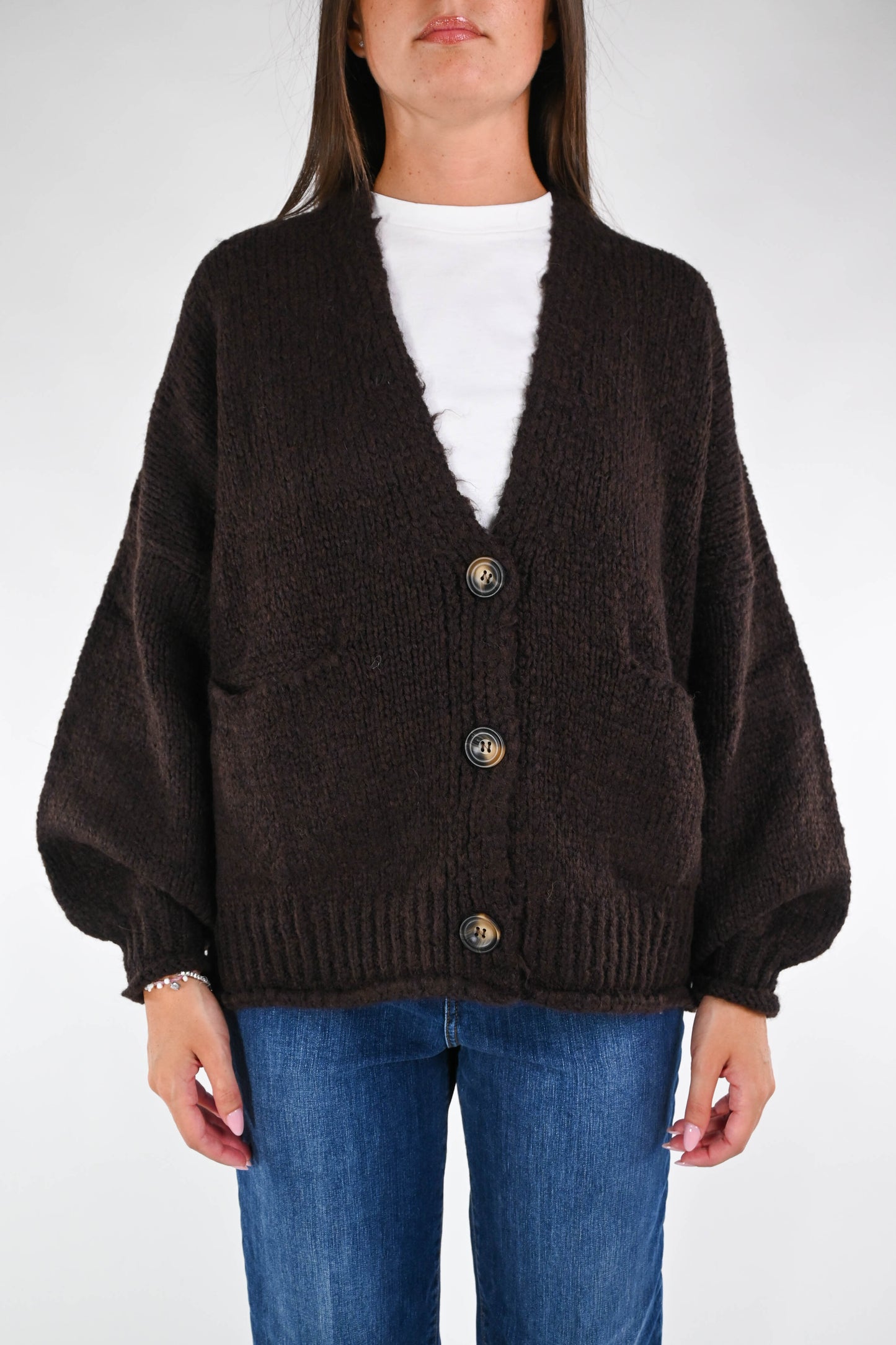 Cardigan over con manica a palloncino, con tasche, colore moro