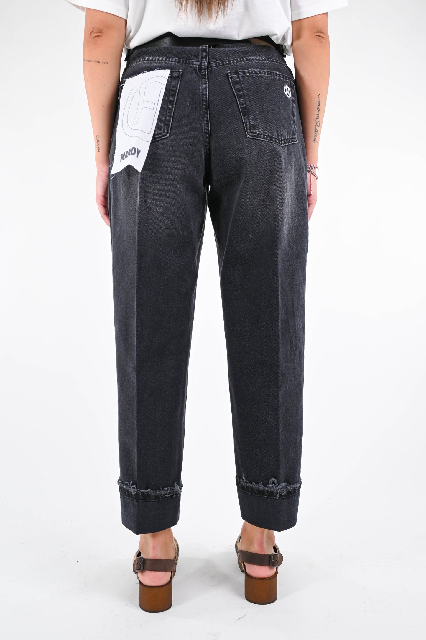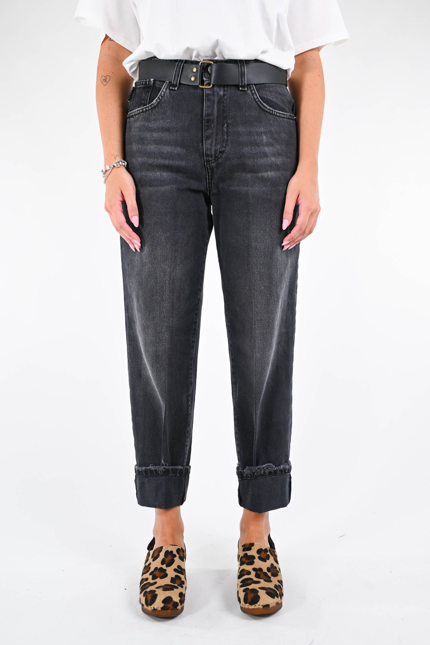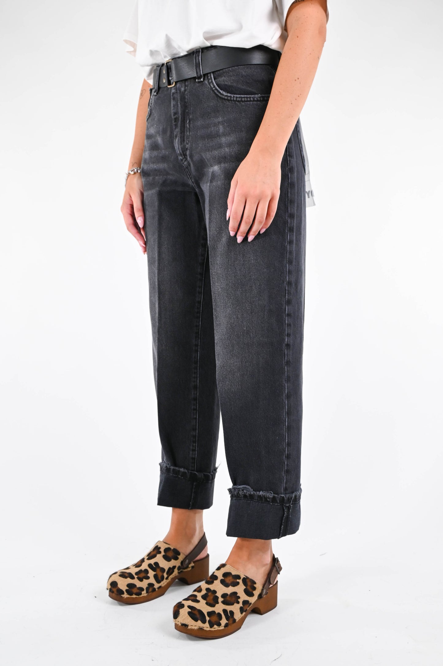 Jeans baggy Haveone, modello Mandy, con con cintura abbinata, con risvolto sul fondo, denim nero