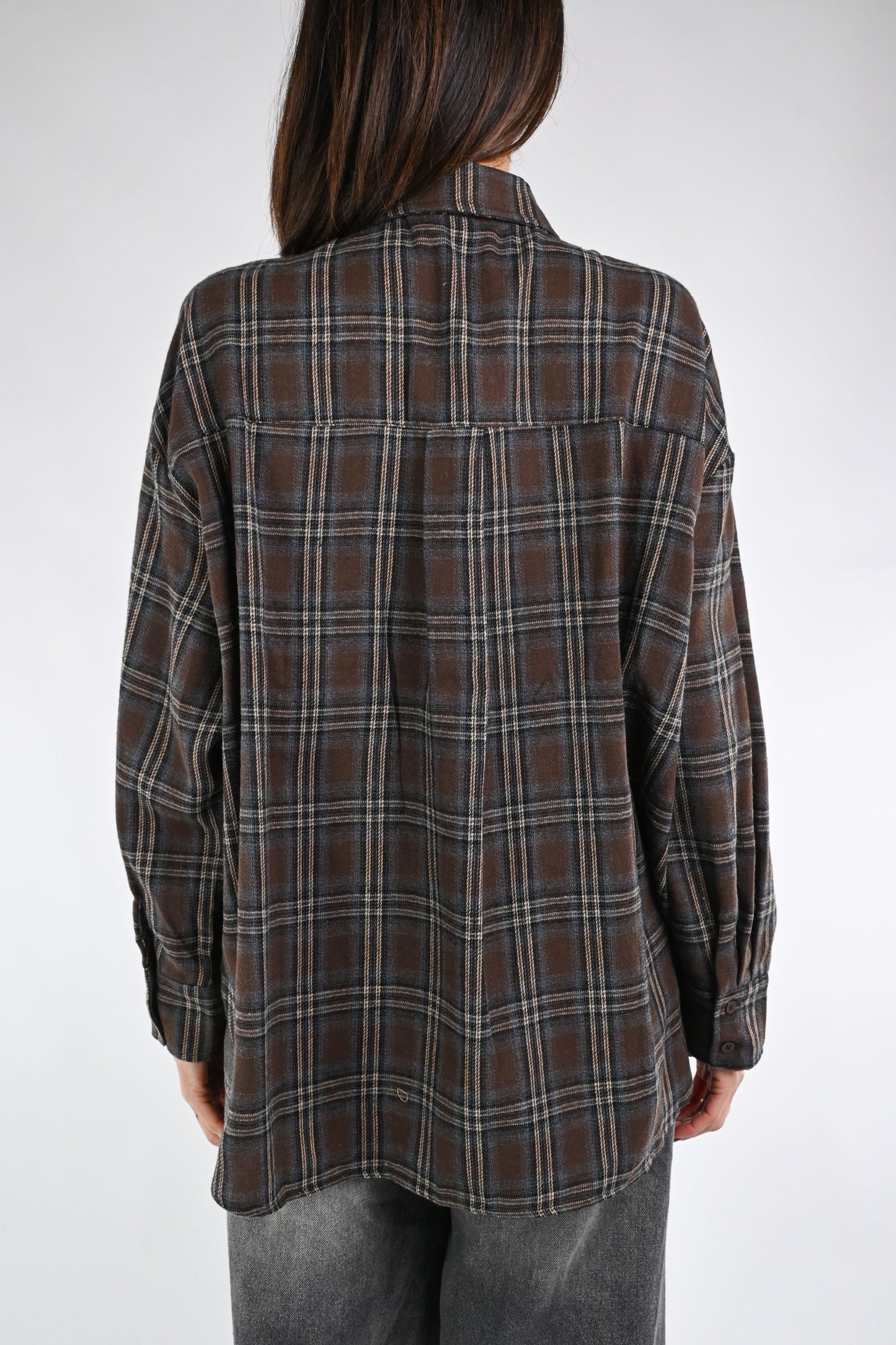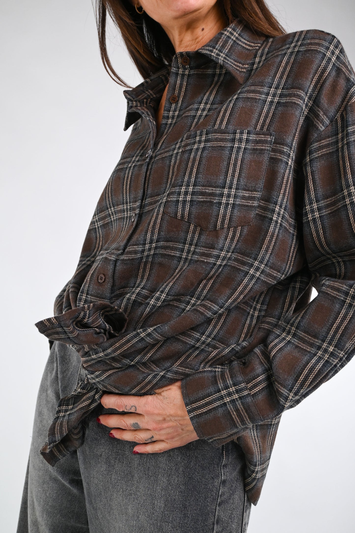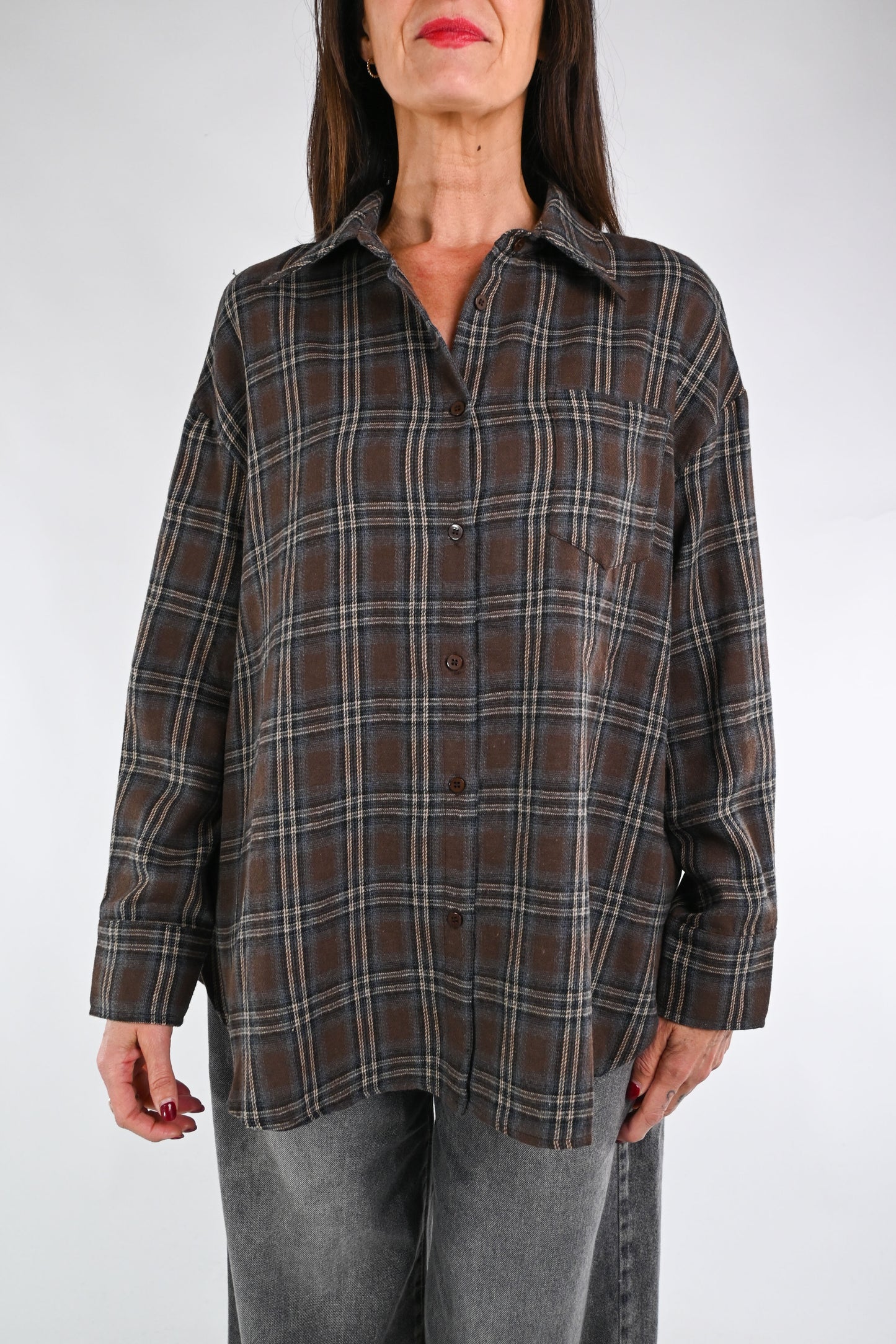 Camicia flanella fantasia scozzese, abbottonata fino in fondo , colore moro/grigio