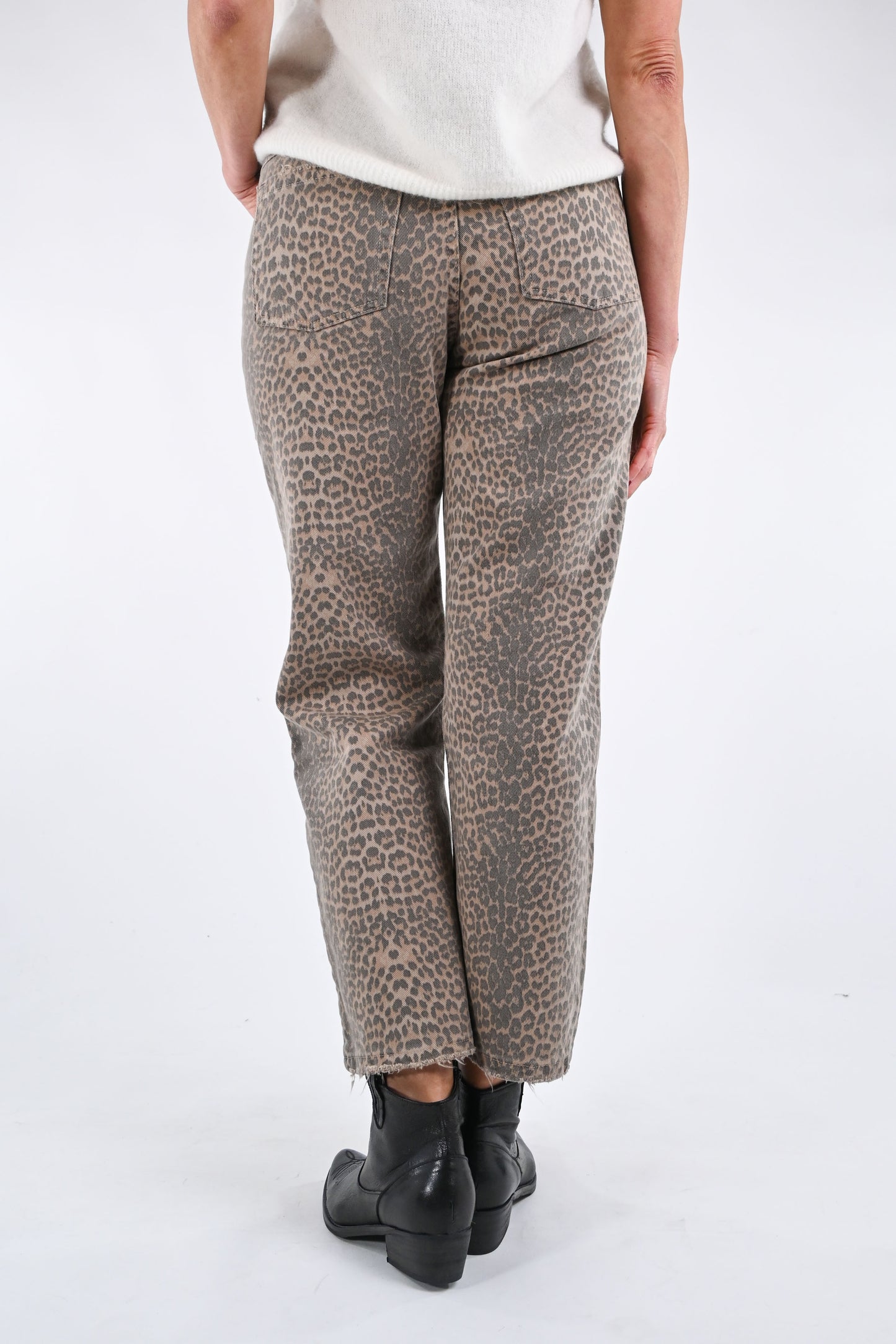 Jeans dritto animalier, 5 tasche, con molatura su tasche e fondo, colore beige/moro