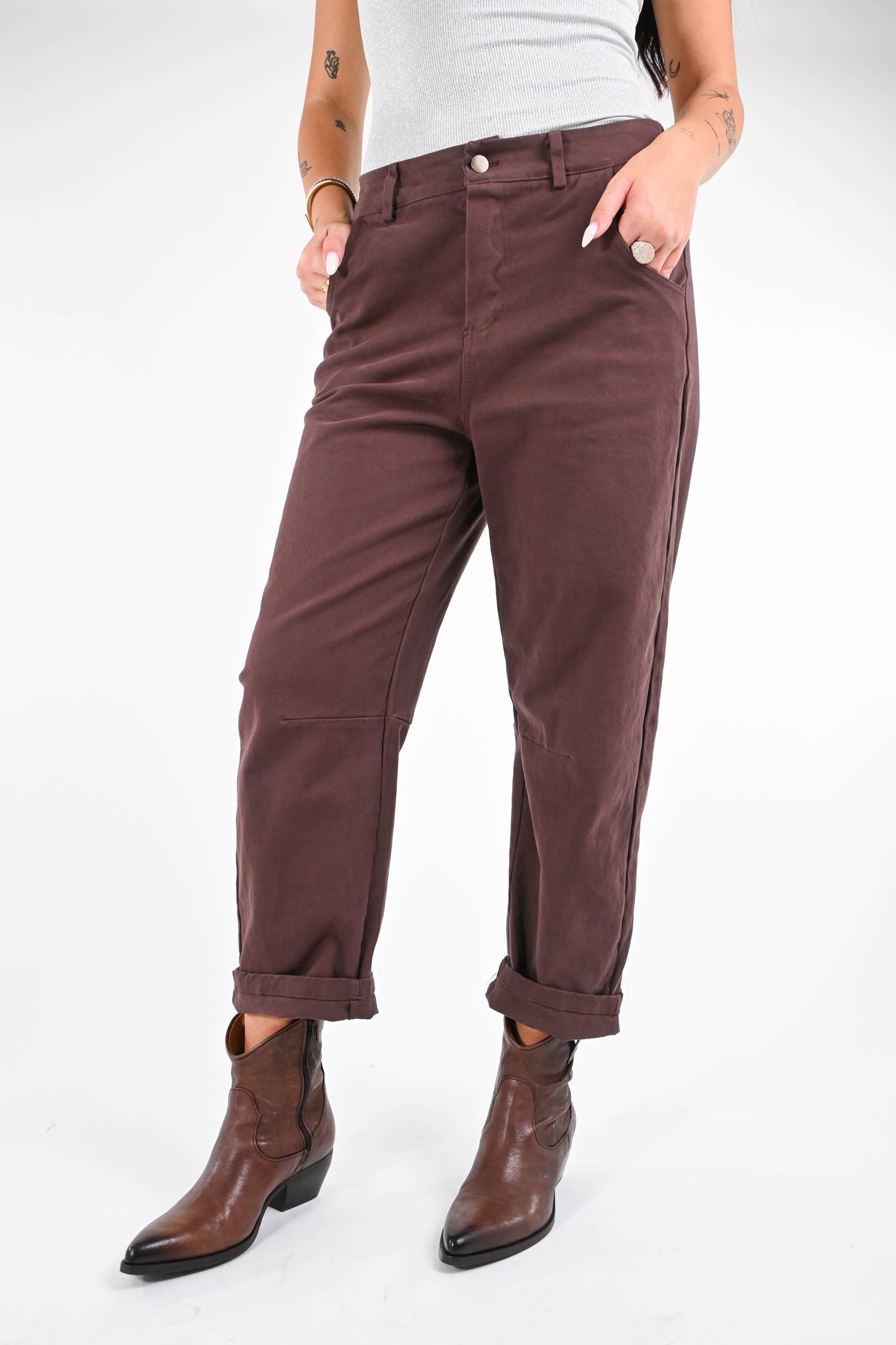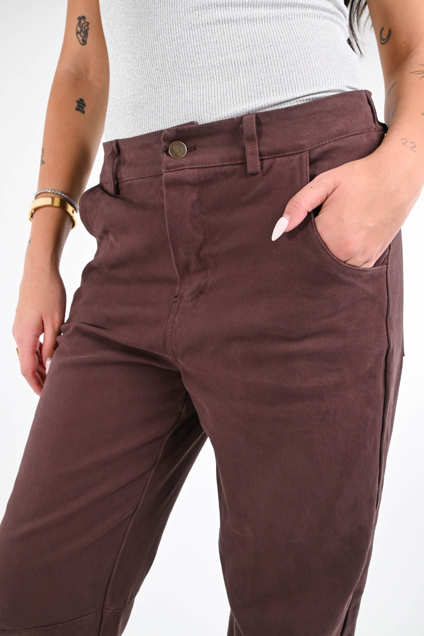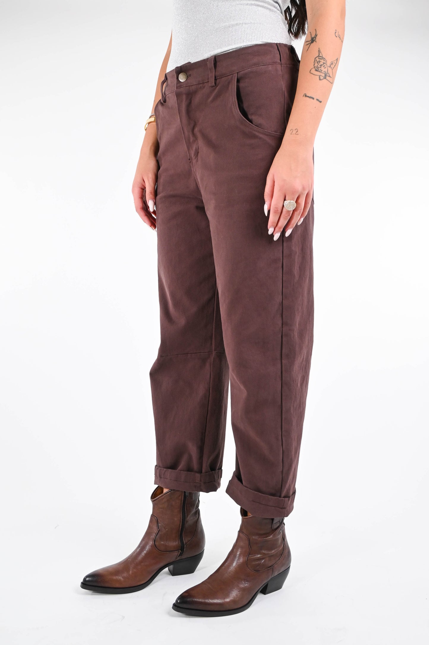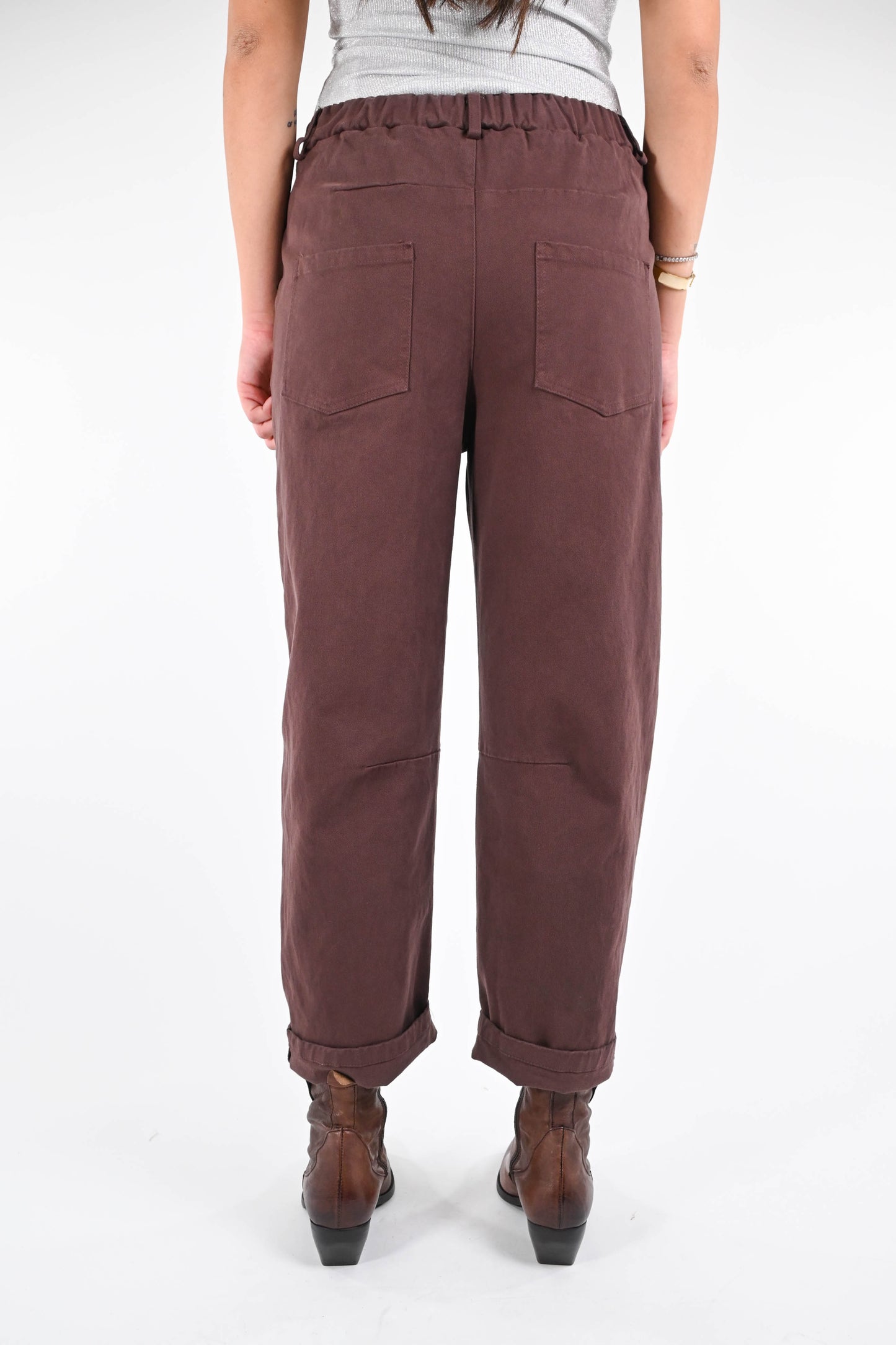Pantalone baggy in gabardina lavato, con mezzo elastico in vita, colore Moro