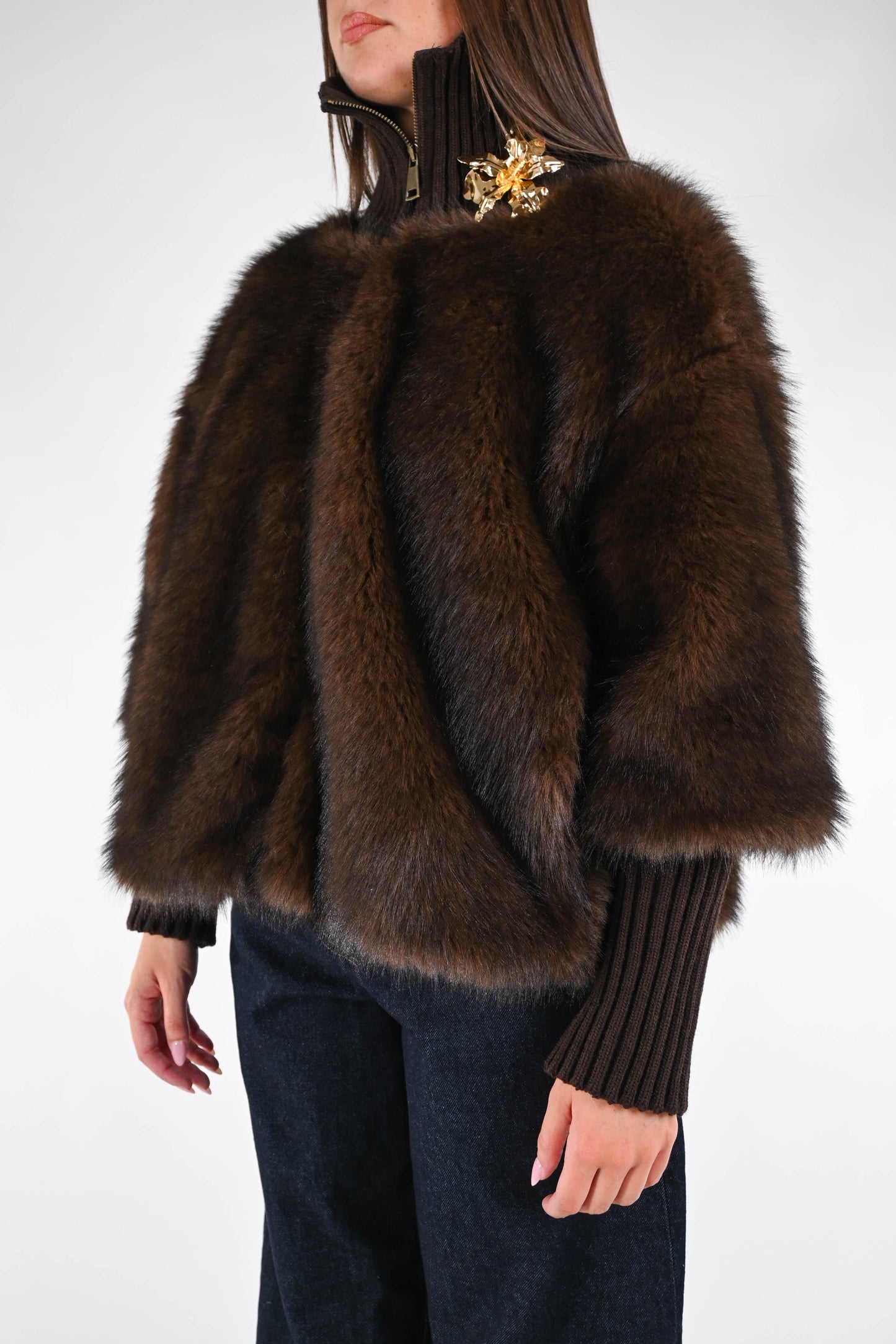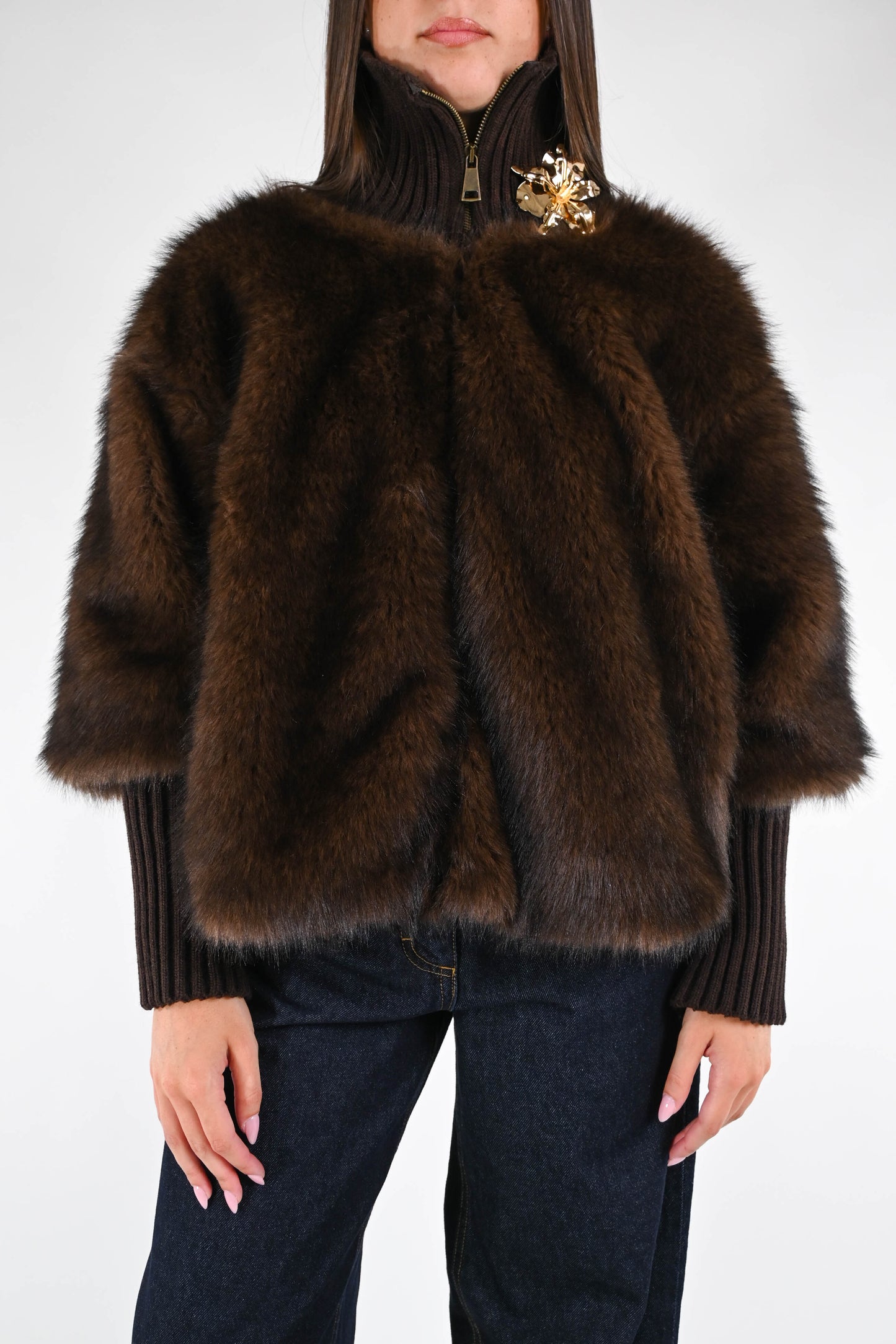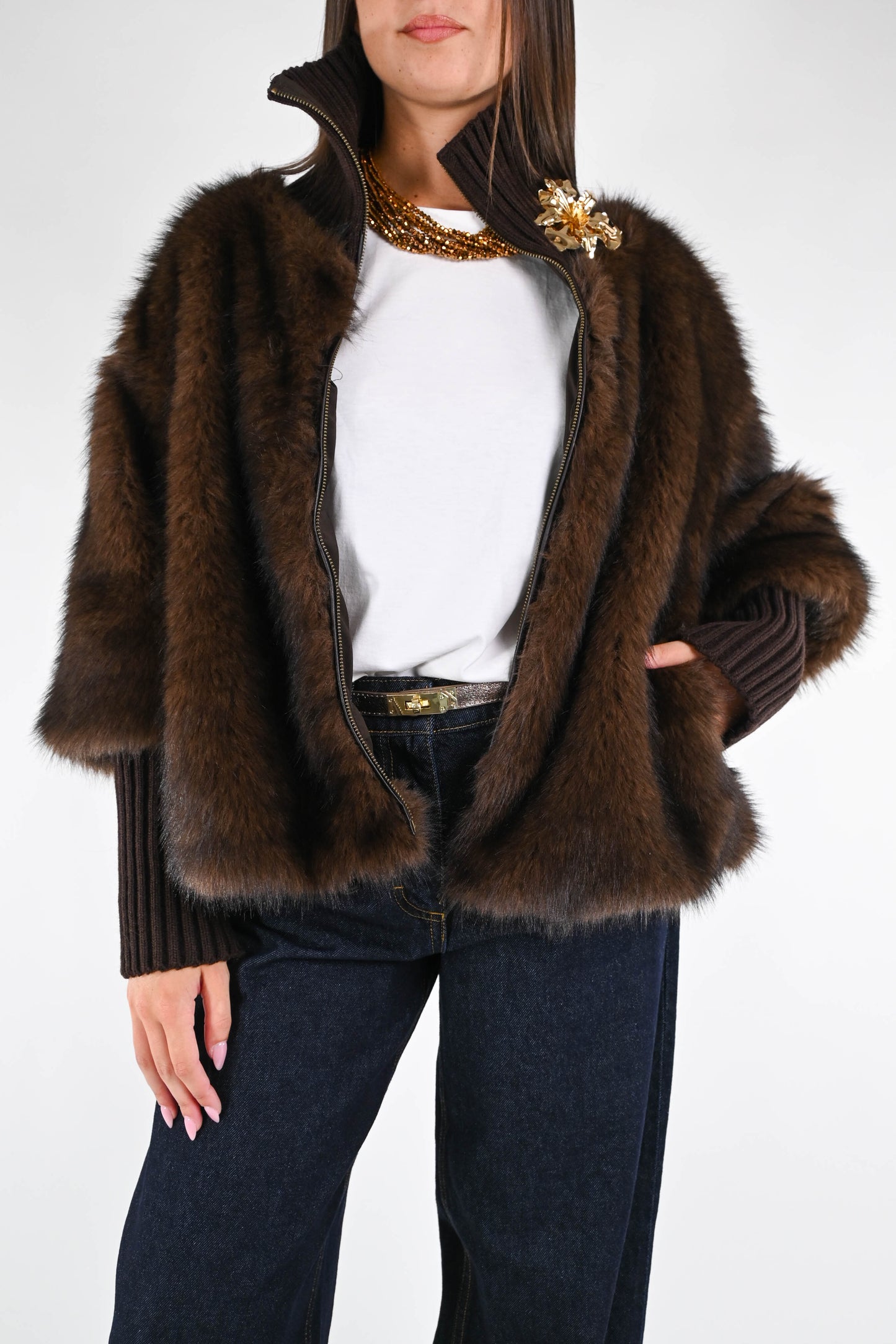 Ecopelliccia corta con collo e polsi in lana a coste, con spilla, con zip, con tasche, foderata, colore moro