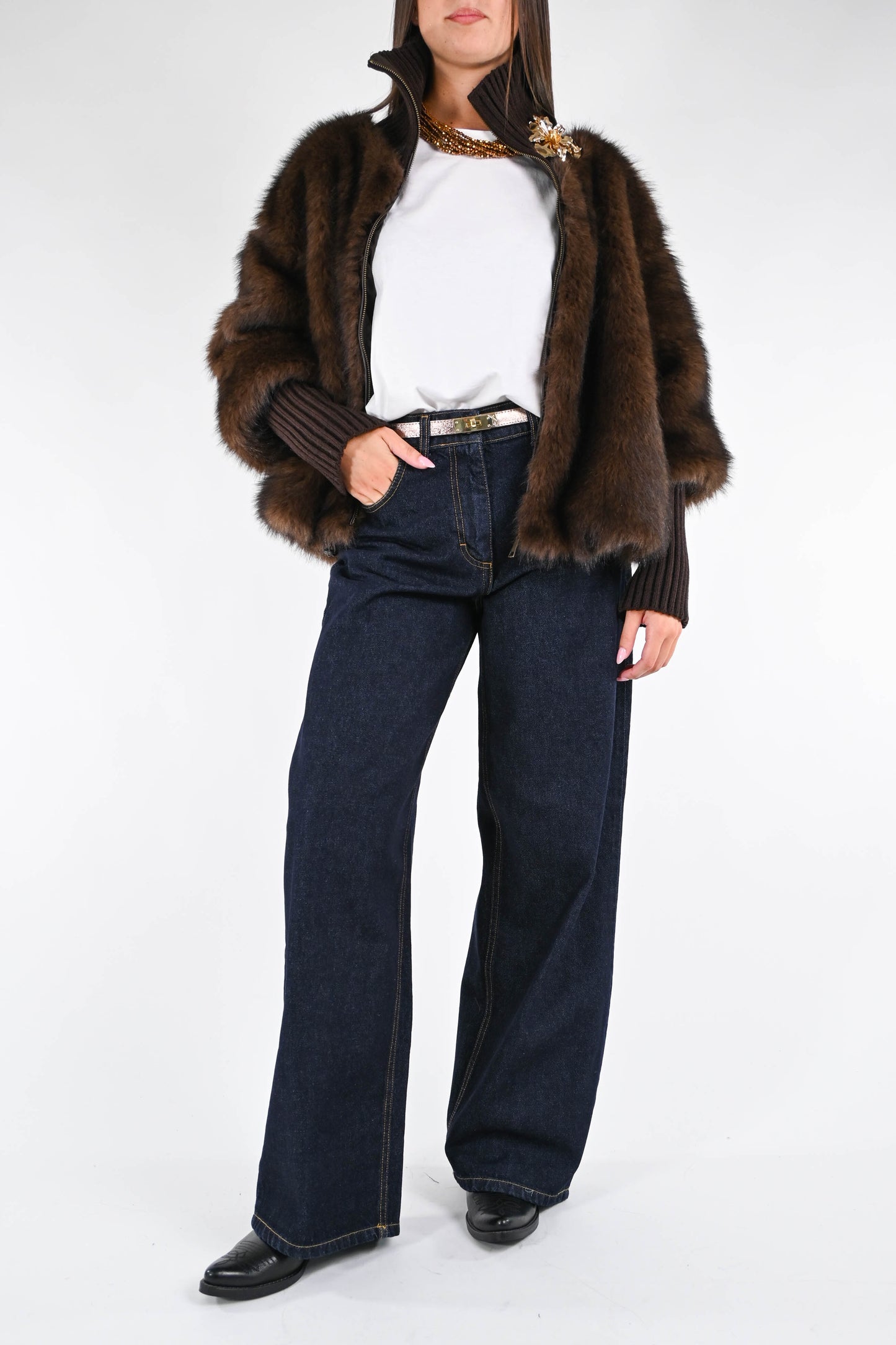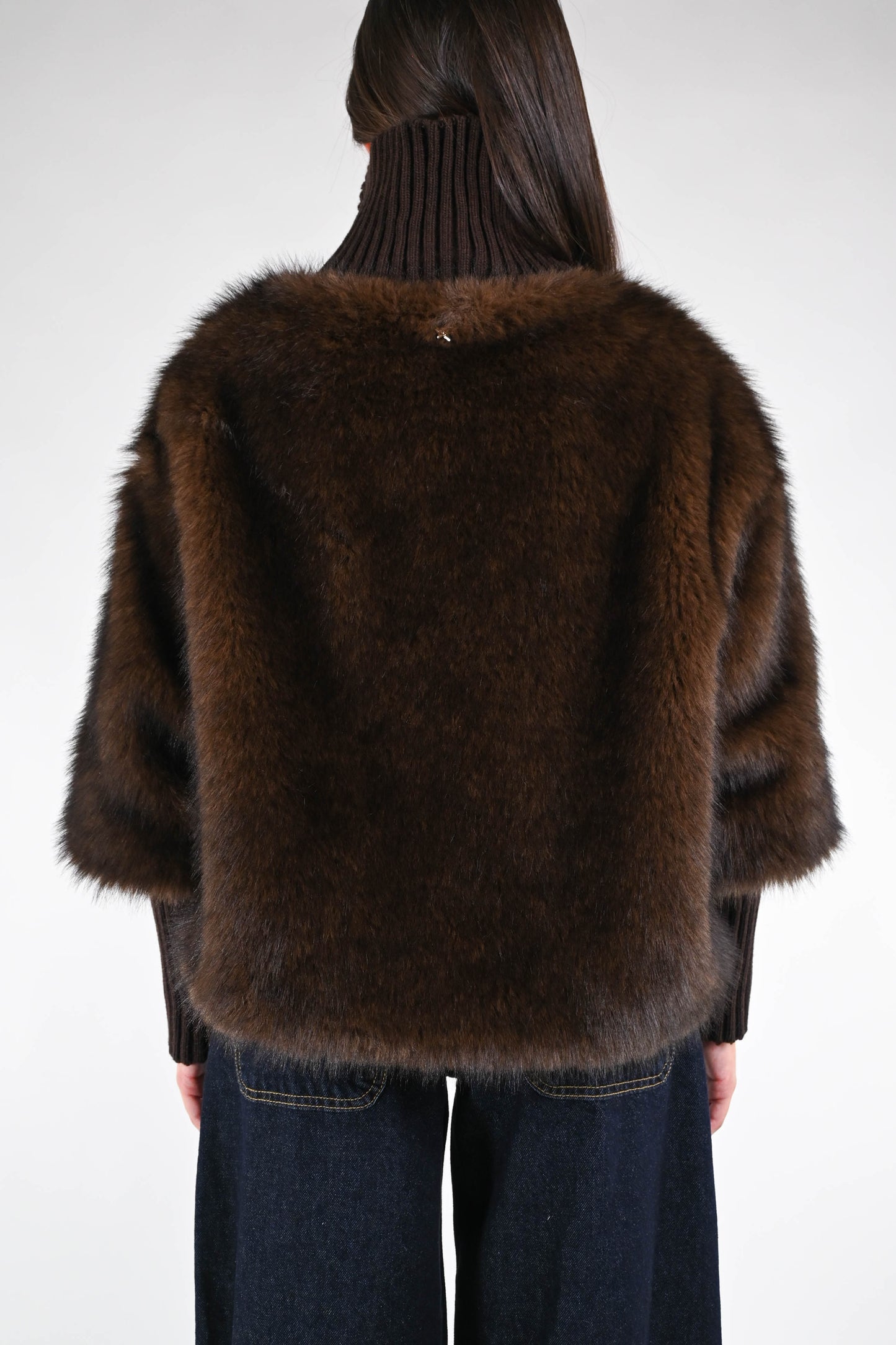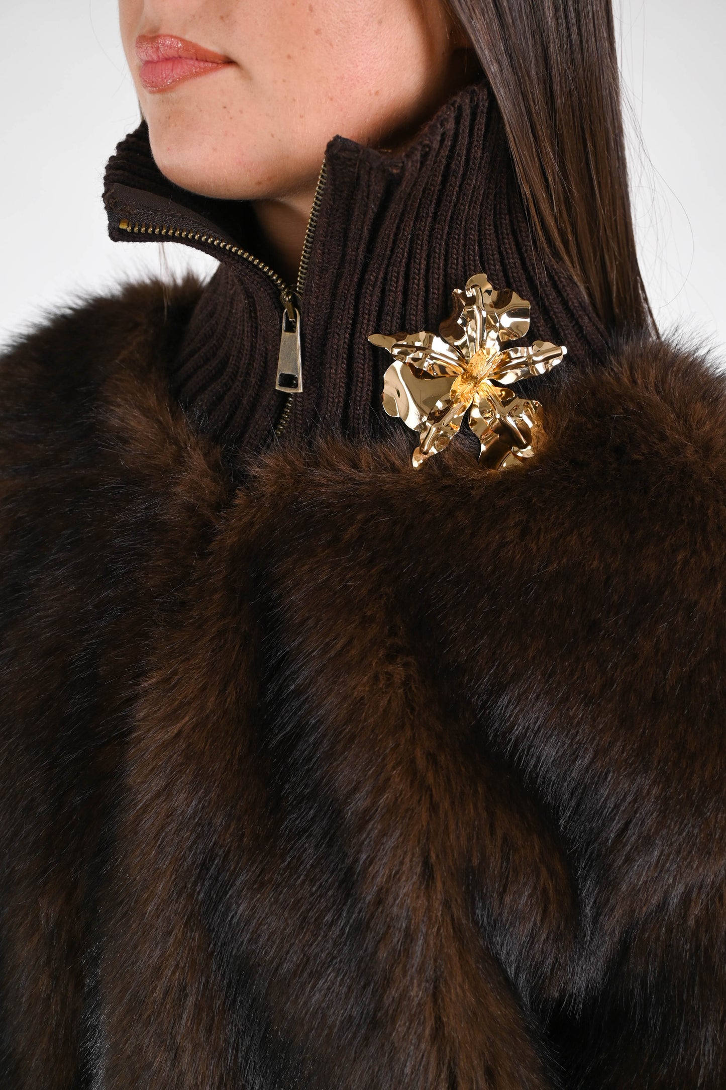 Ecopelliccia corta con collo e polsi in lana a coste, con spilla, con zip, con tasche, foderata, colore moro