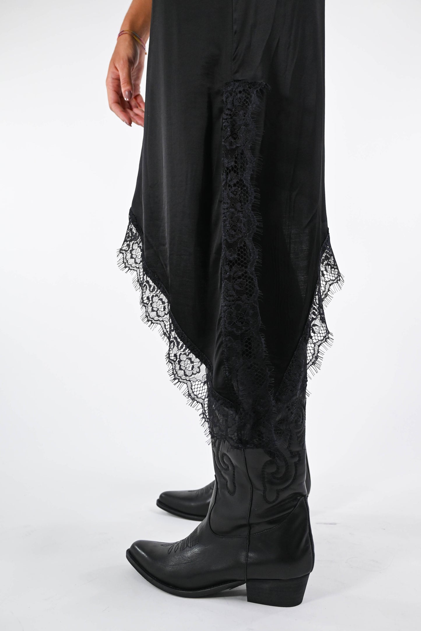 Abito asimmetrico con pizzo, con spacco laterale, con spallina regolabile, colore Nero.