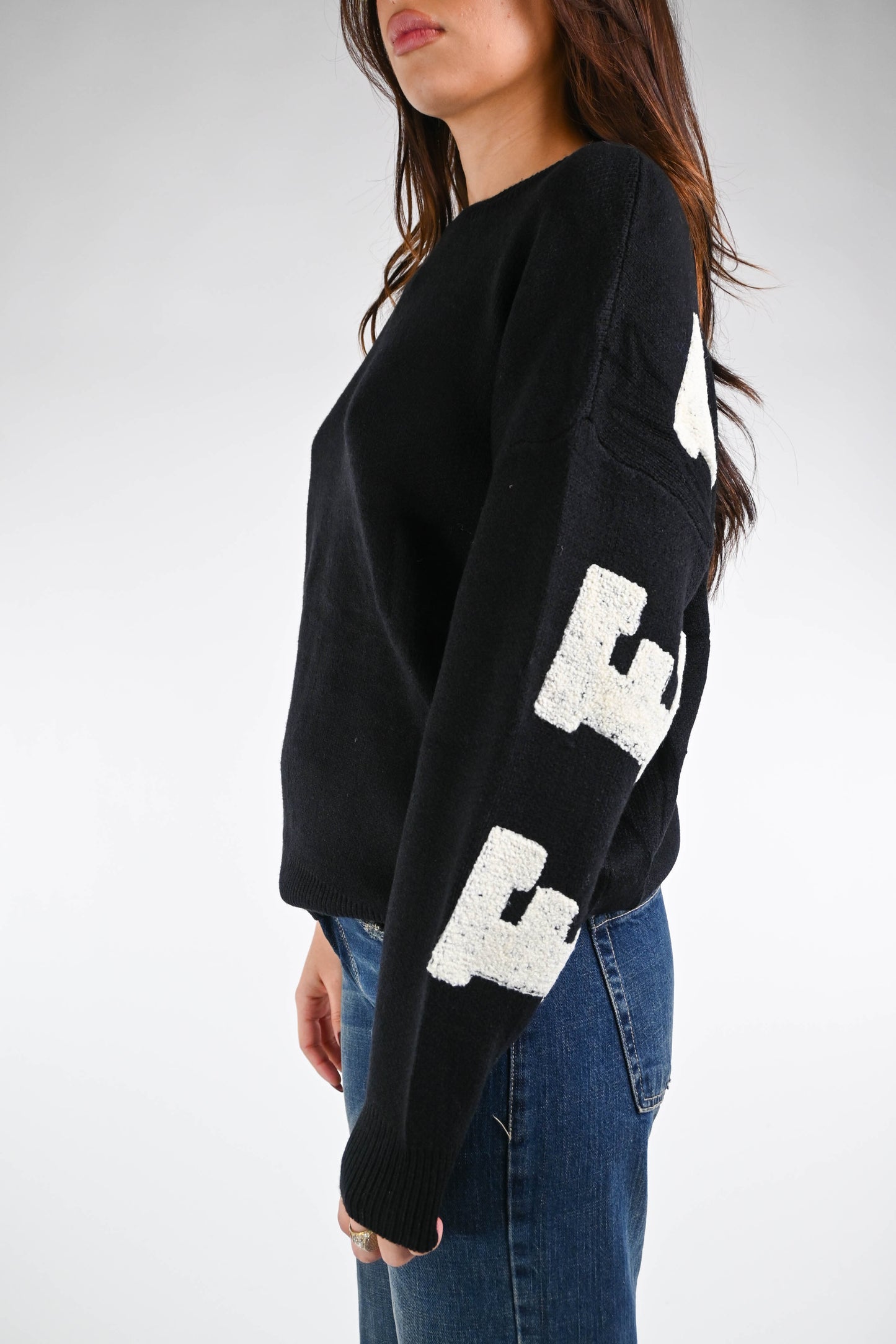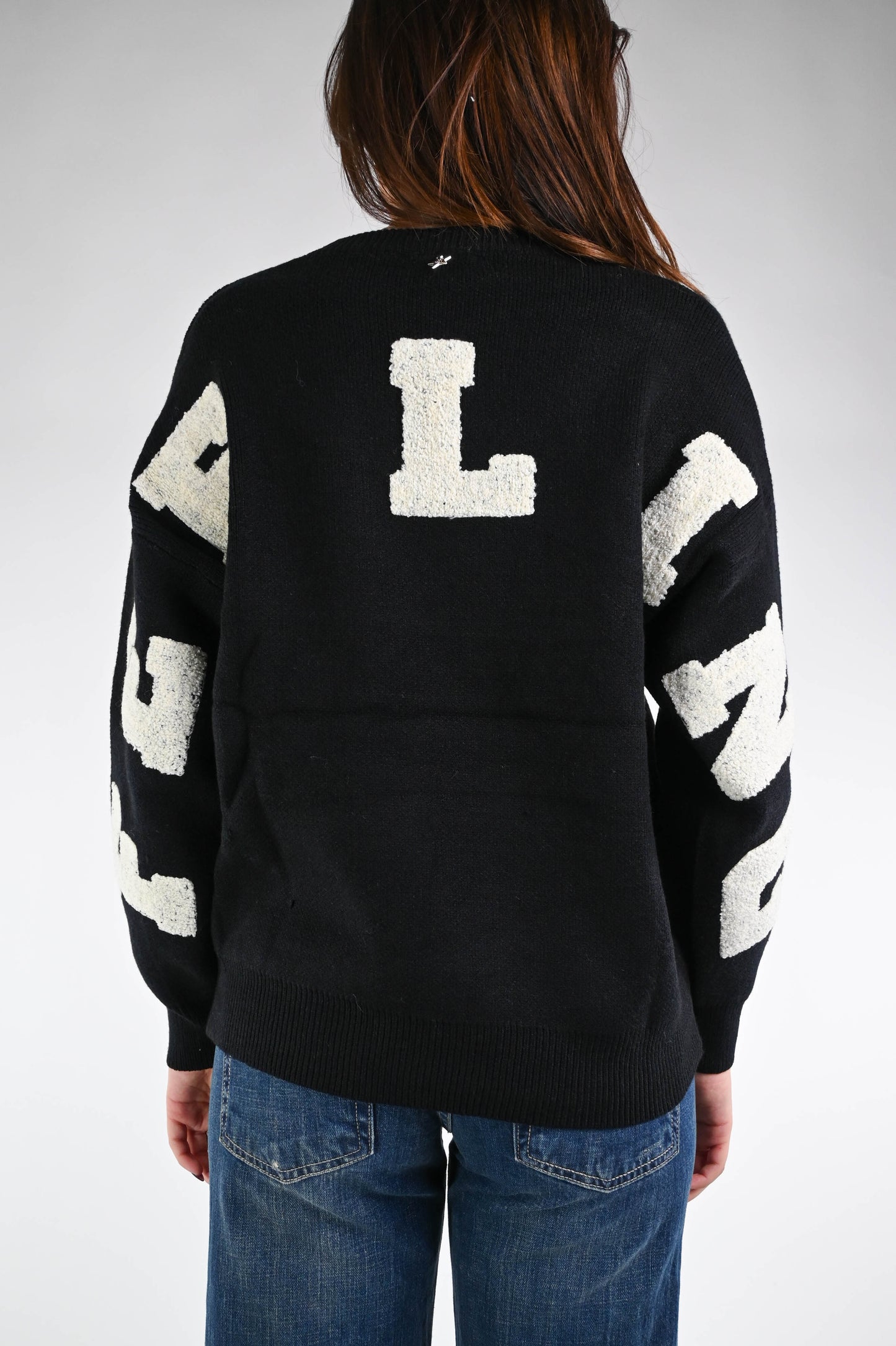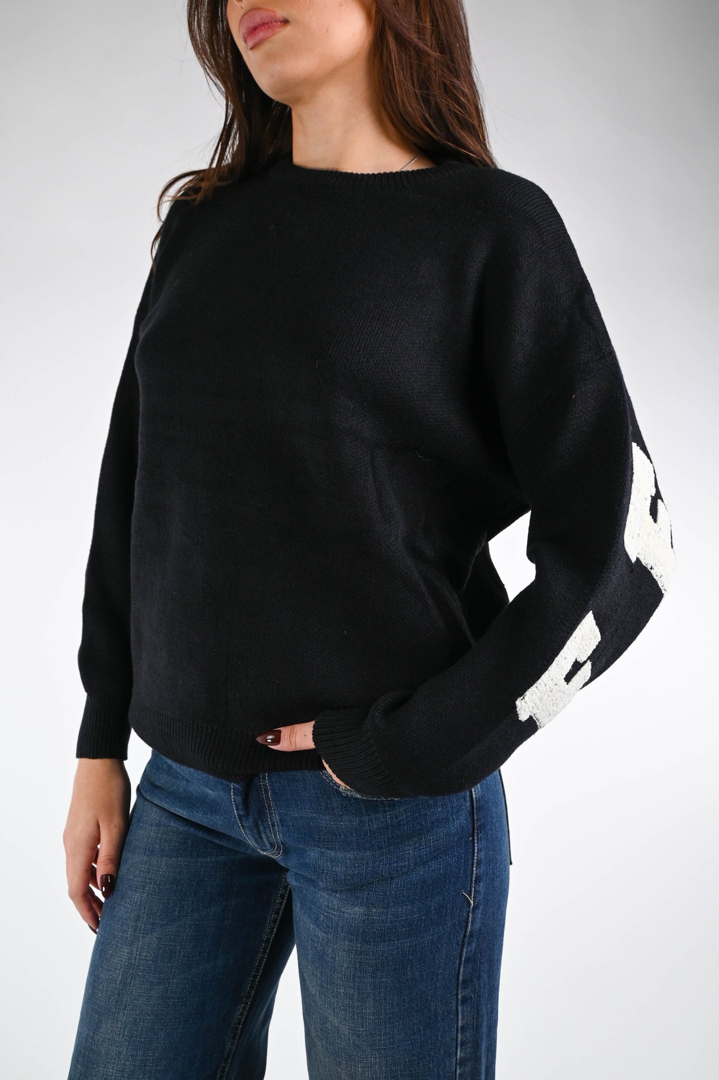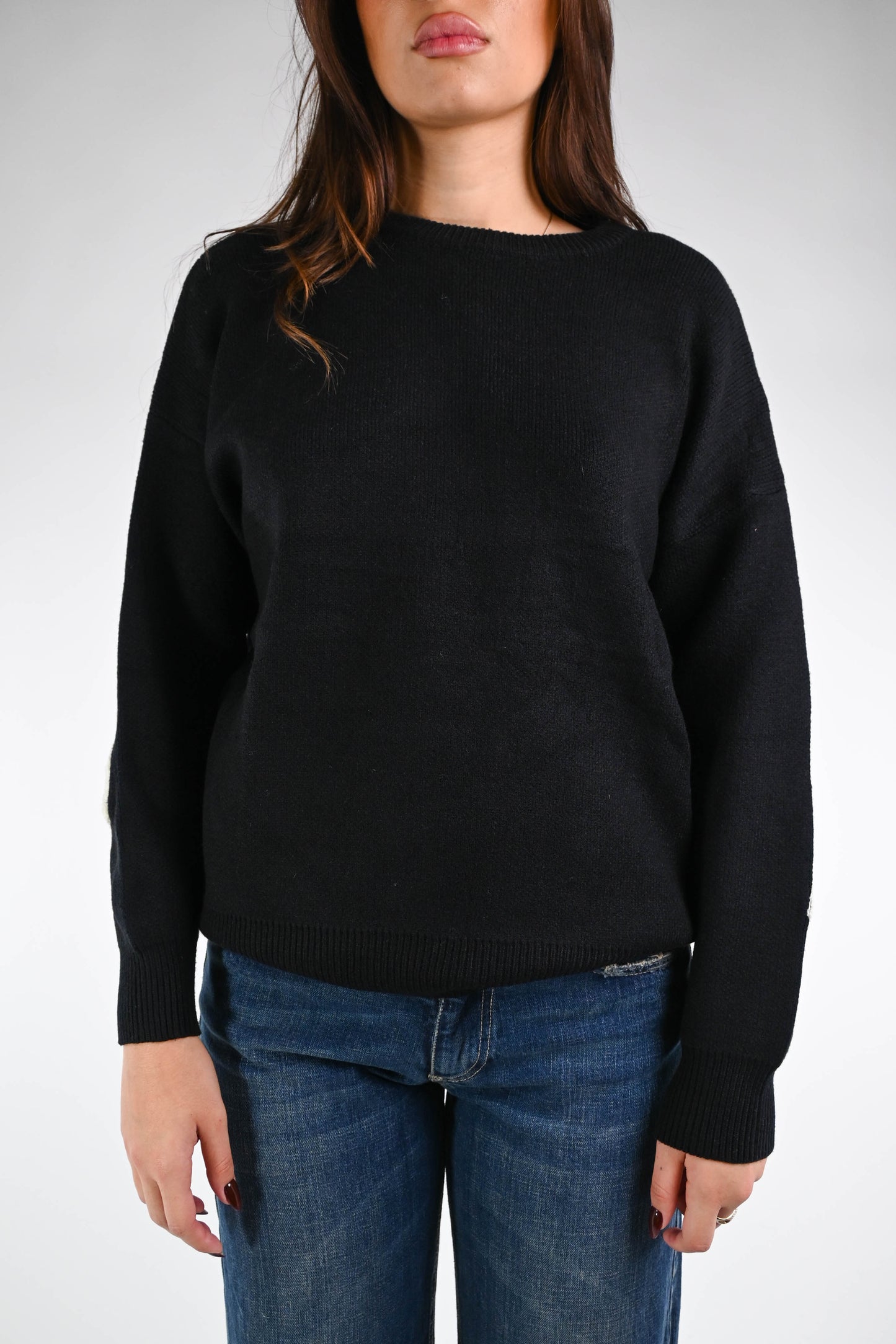 Maglia over girocollo con ricamo feeling nero sulla schiena, con spalla scesa, girocollo, color nero