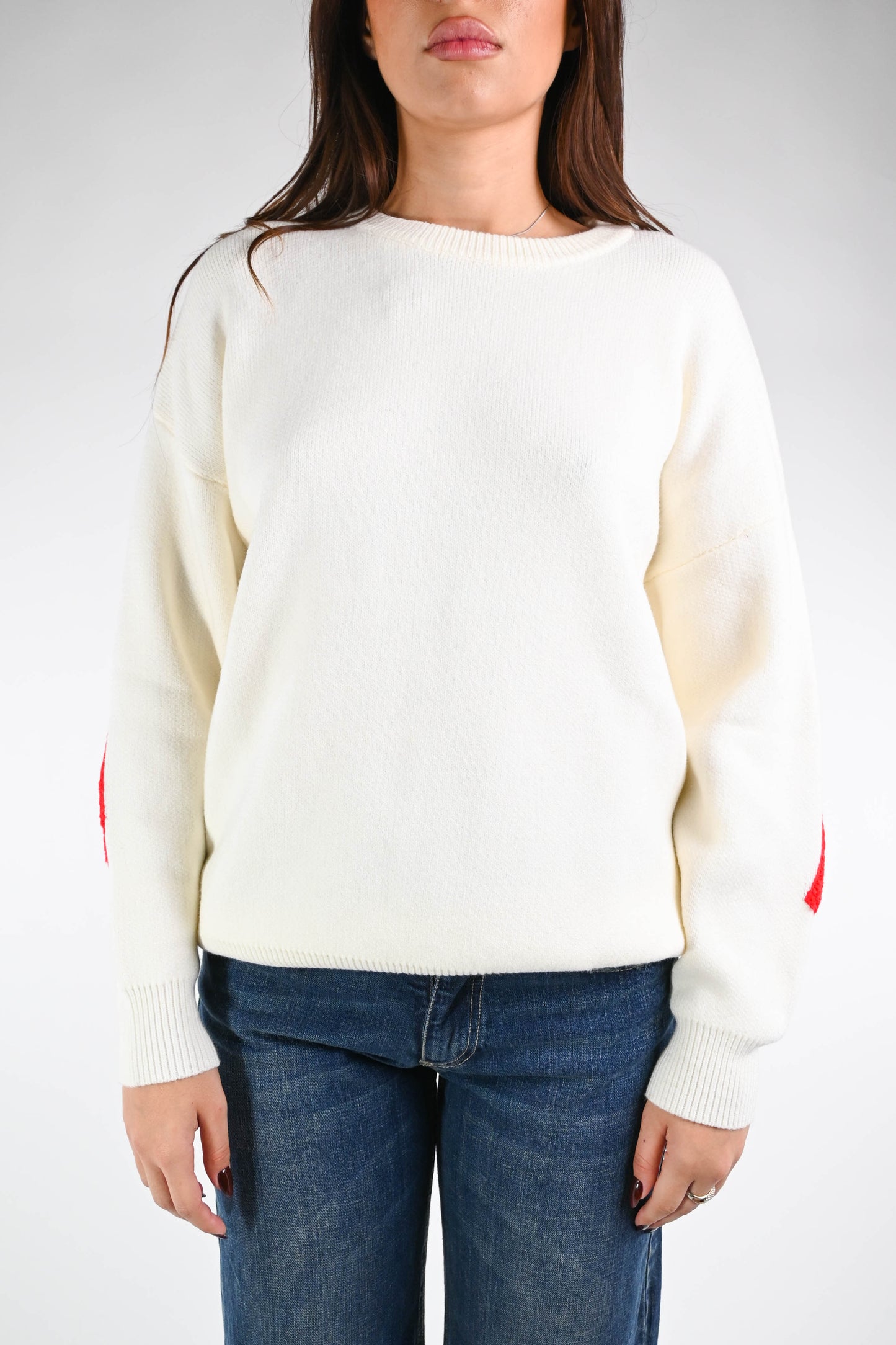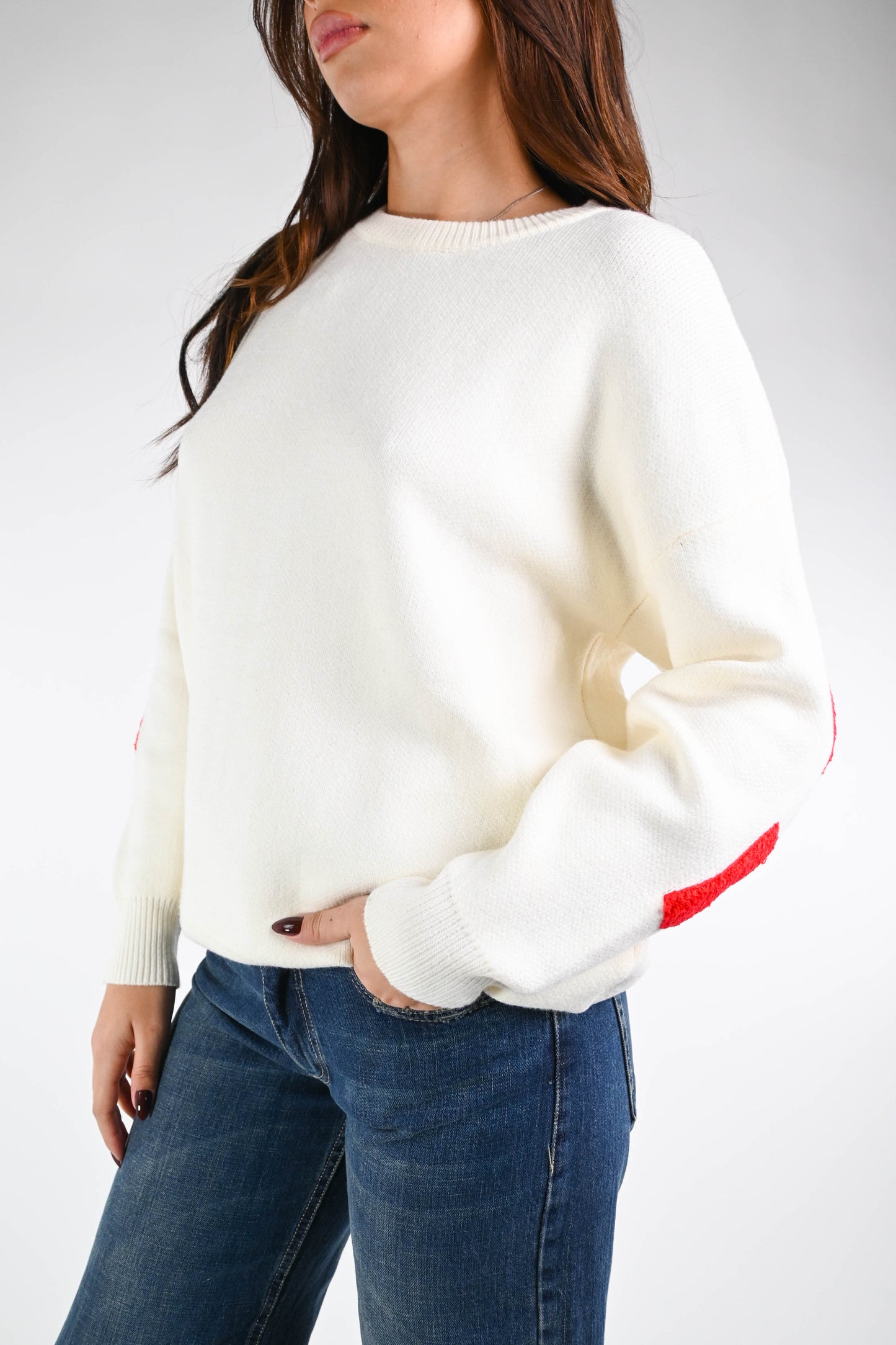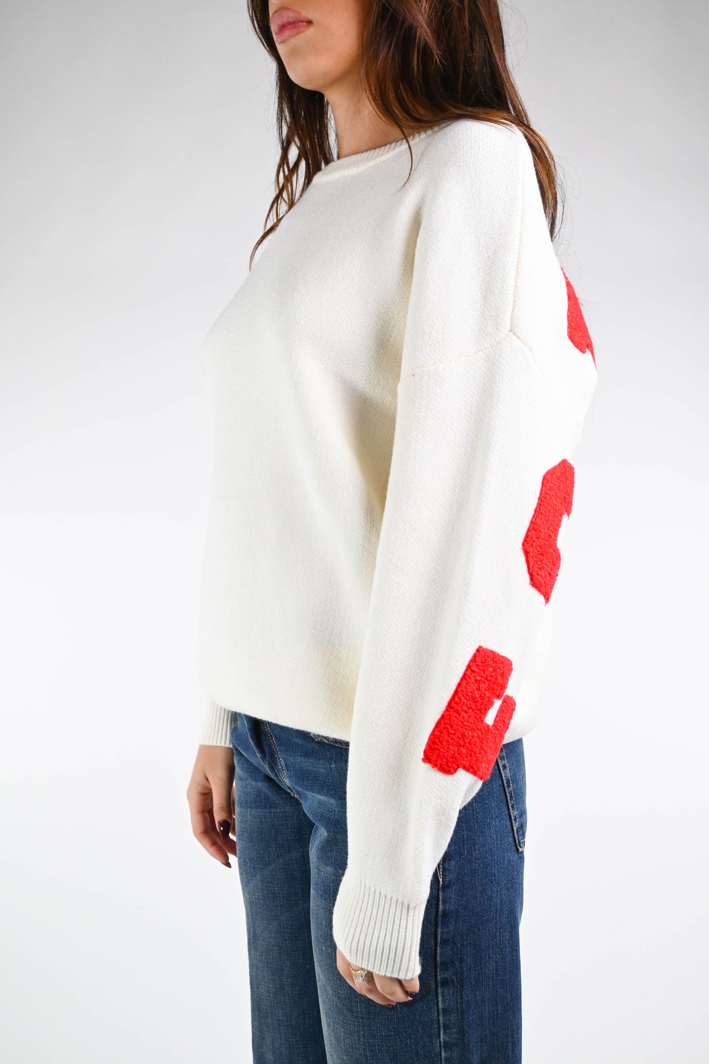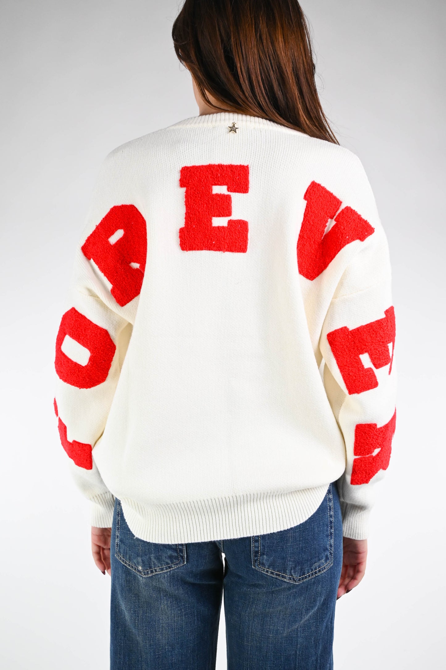 Maglia over girocollo con ricamo forever rosso sulla schiena, con spalla scesa, girocollo, color panna