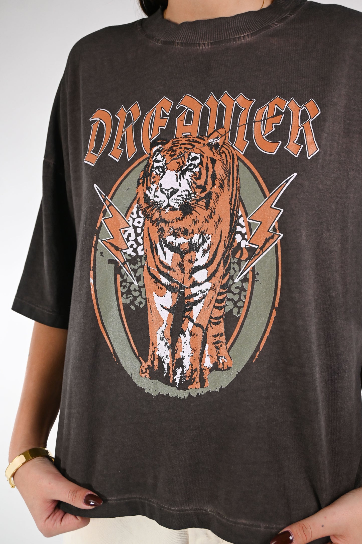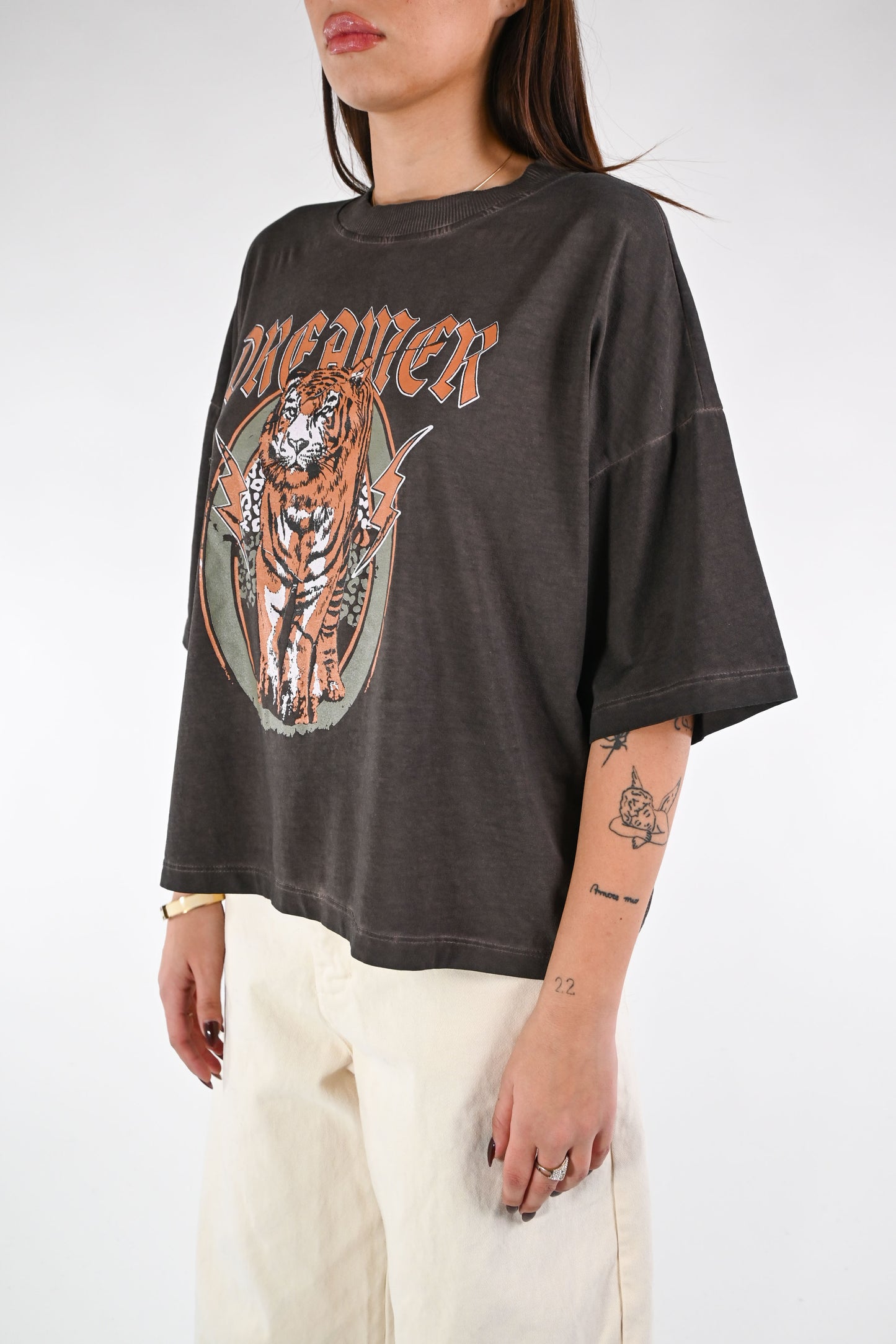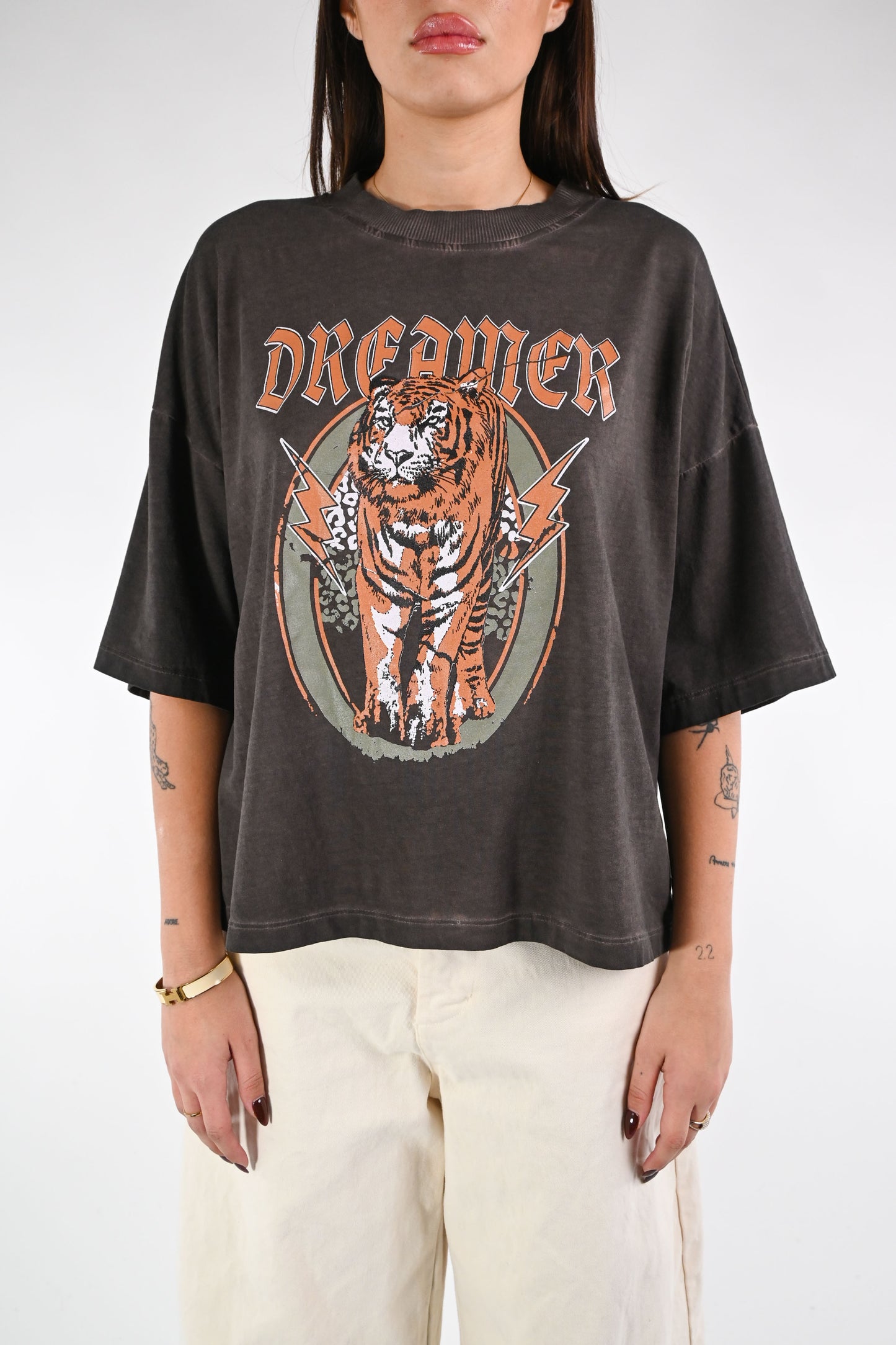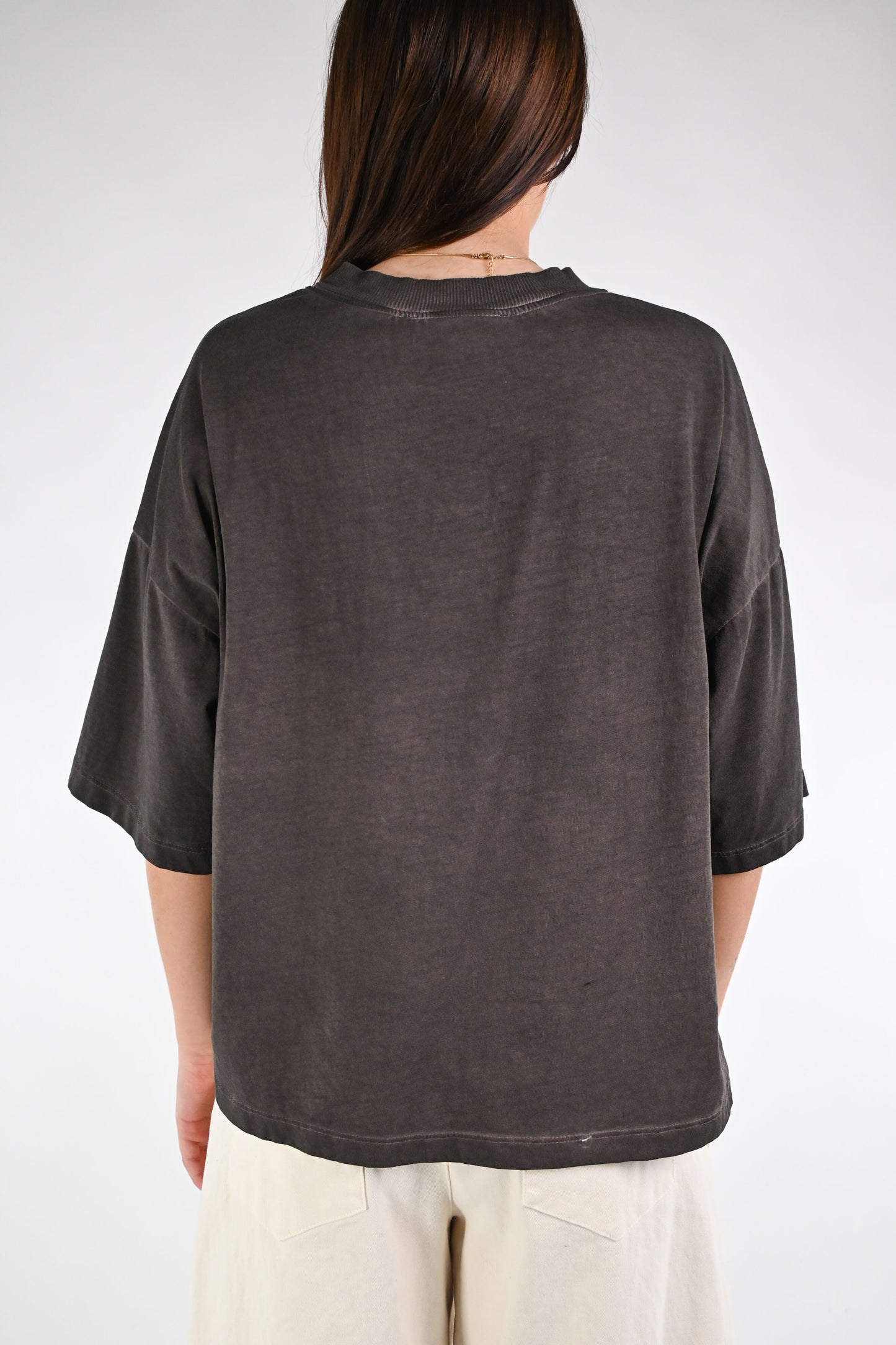 T-shirt over stampa Dreamer, manica 3/4, girocollo, tintura a freddo moro