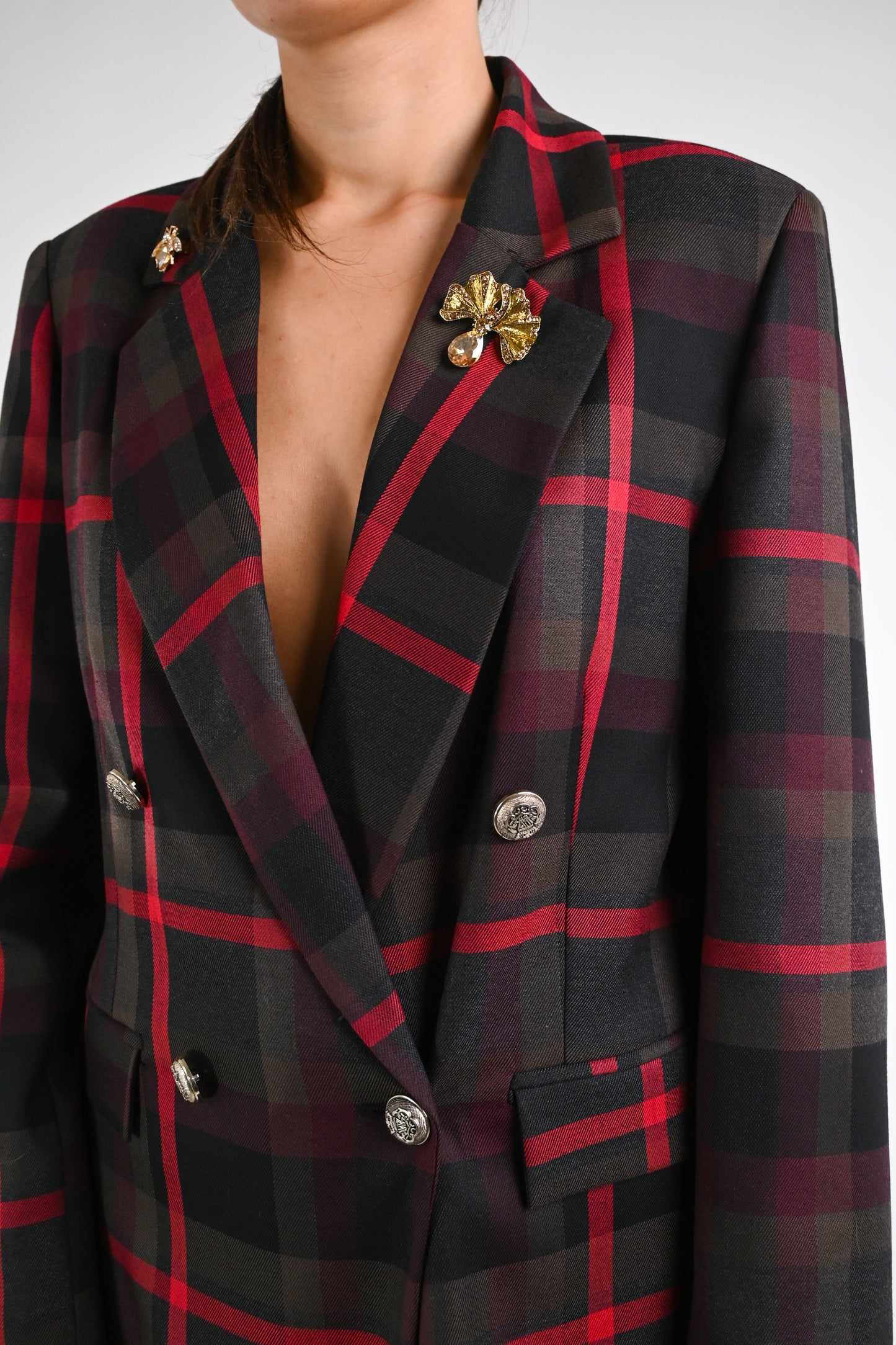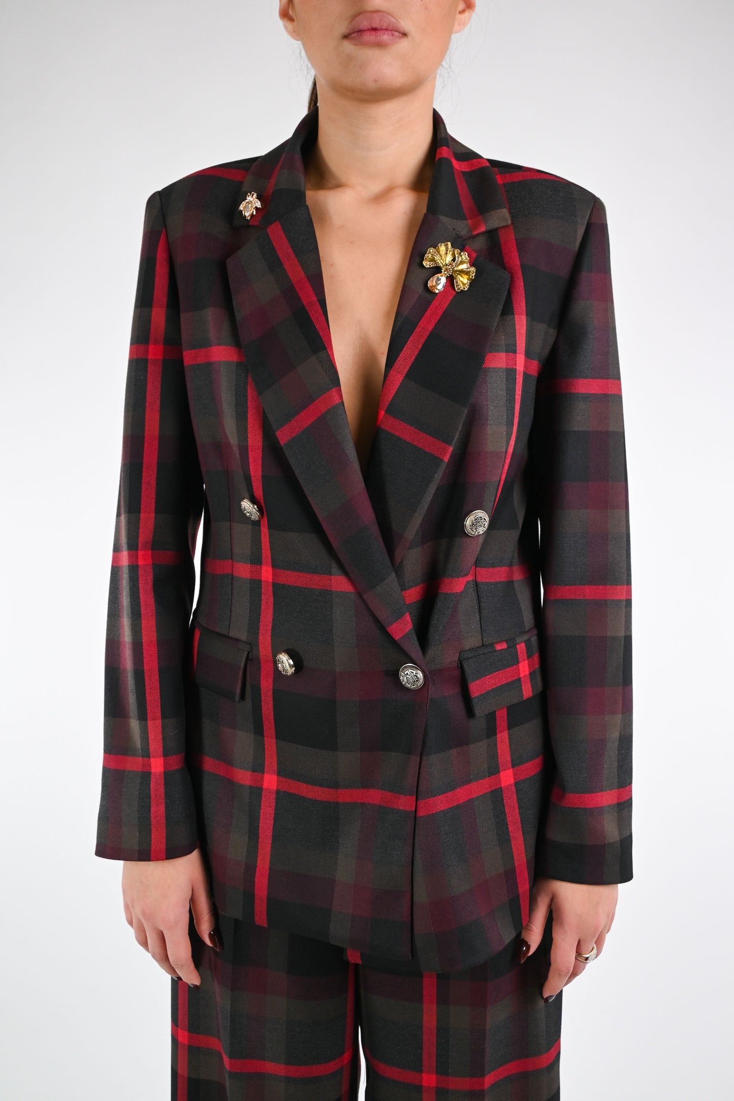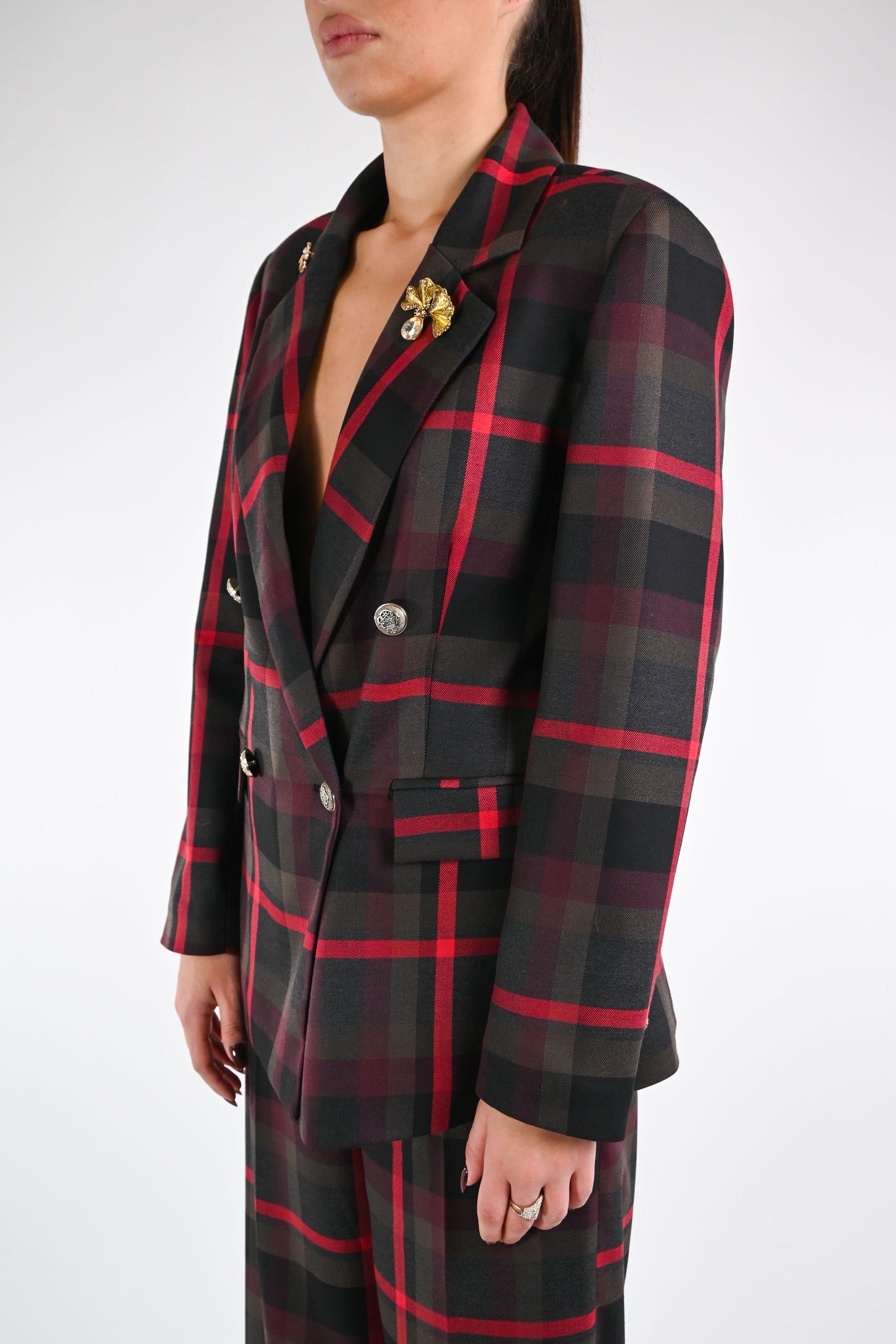 Giacca doppiopetto fantasia a quadri, con bottoni metallo, con spille, foderata, con tasche