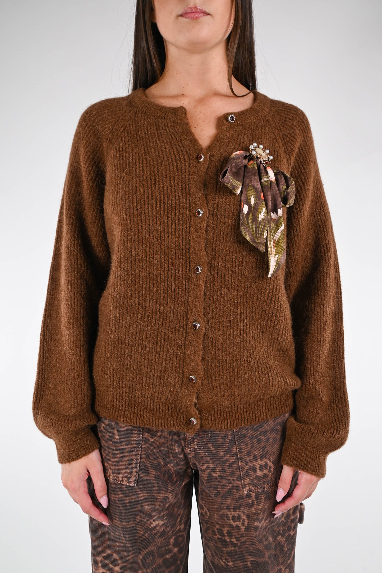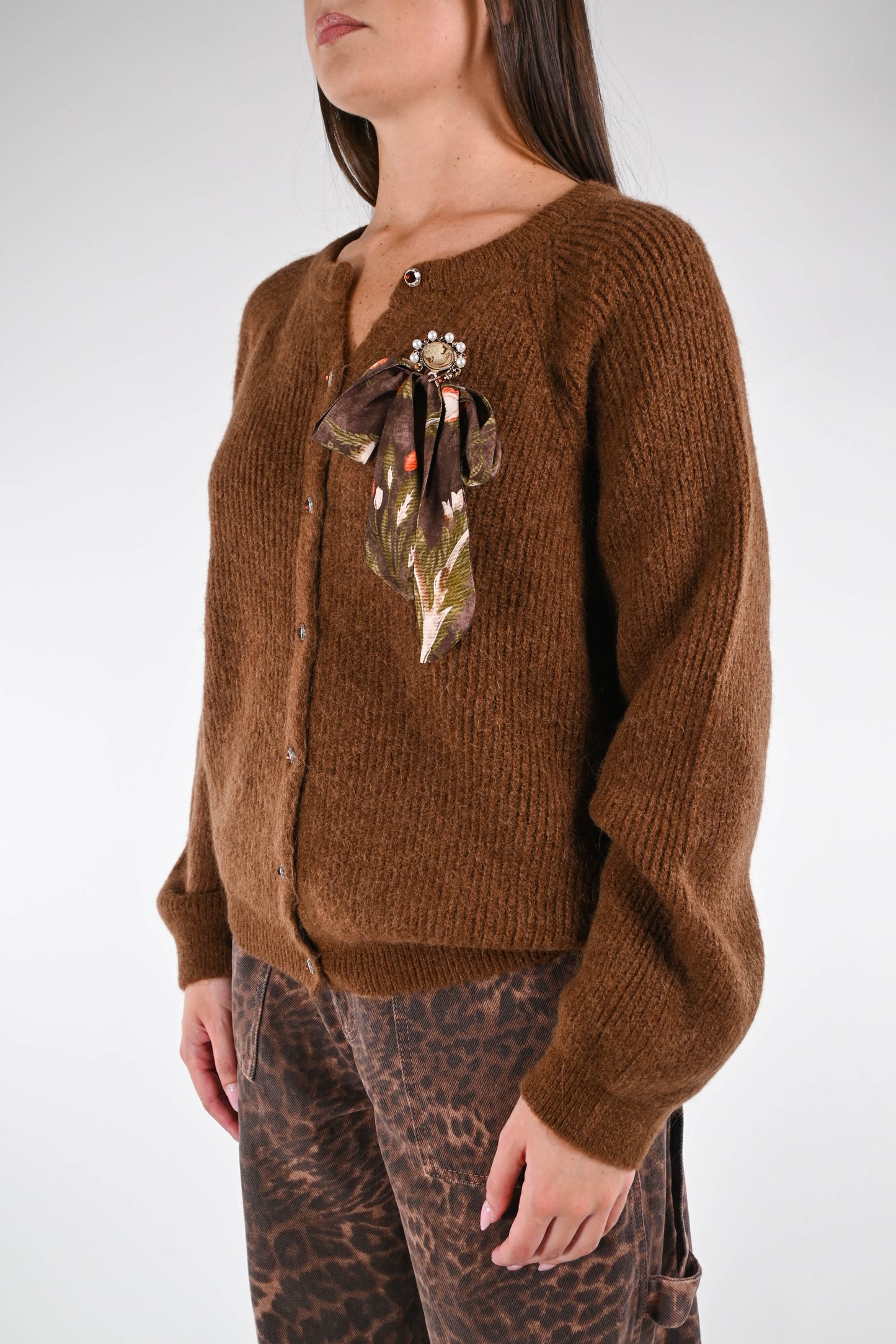 WU'SIDE - CARDIGAN BOTTONI GIOIELLO CON SPILLA CAMEO ART.25676 - TABACCO