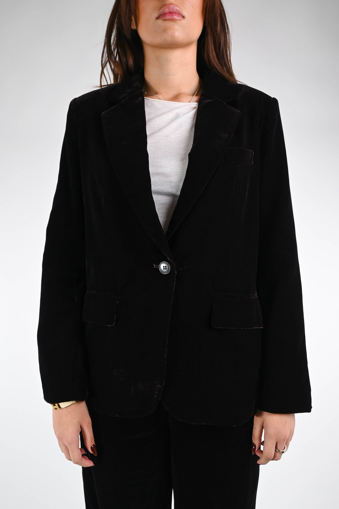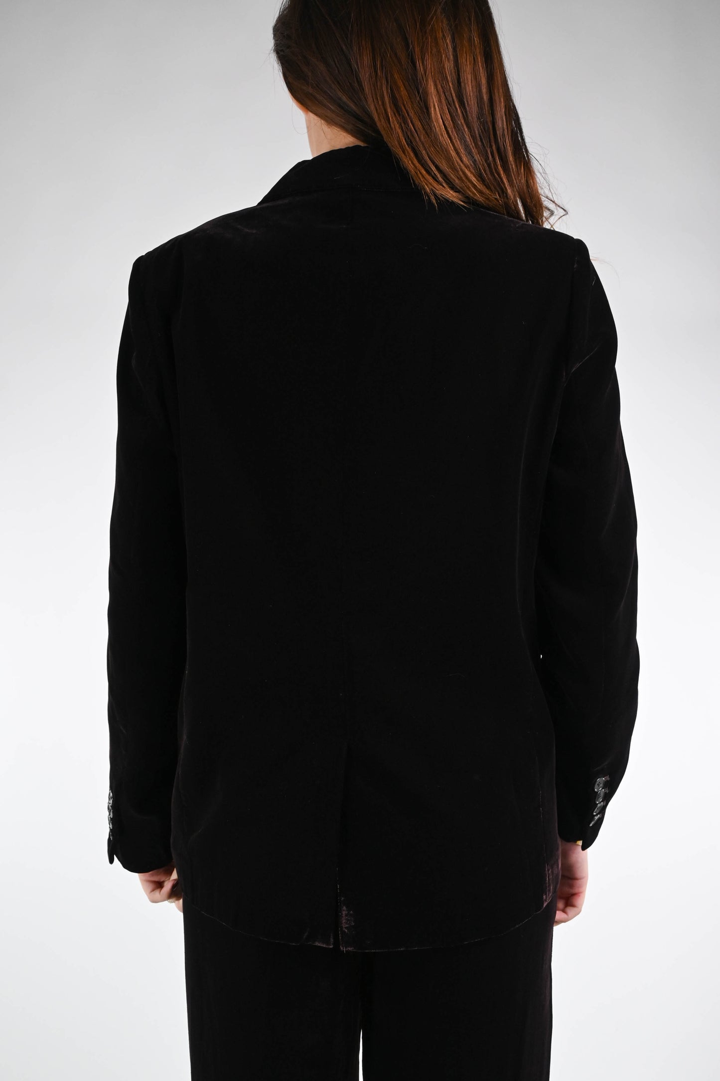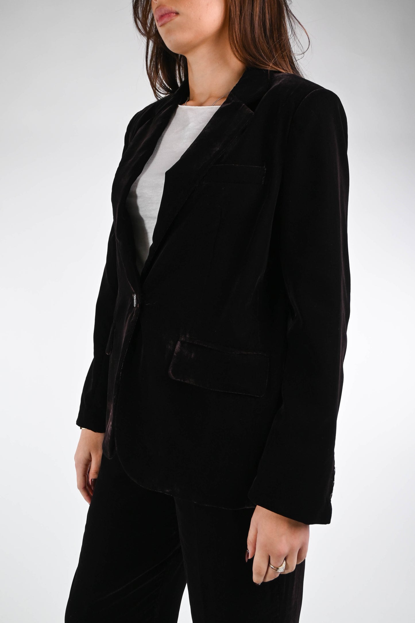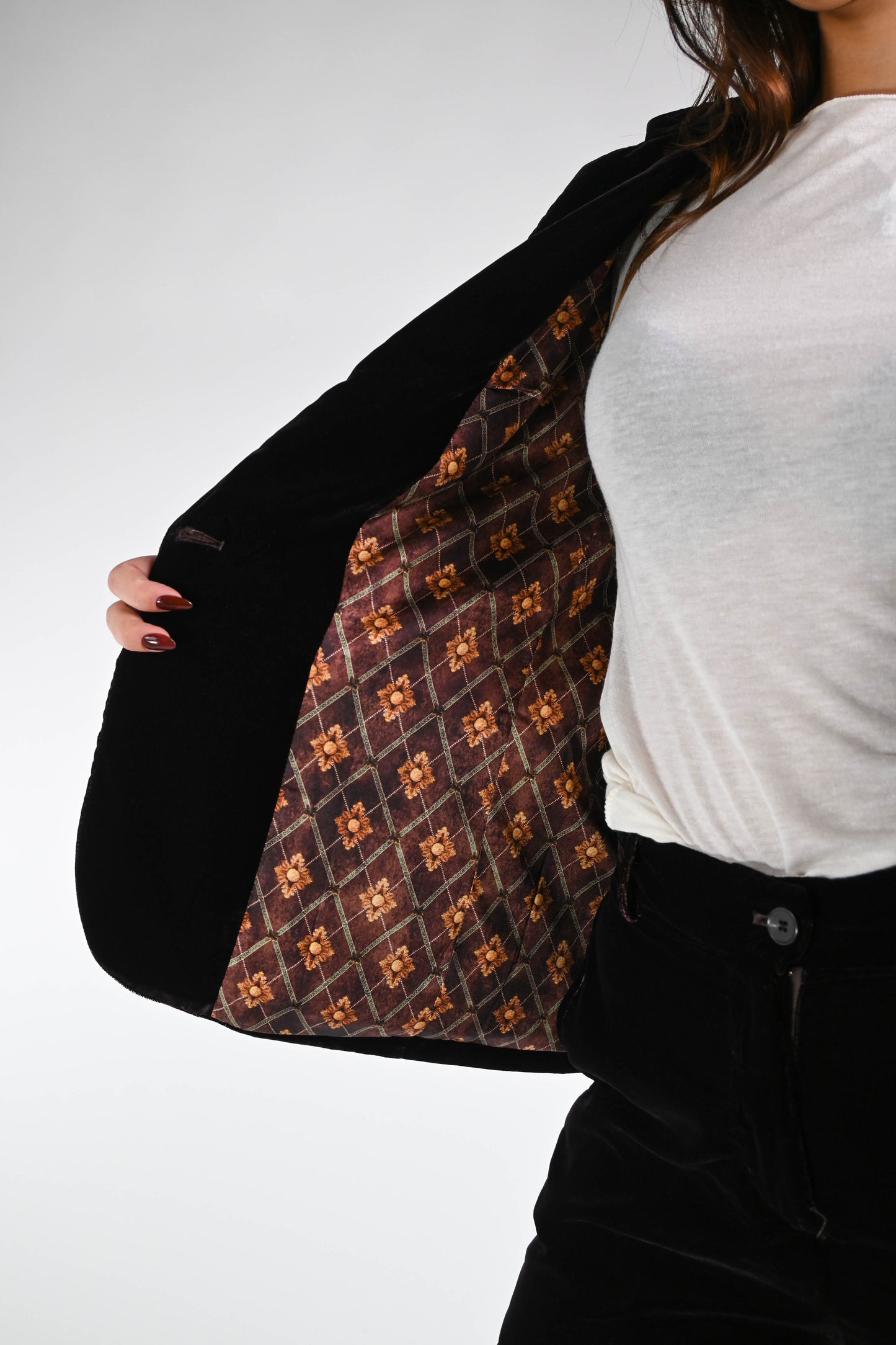 Giacca ad un bottone in morbido velluto liscio, con tasche, con fodera interna floreale, colore moro