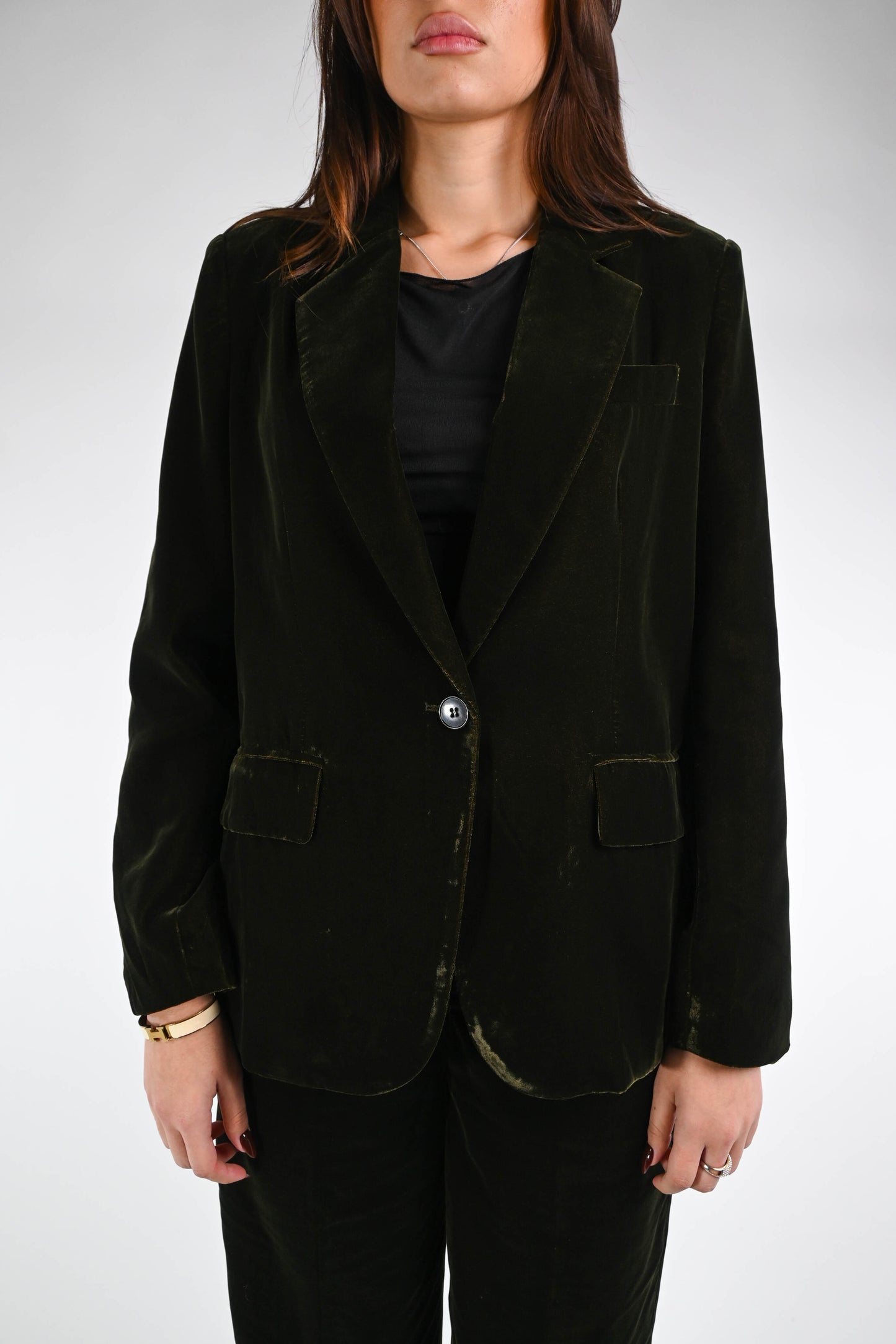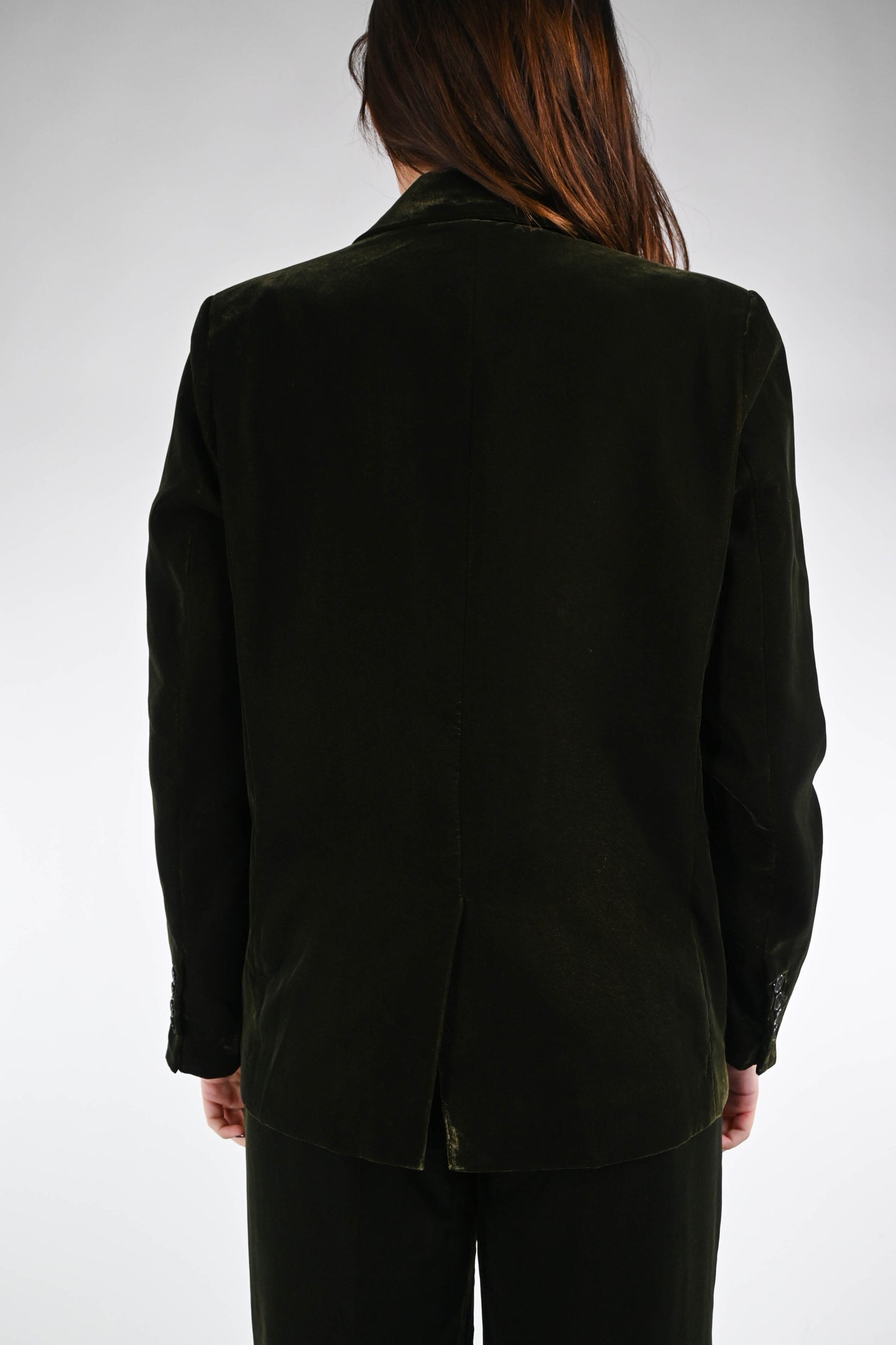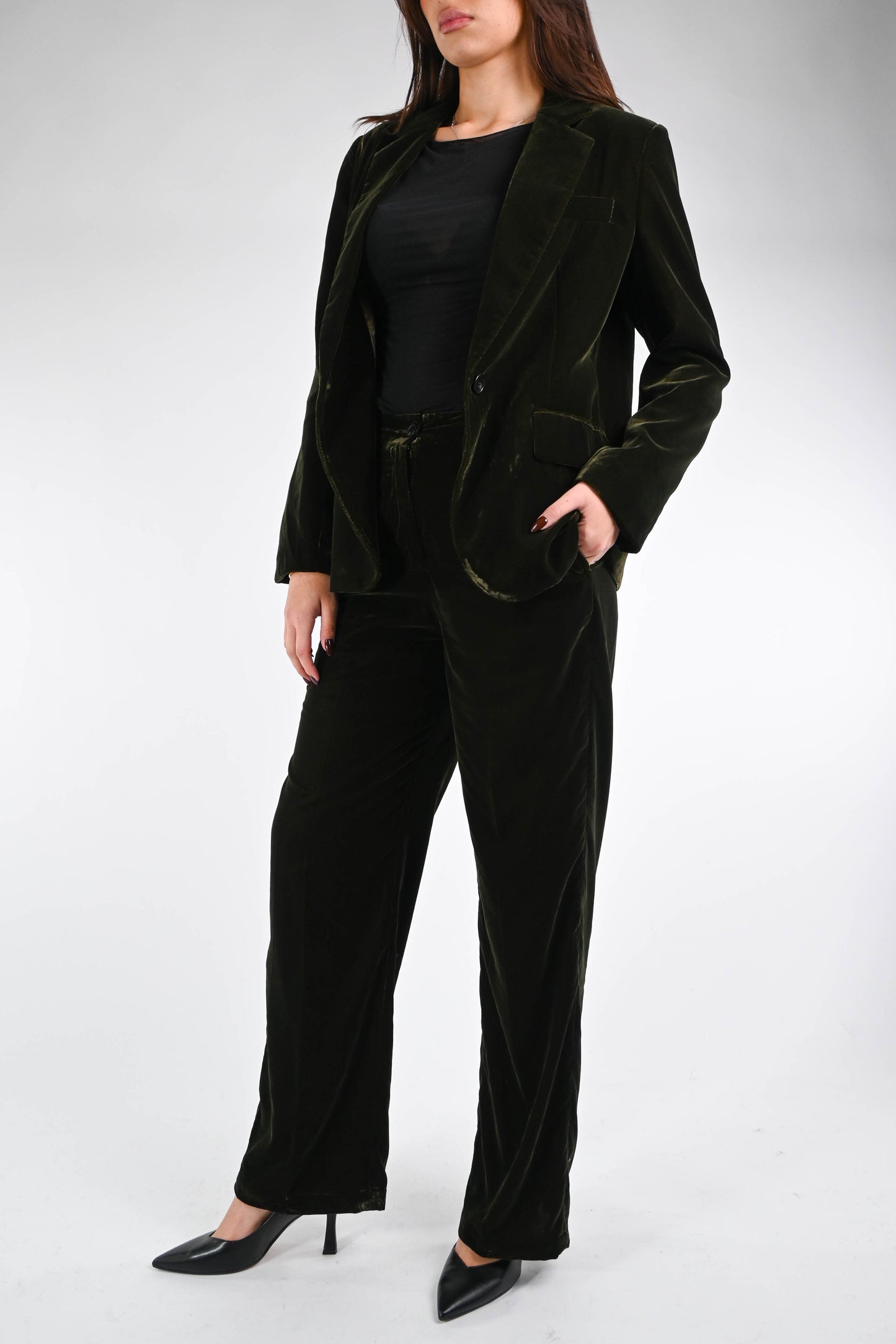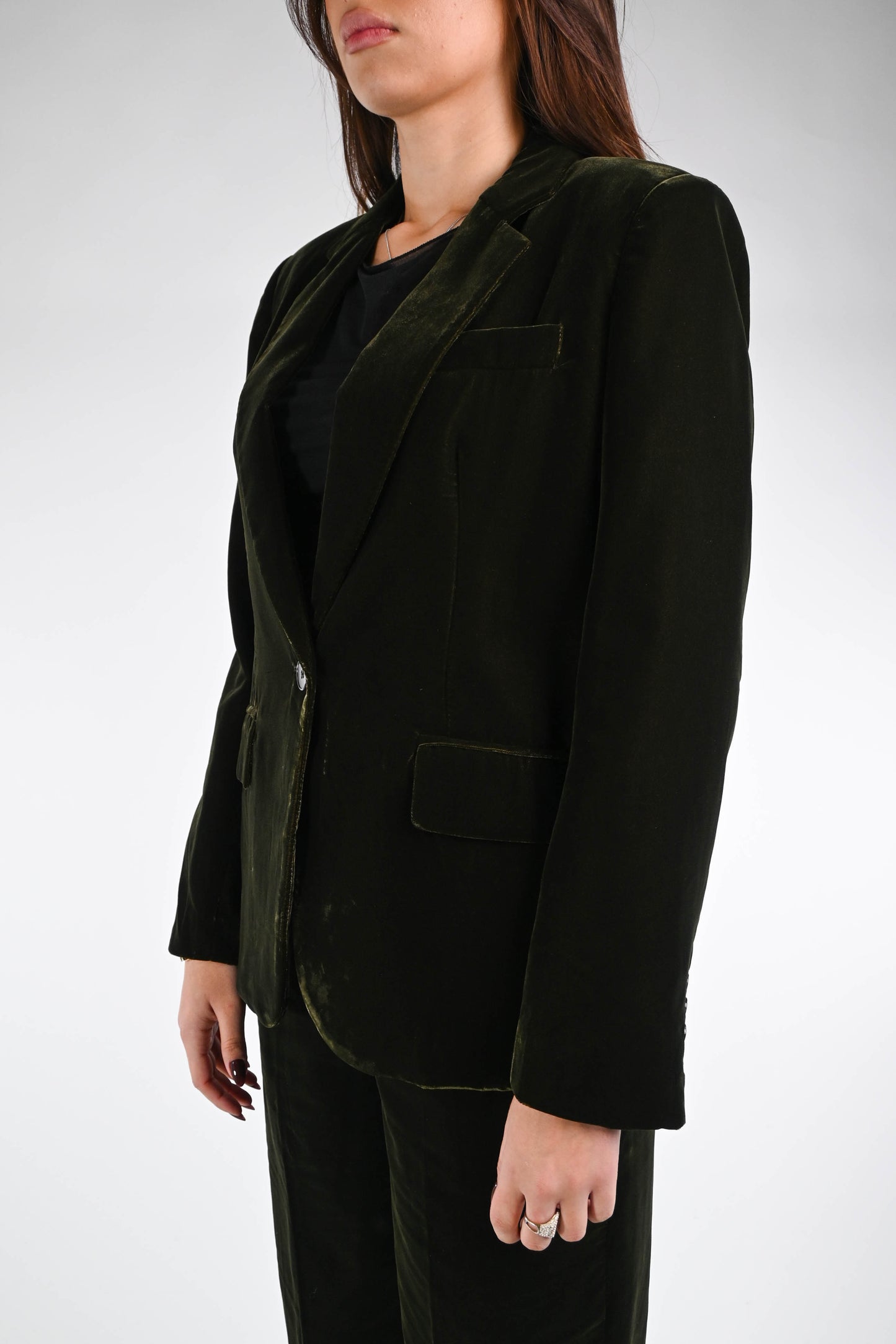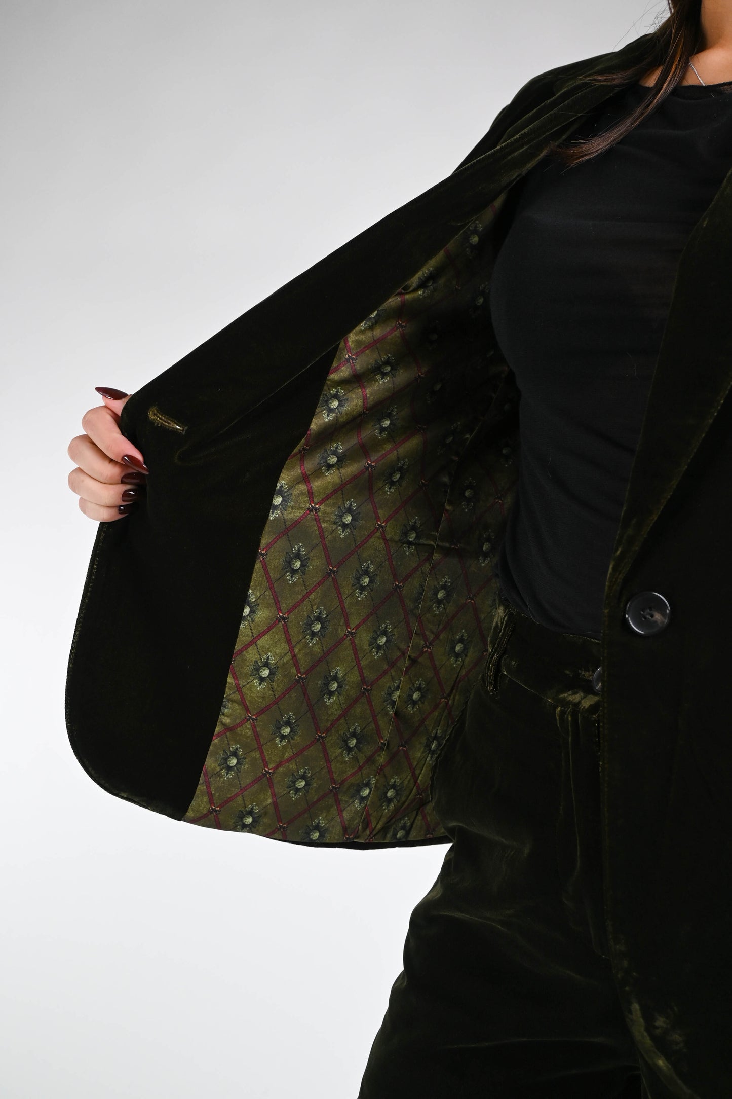Giacca ad un bottone in morbido velluto liscio, con tasche, con fodera interna floreale, colore verde