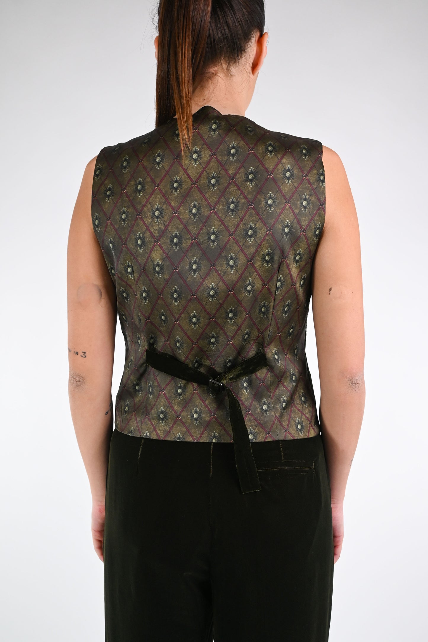 Gilet 4 bottoni in morbido velluto liscio, con tasche, con raso sulla schiena fantasia floreale, colore verde