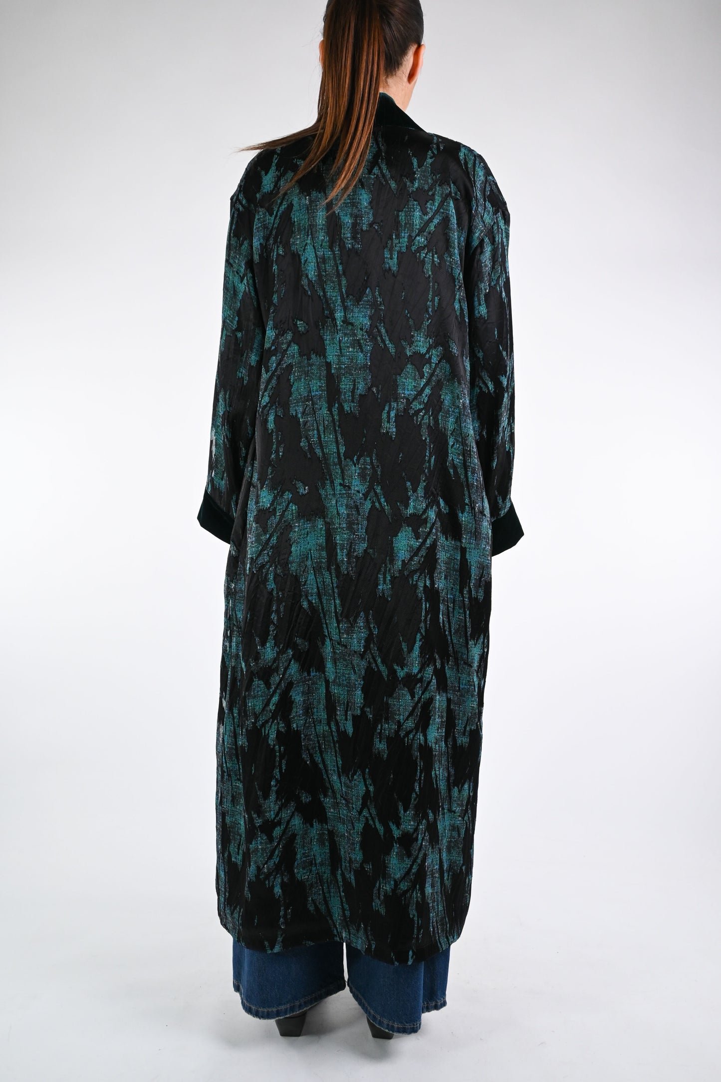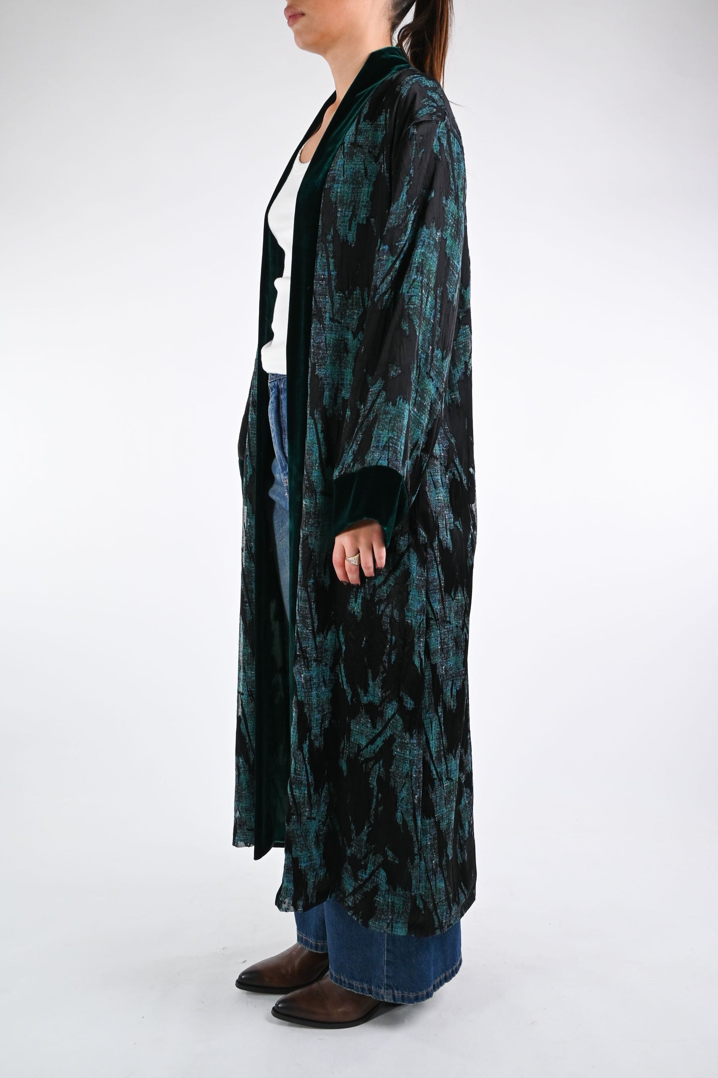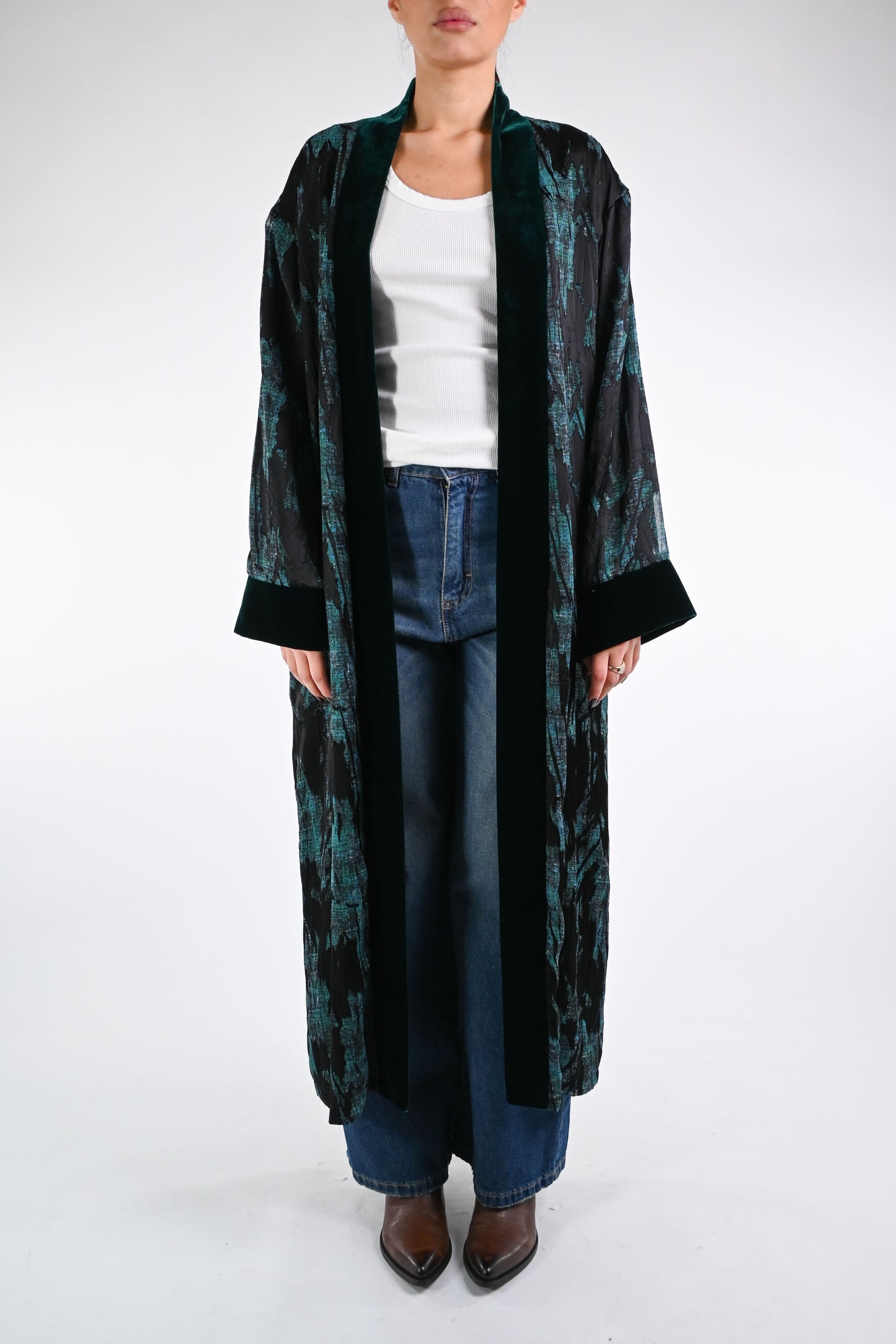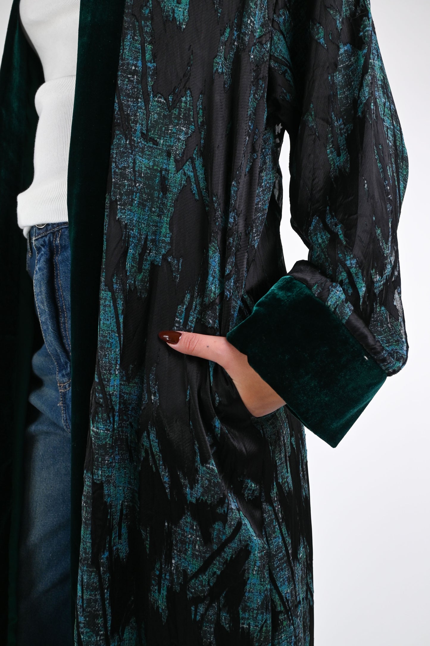 Kimono lungo in tessuto devorè fantasia floreale, manica con bordo in velluto liscio, con tasche a filo, con fodera tinta unica, colore nero/petrolio