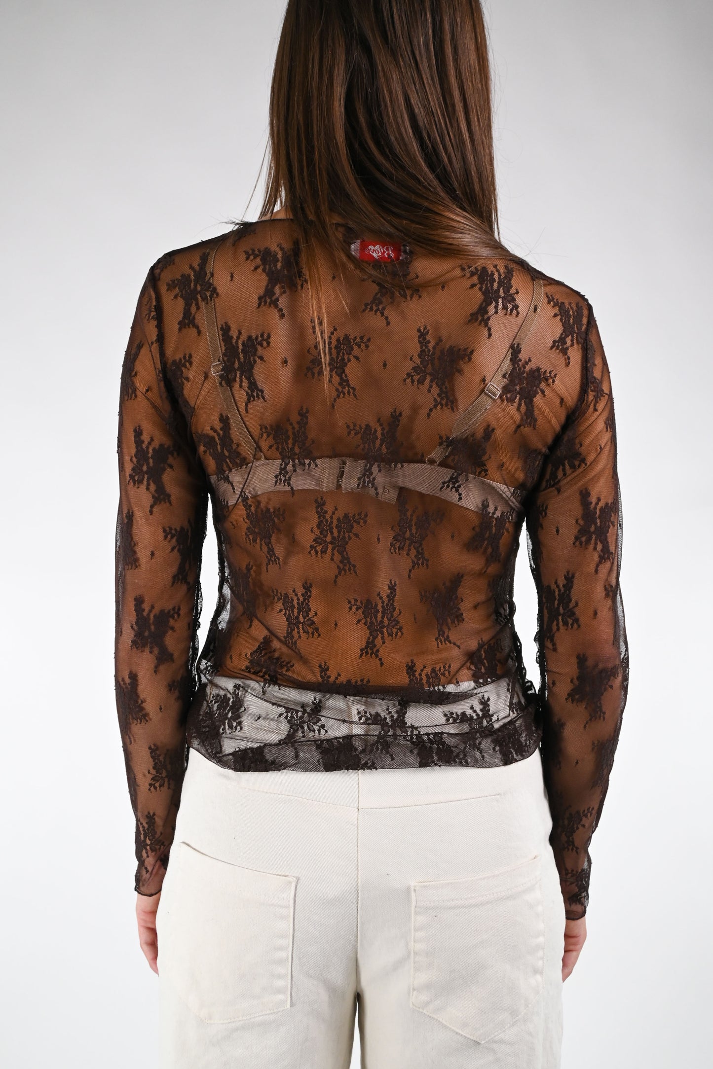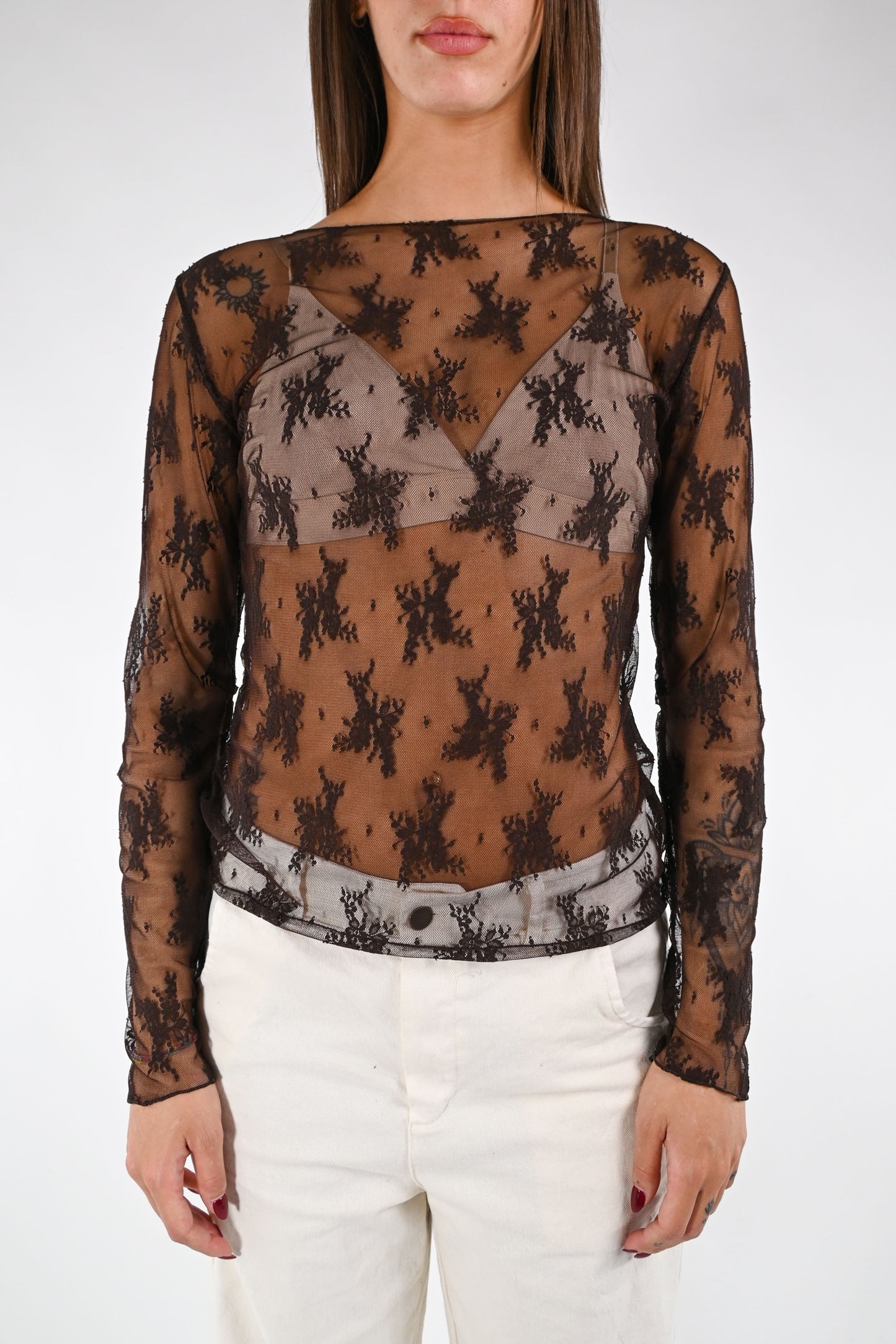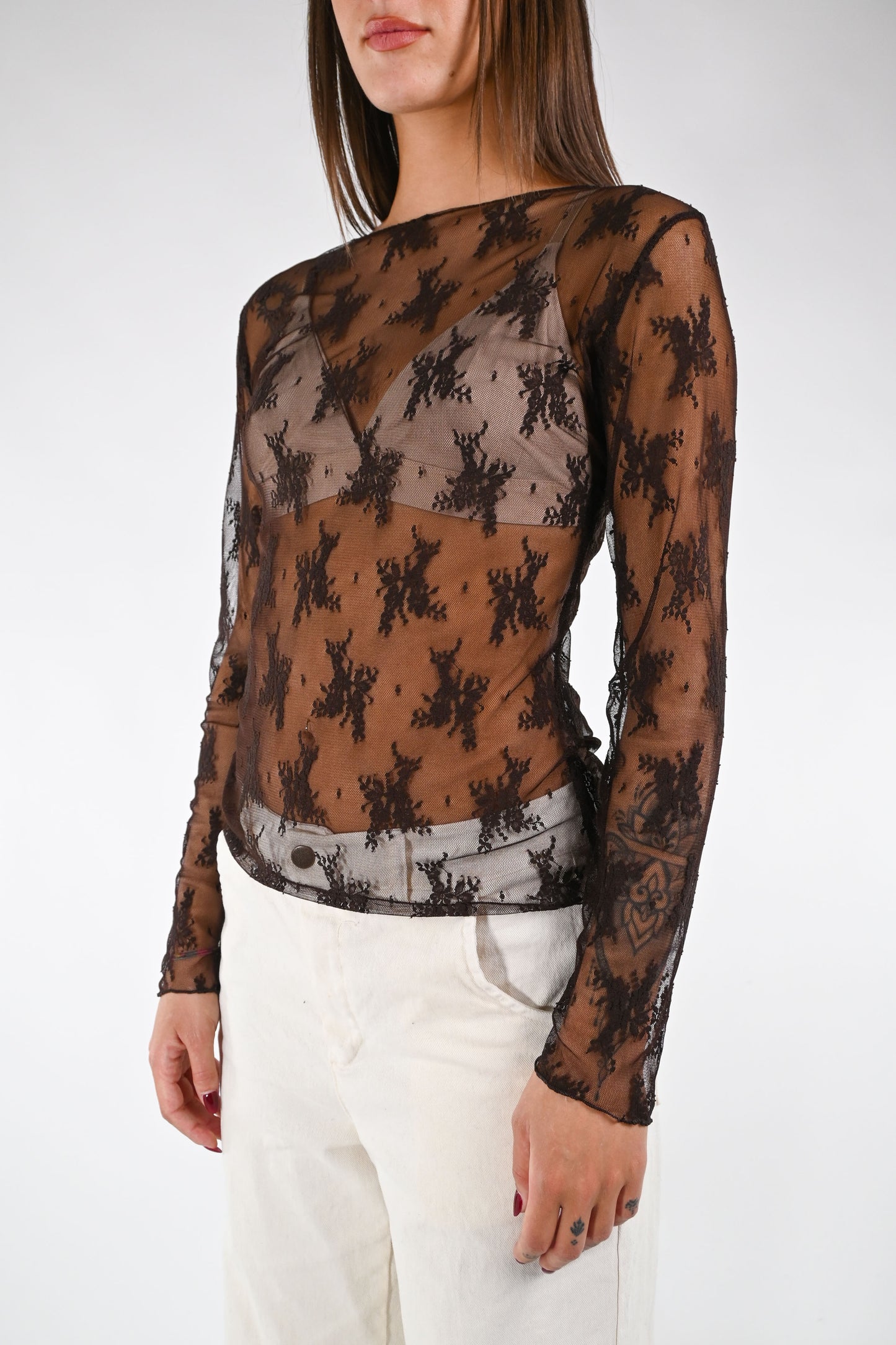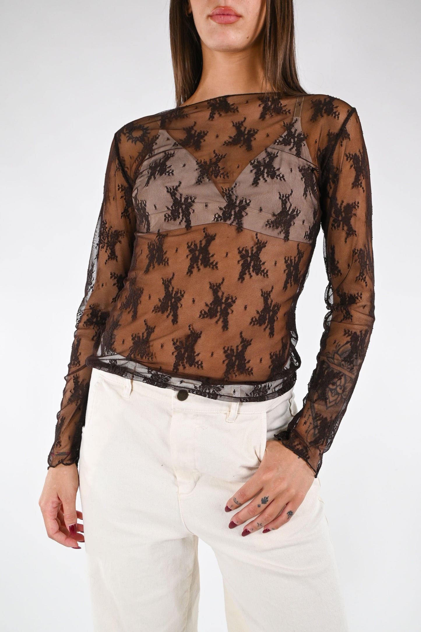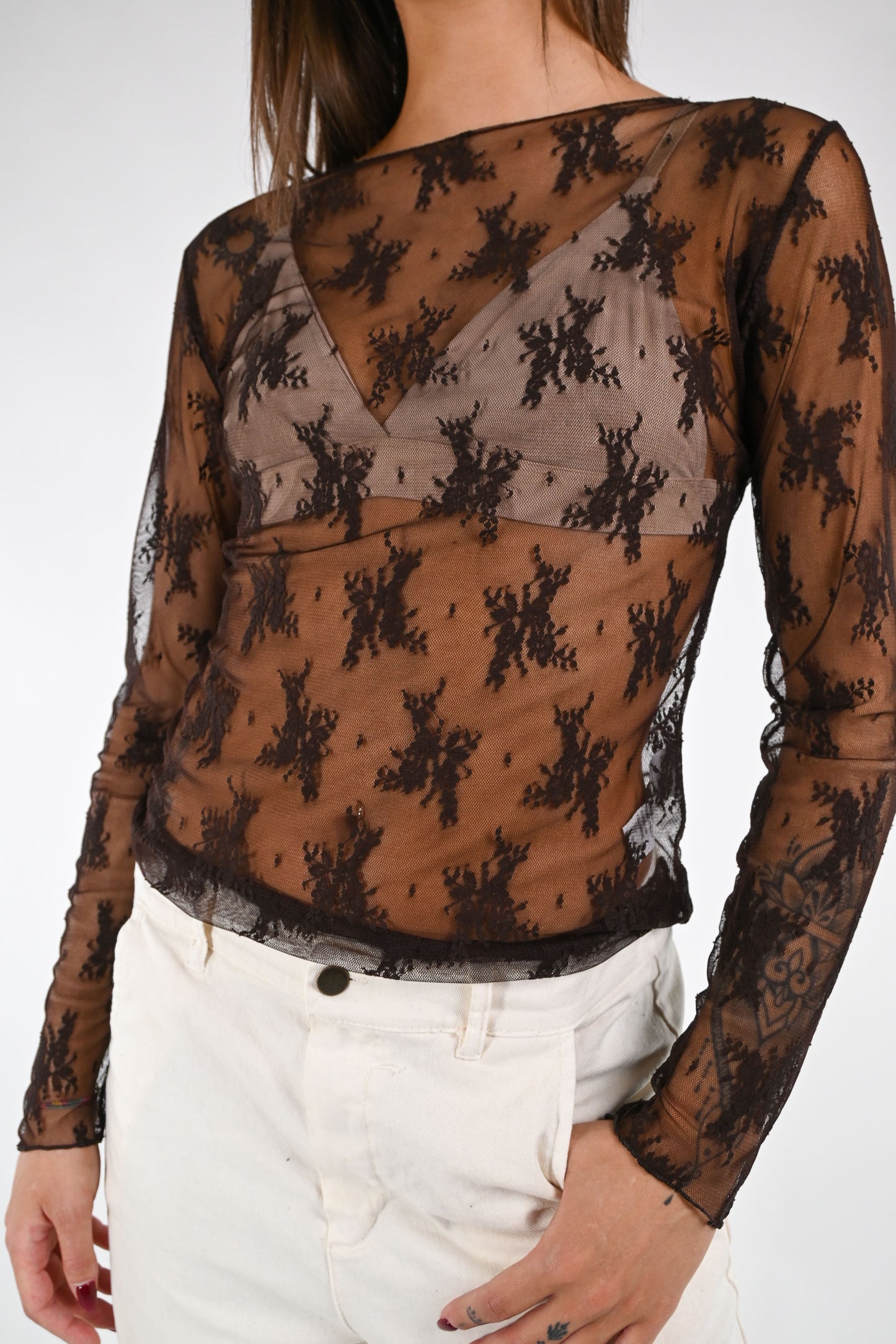 Blusa scollo barchetta in pizzo, manica lunga, colore moro