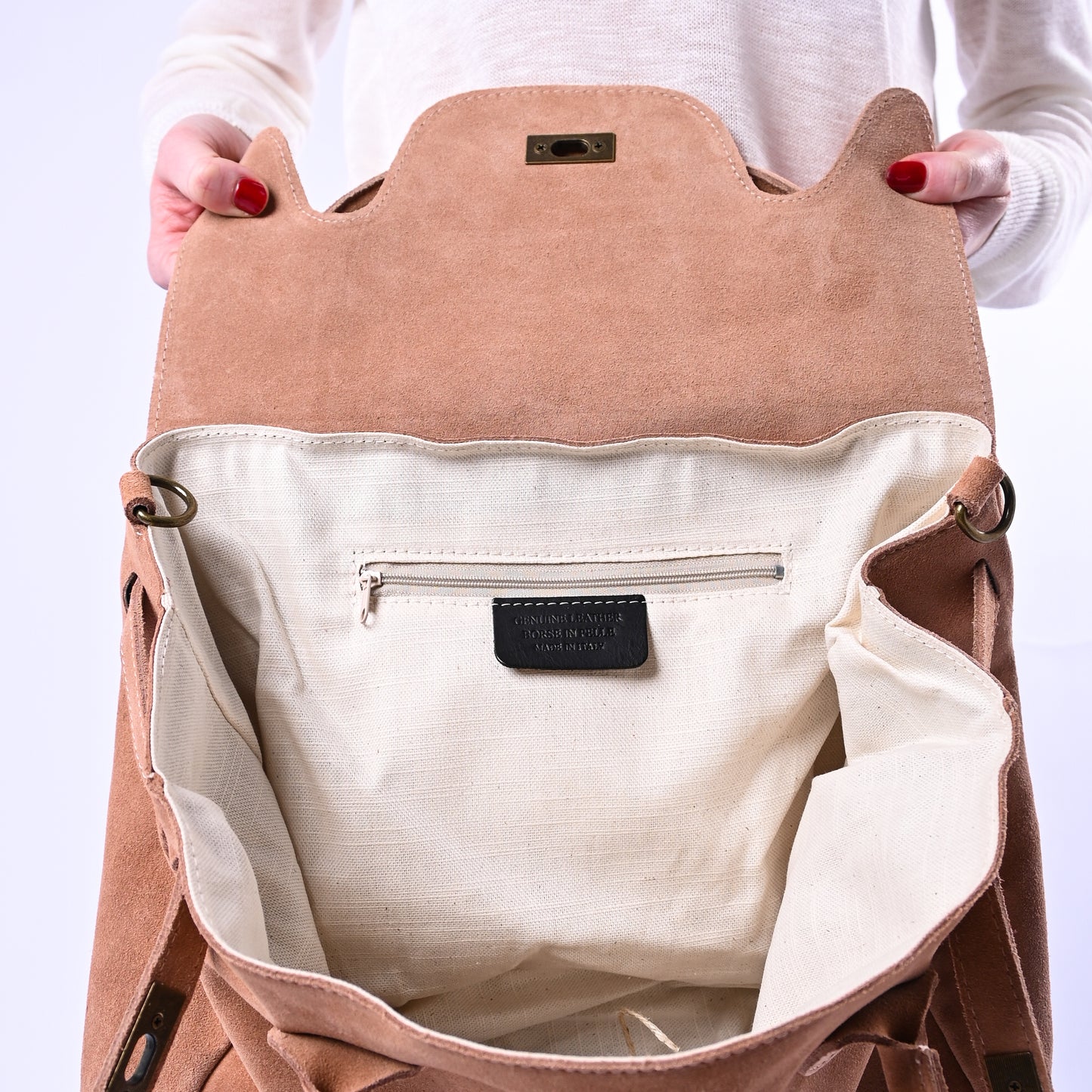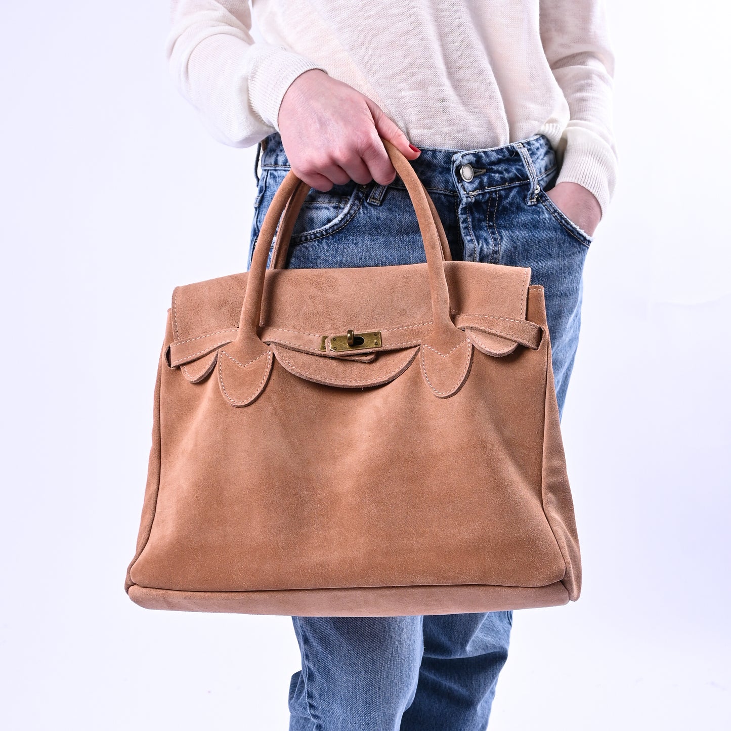Borsa misura media Kelly in camoscio con chiusura in ottone, un dettaglio che conferisce carattere e durabilità. Manici e tracolla regolabile la rendono comoda e adatta a molteplici situazioni, mantenendo un'estetica sobria e raffinata.