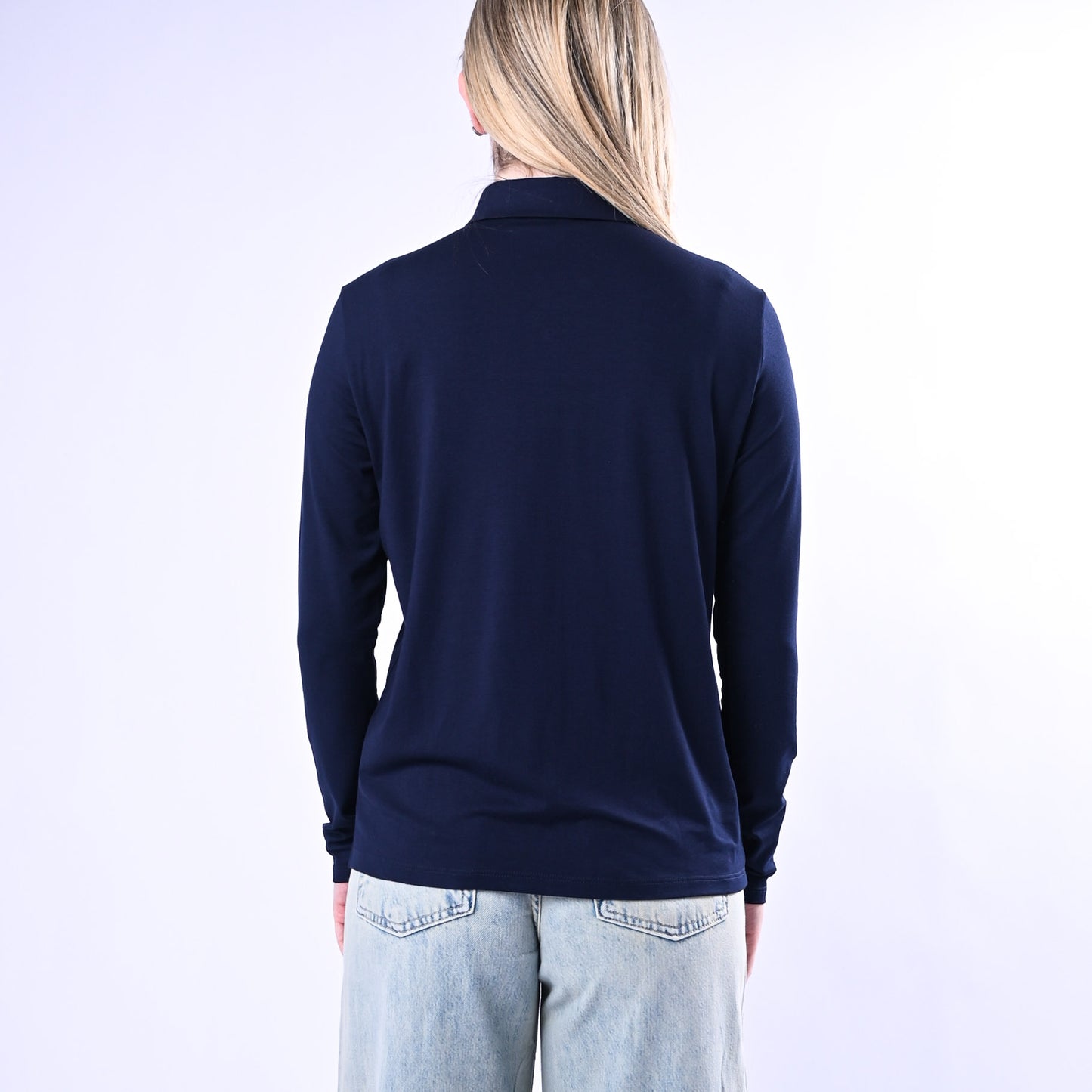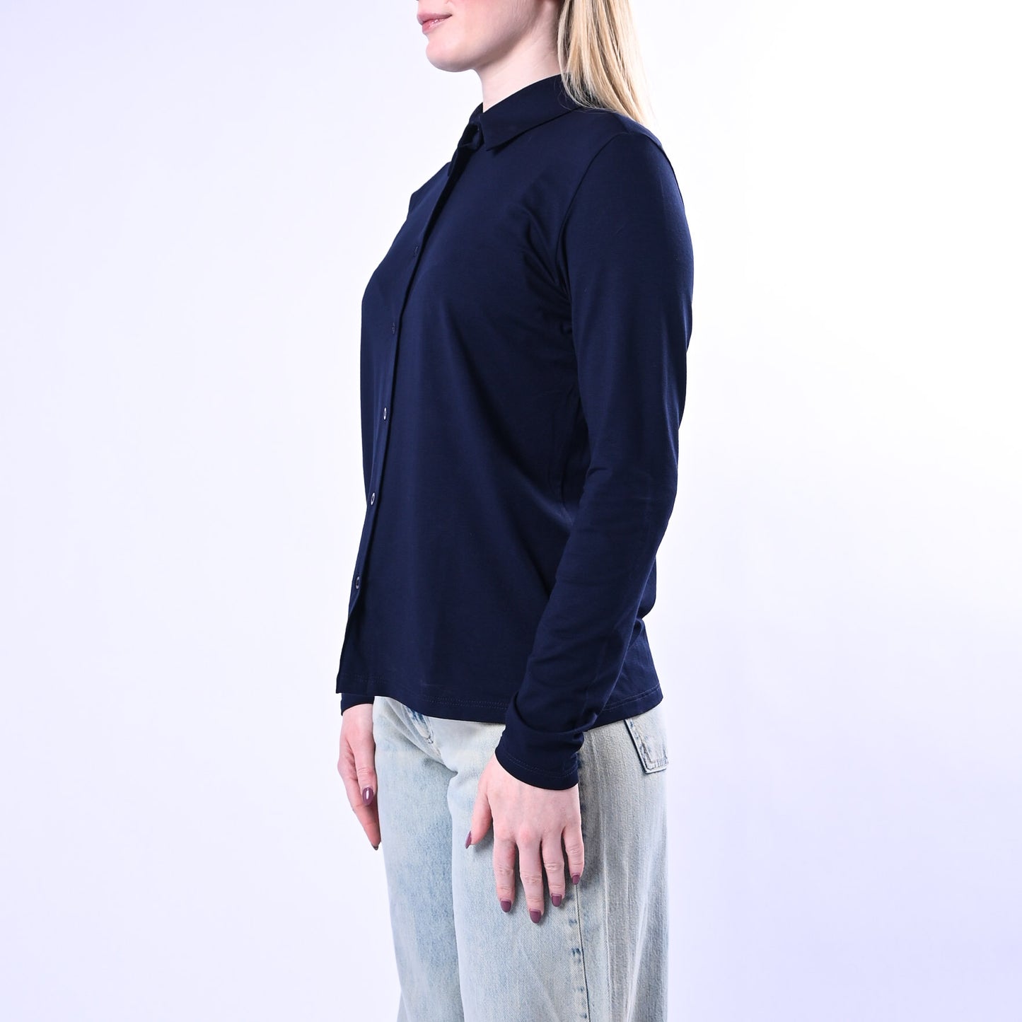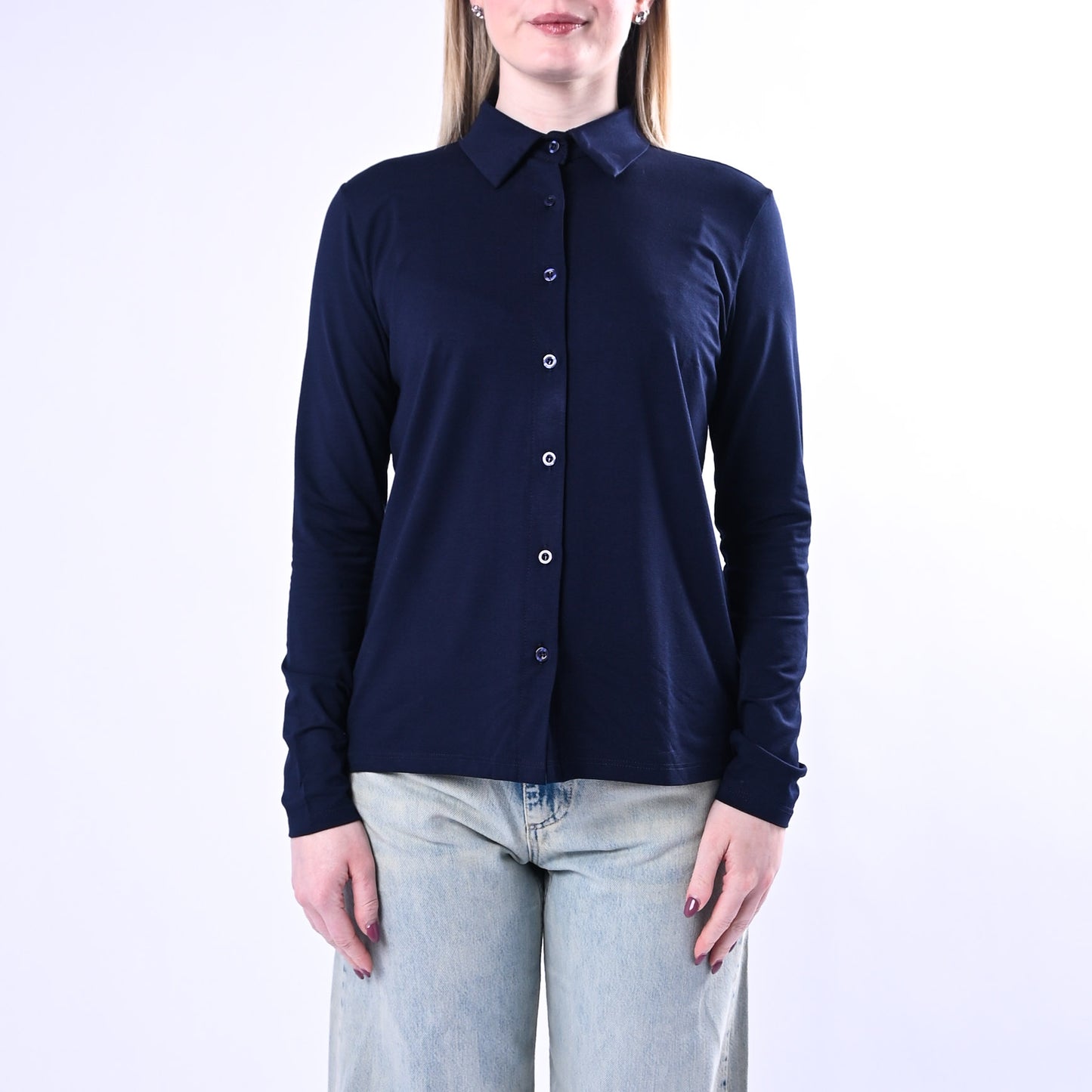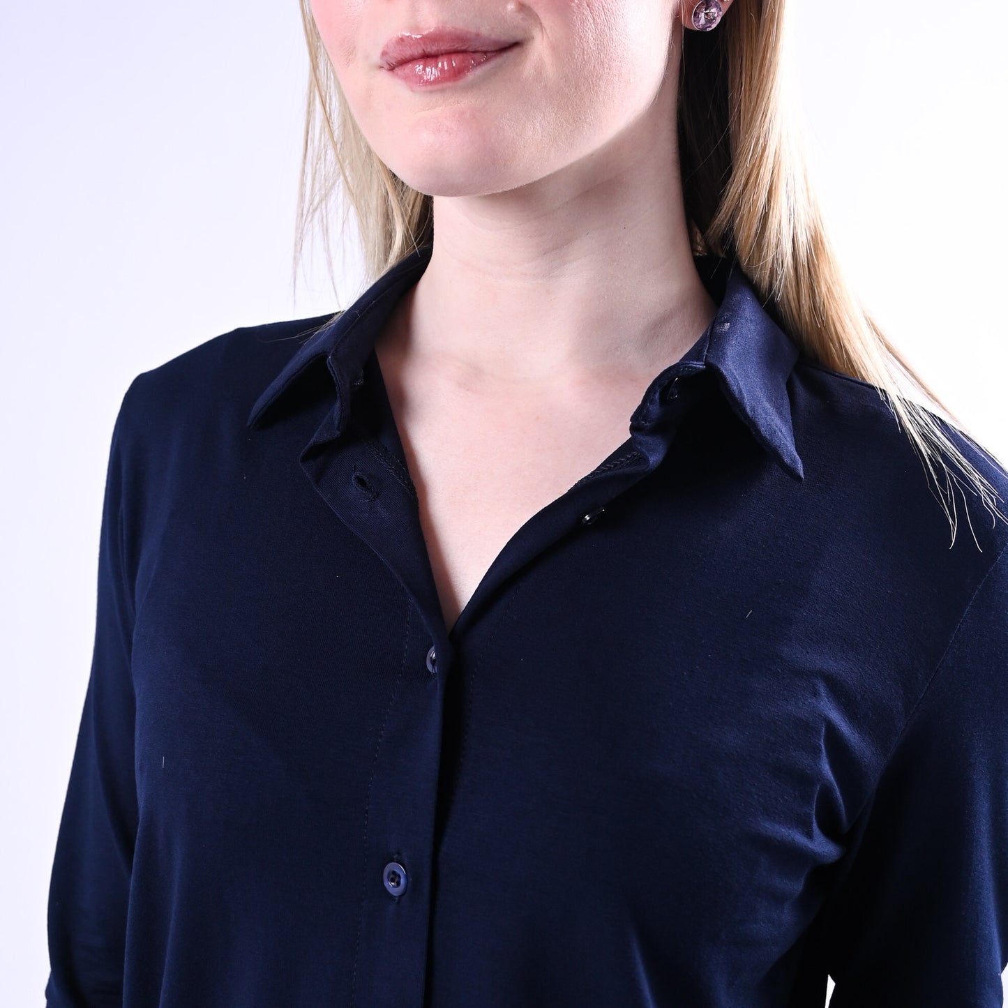 Camicia Olivia in jersey elasticizzato con colletto e bottoni coordinati in tinta. Comfort e eleganza in un capo versatile.