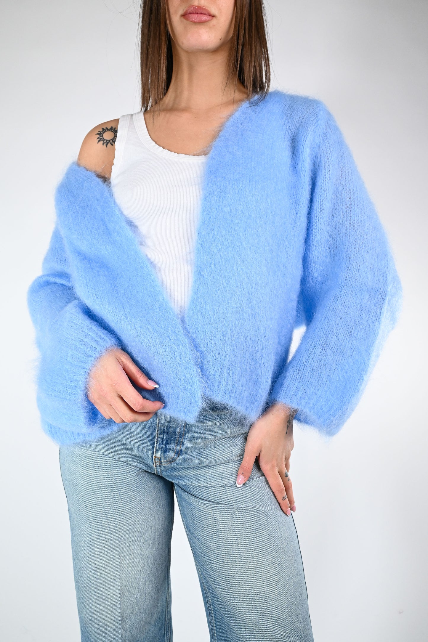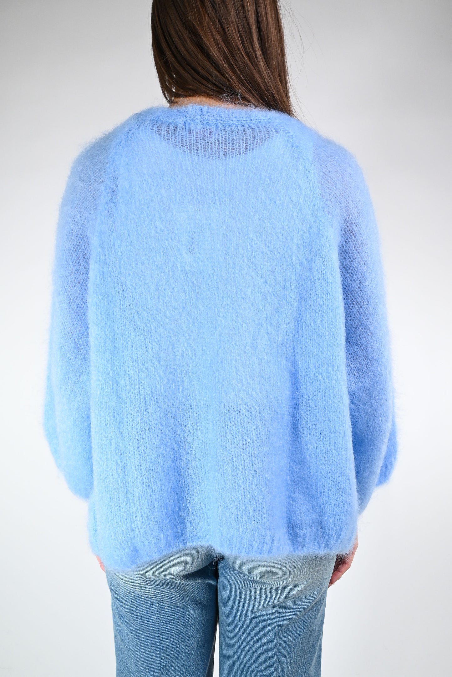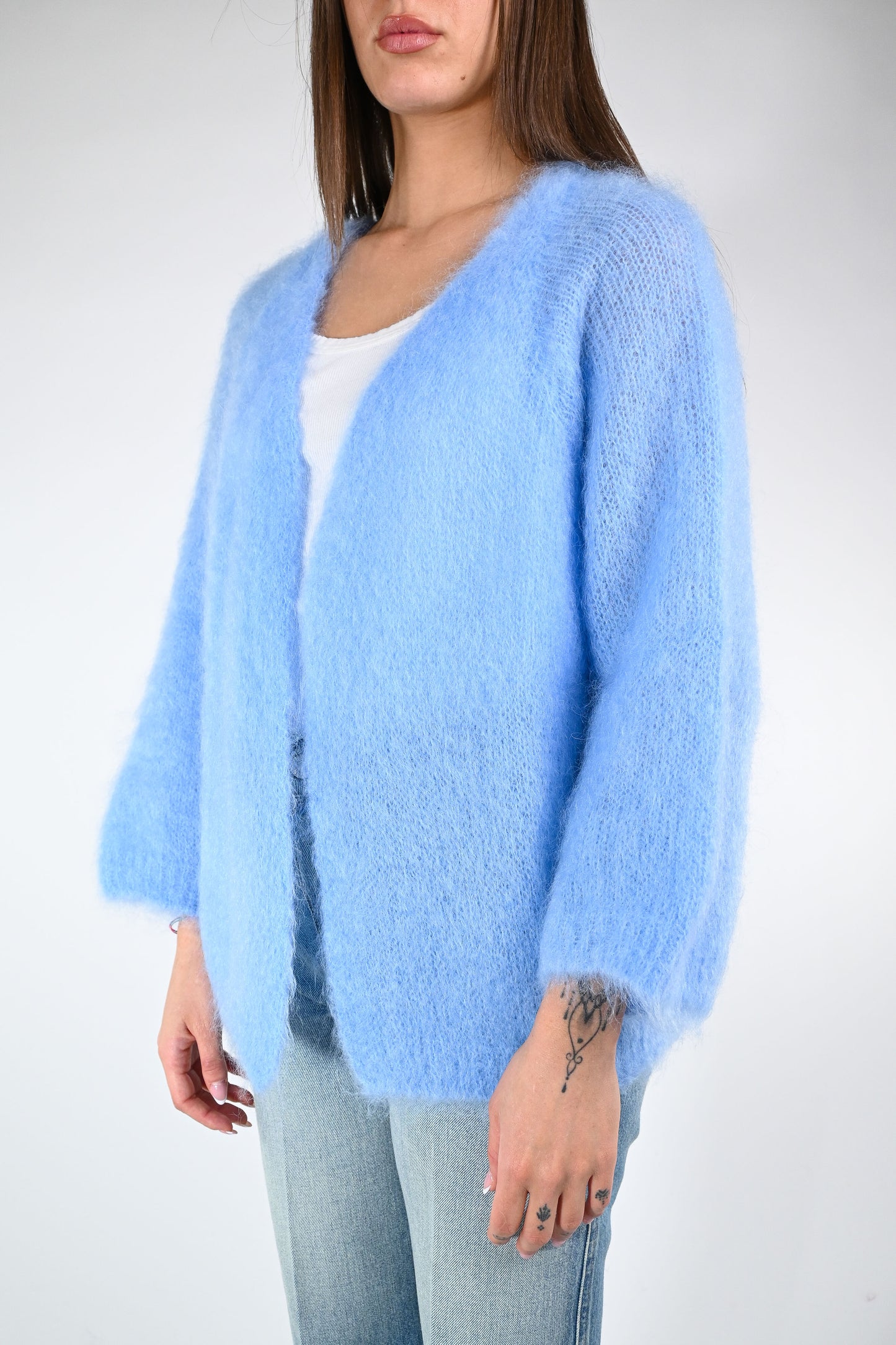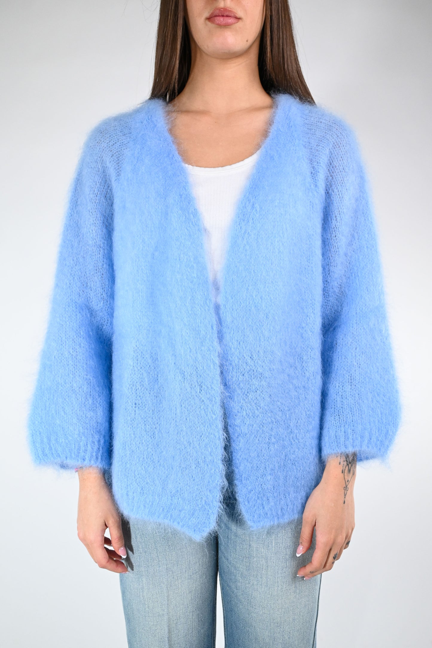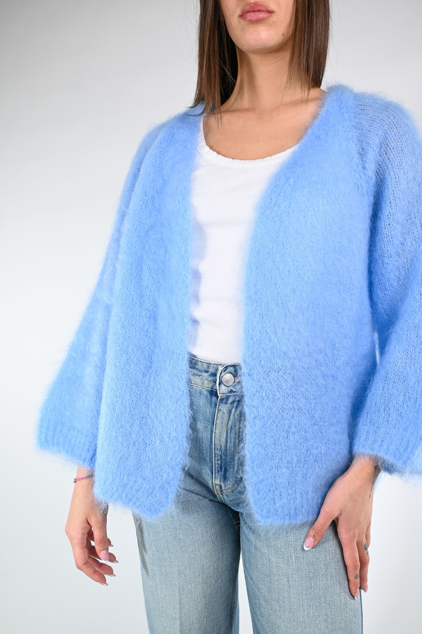 Cardigan over in kid mohair, senza bottoni, manica 7/8 ampia, color celeste