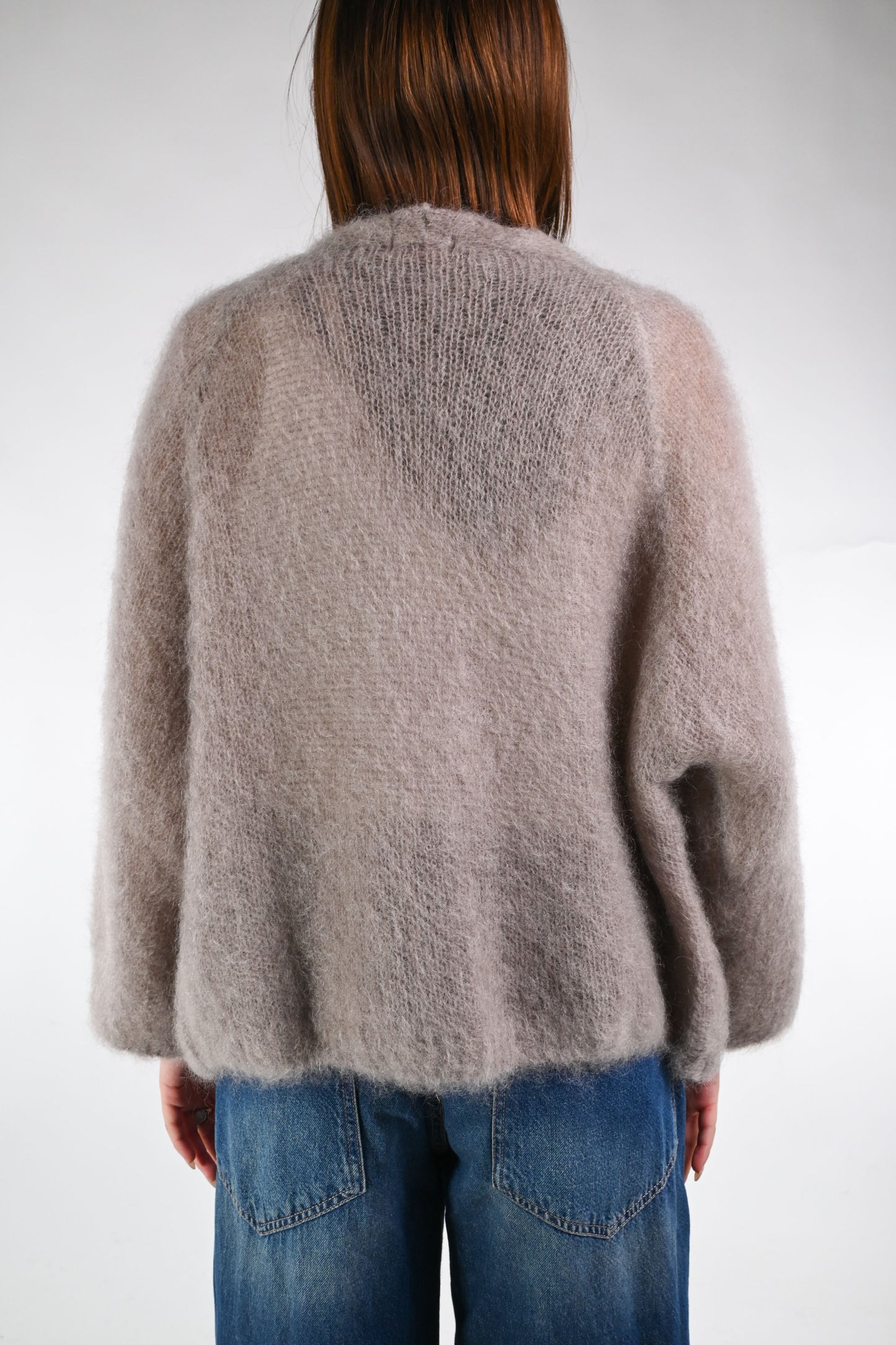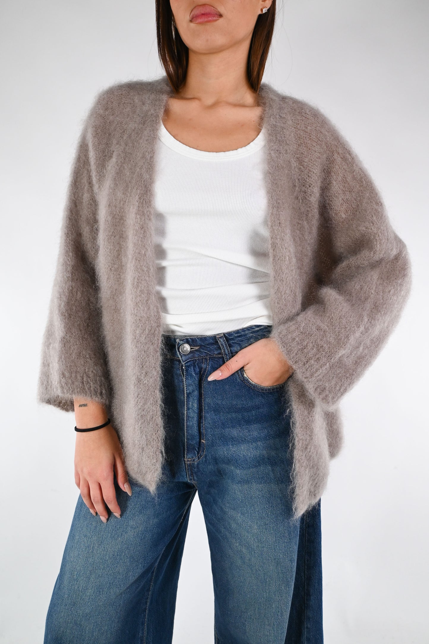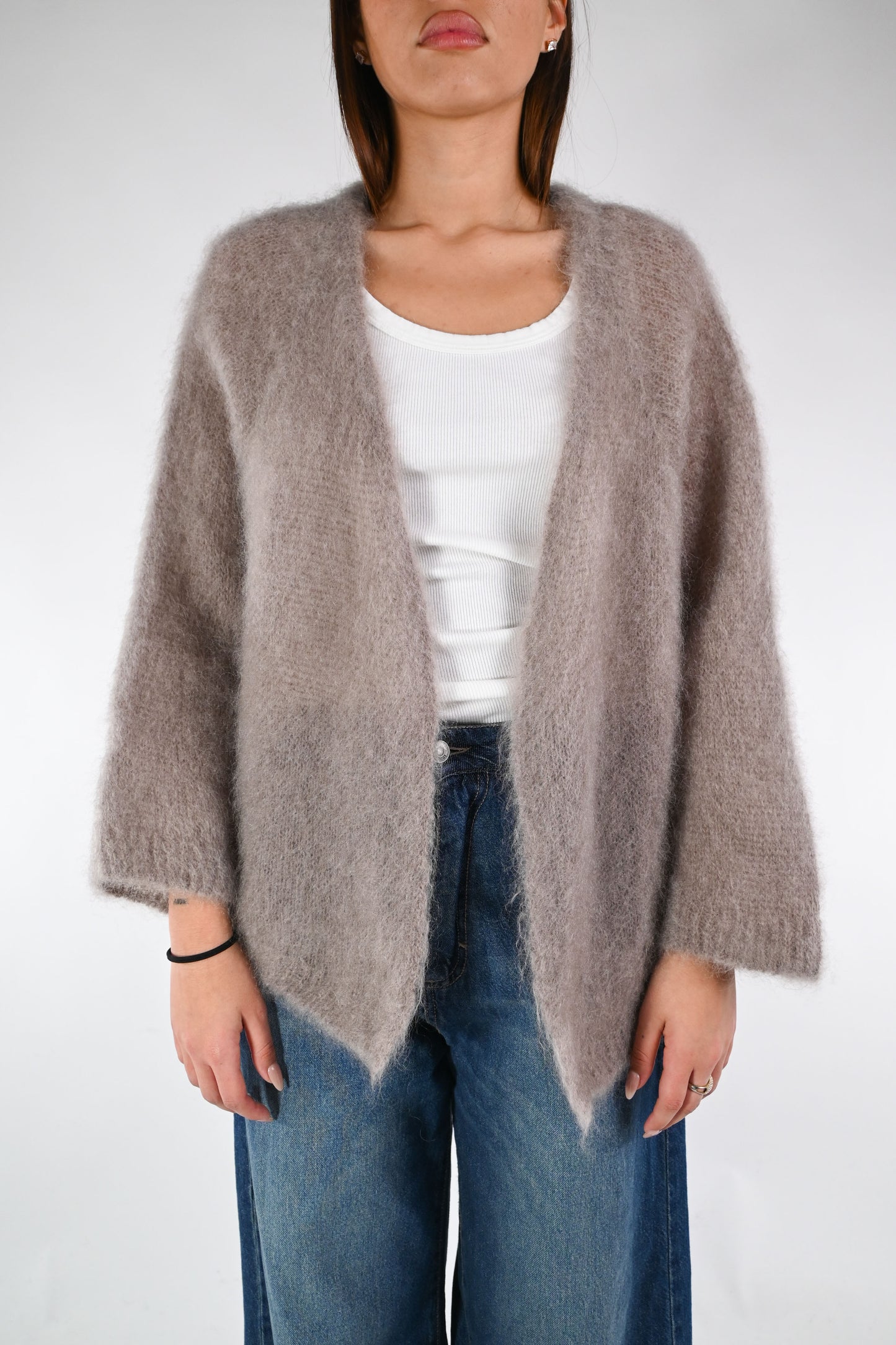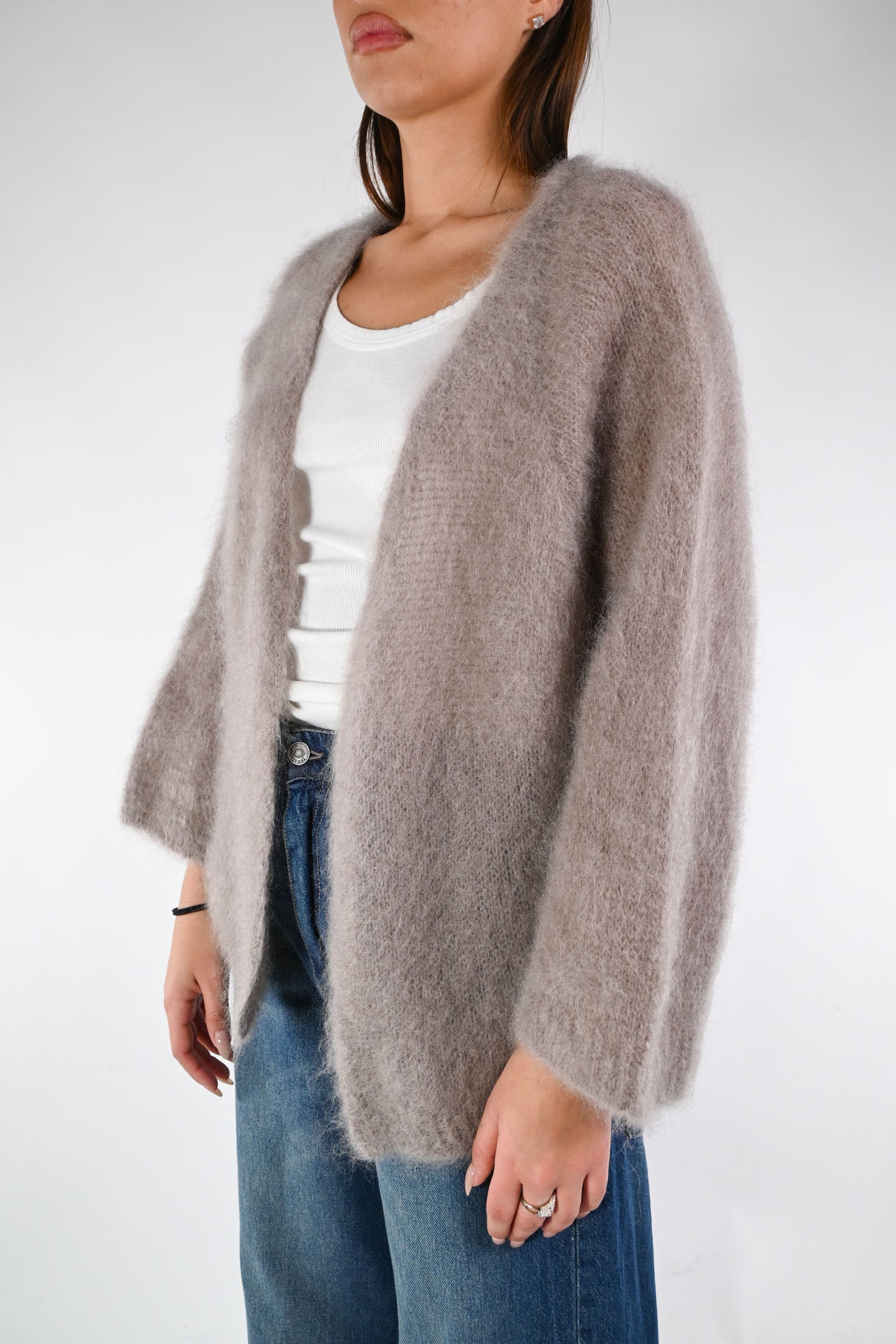 Cardigan over in kid mohair, senza bottoni, manica 7/8 ampia, color Fango