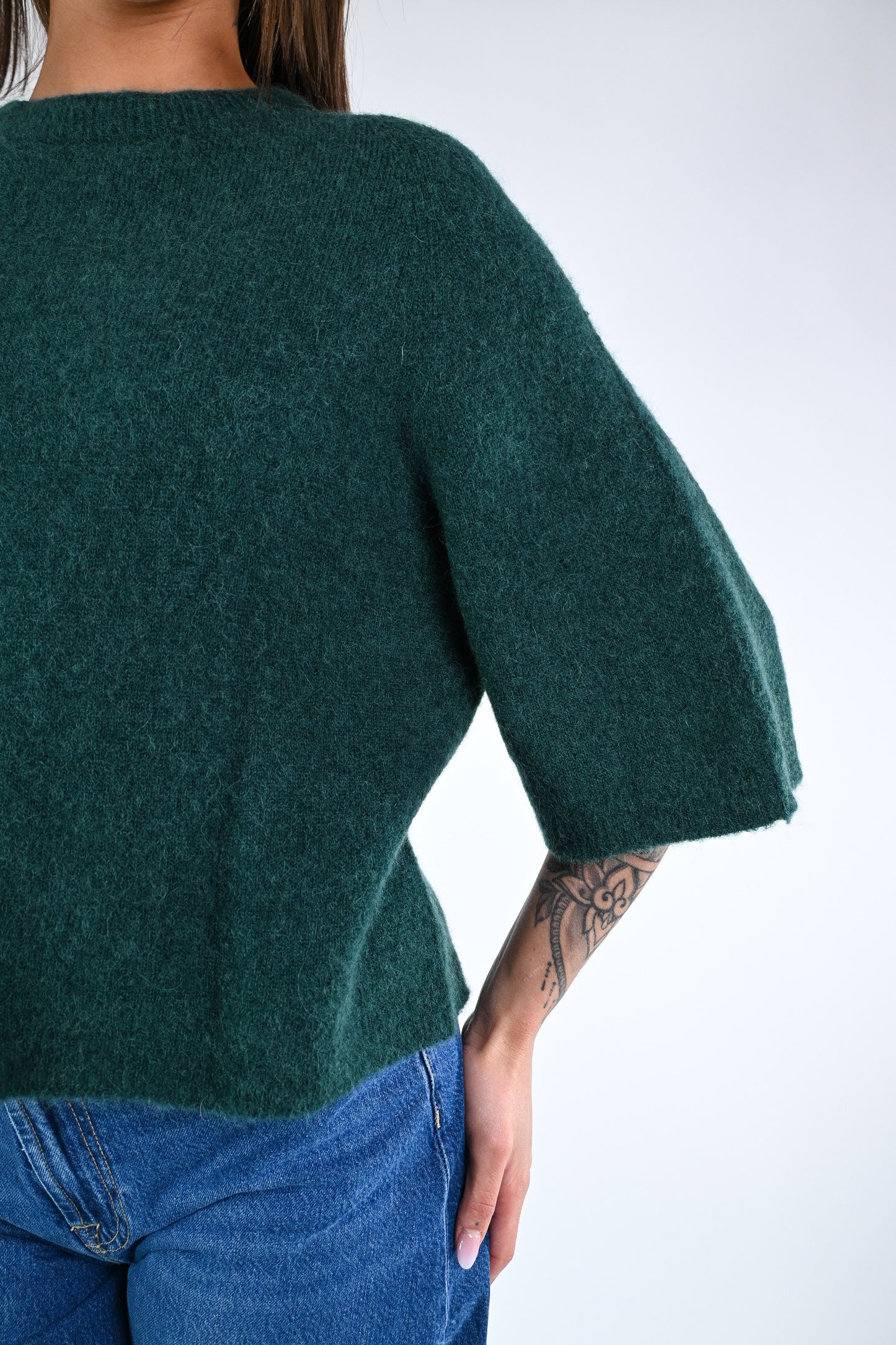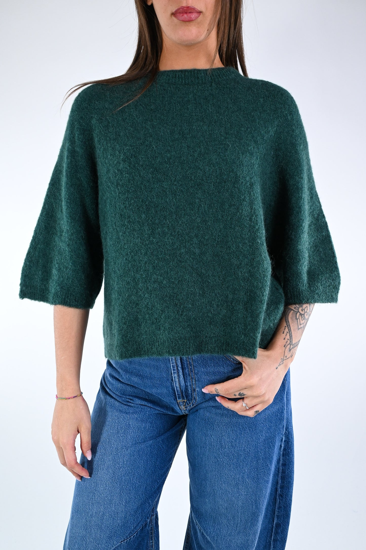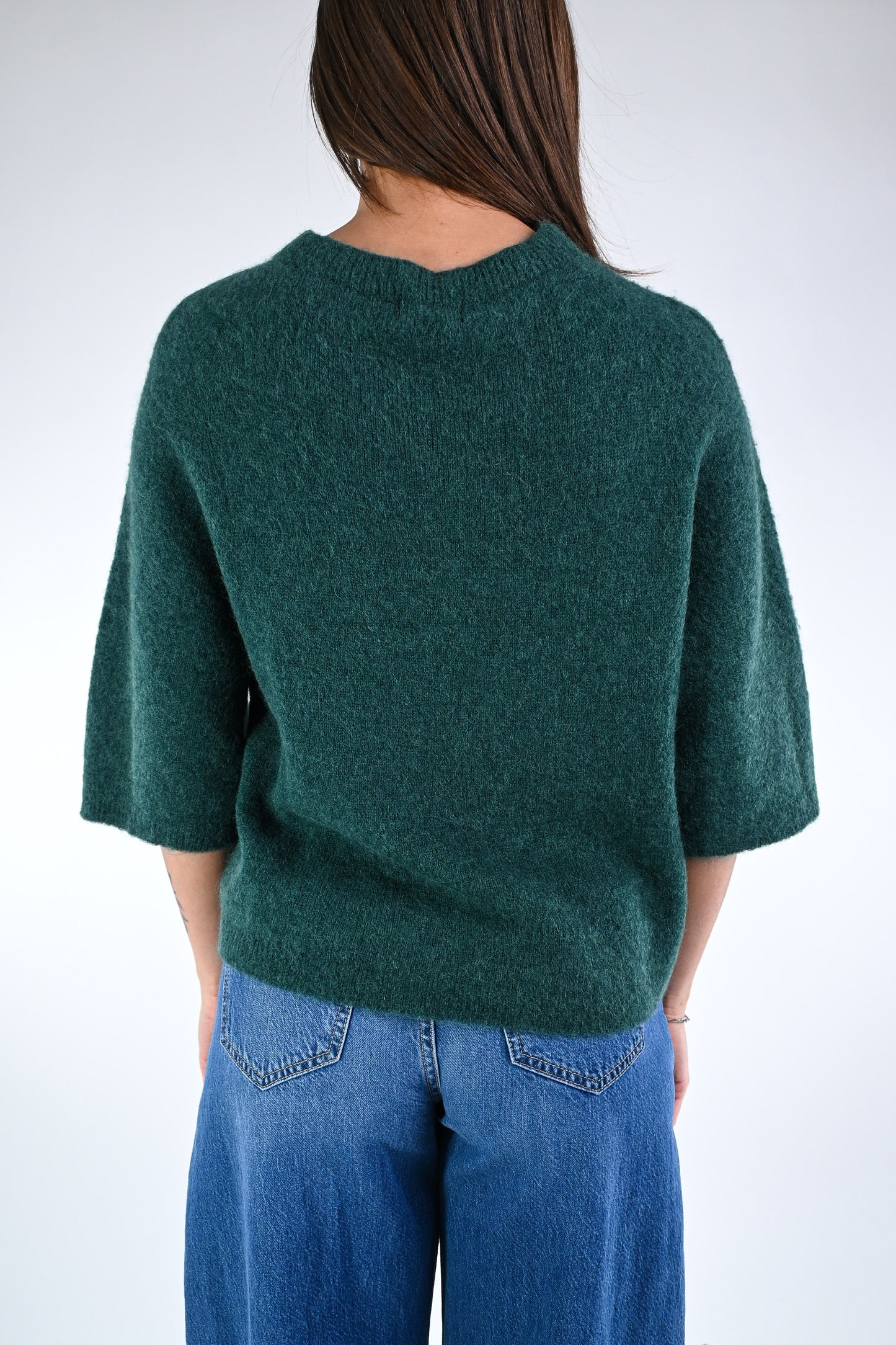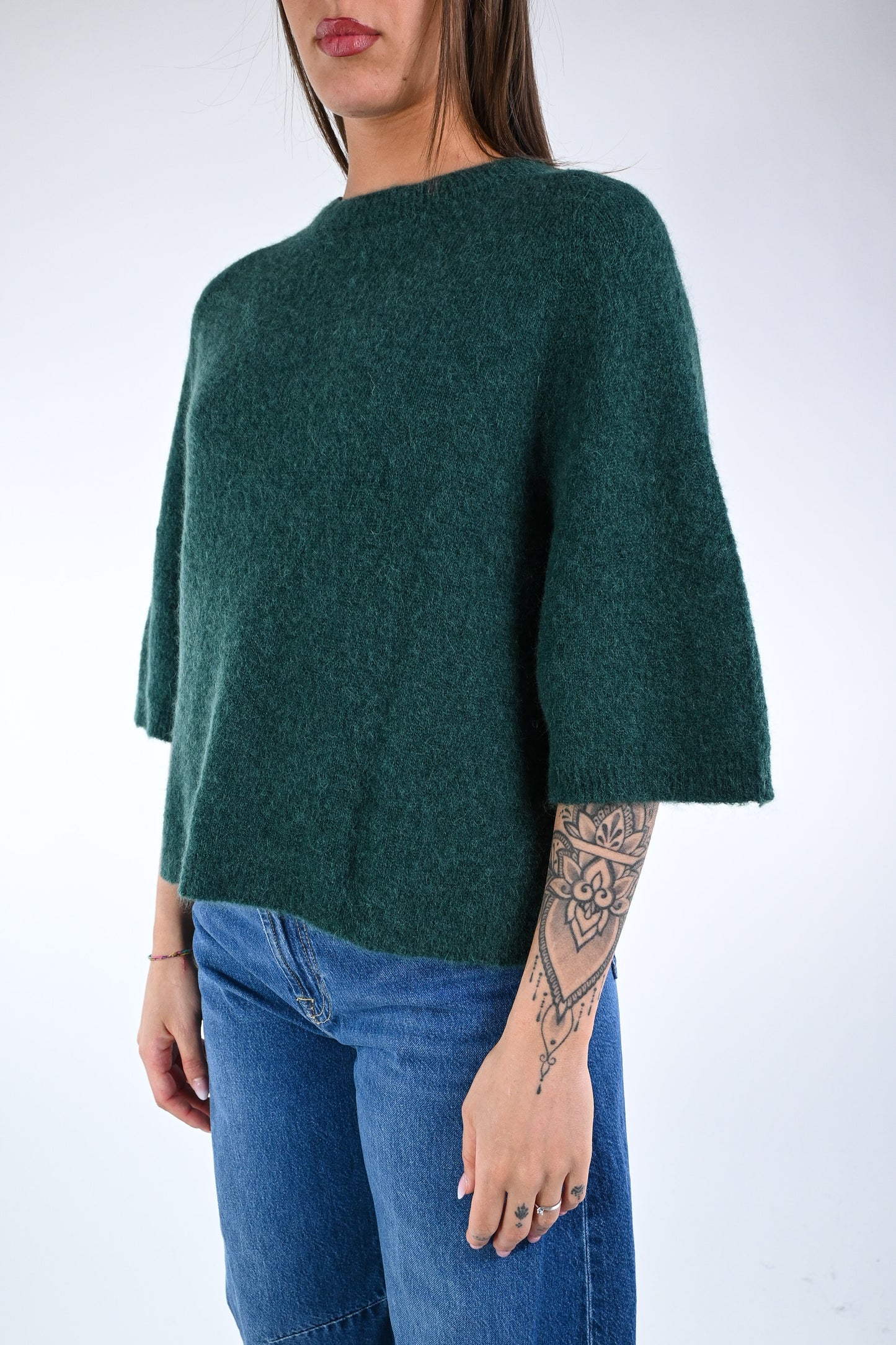 Prezzo normale €24,95Maglia over baby alpaca, manica ampia 3/4, girocollo, colore Bosco.