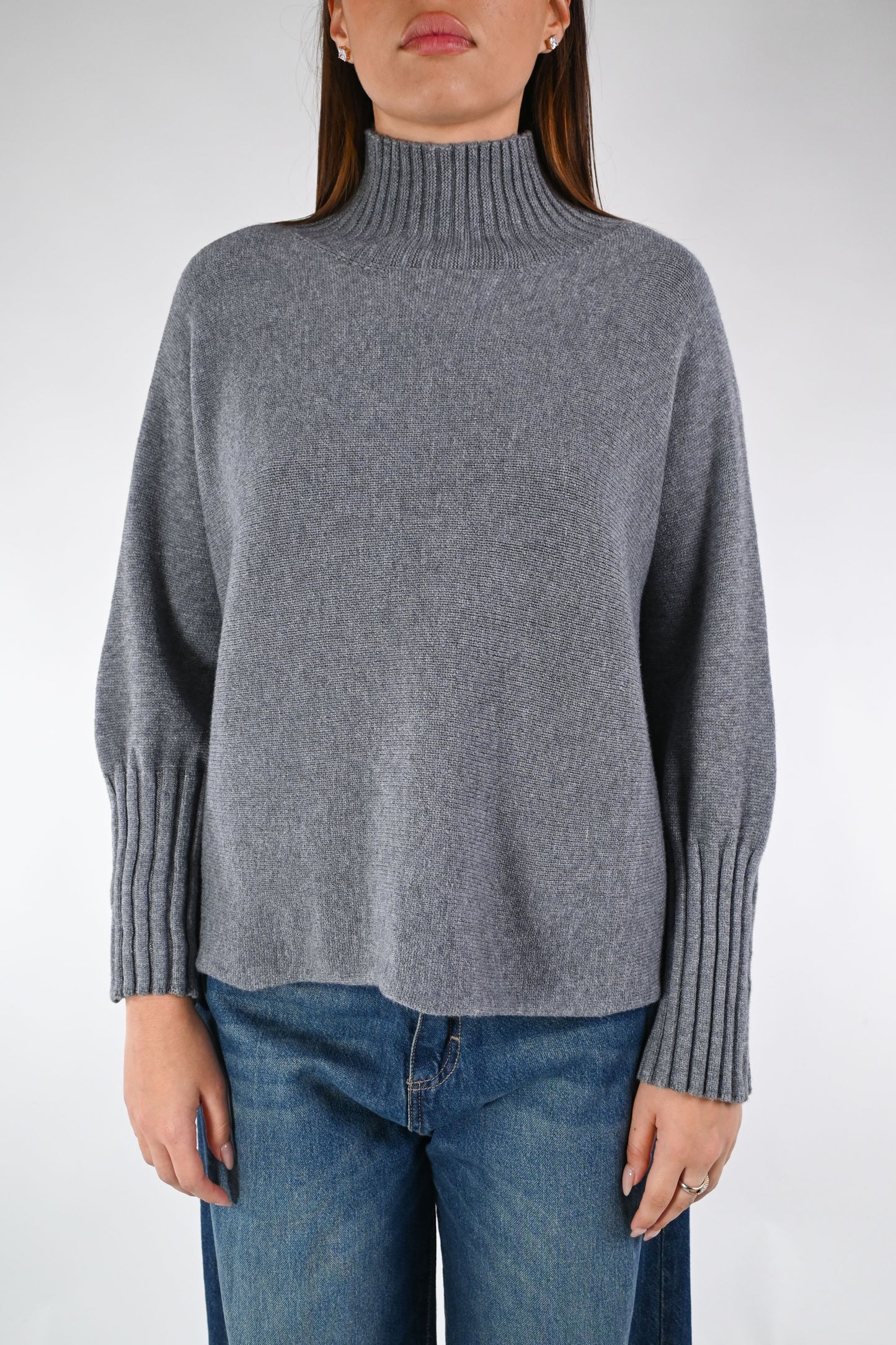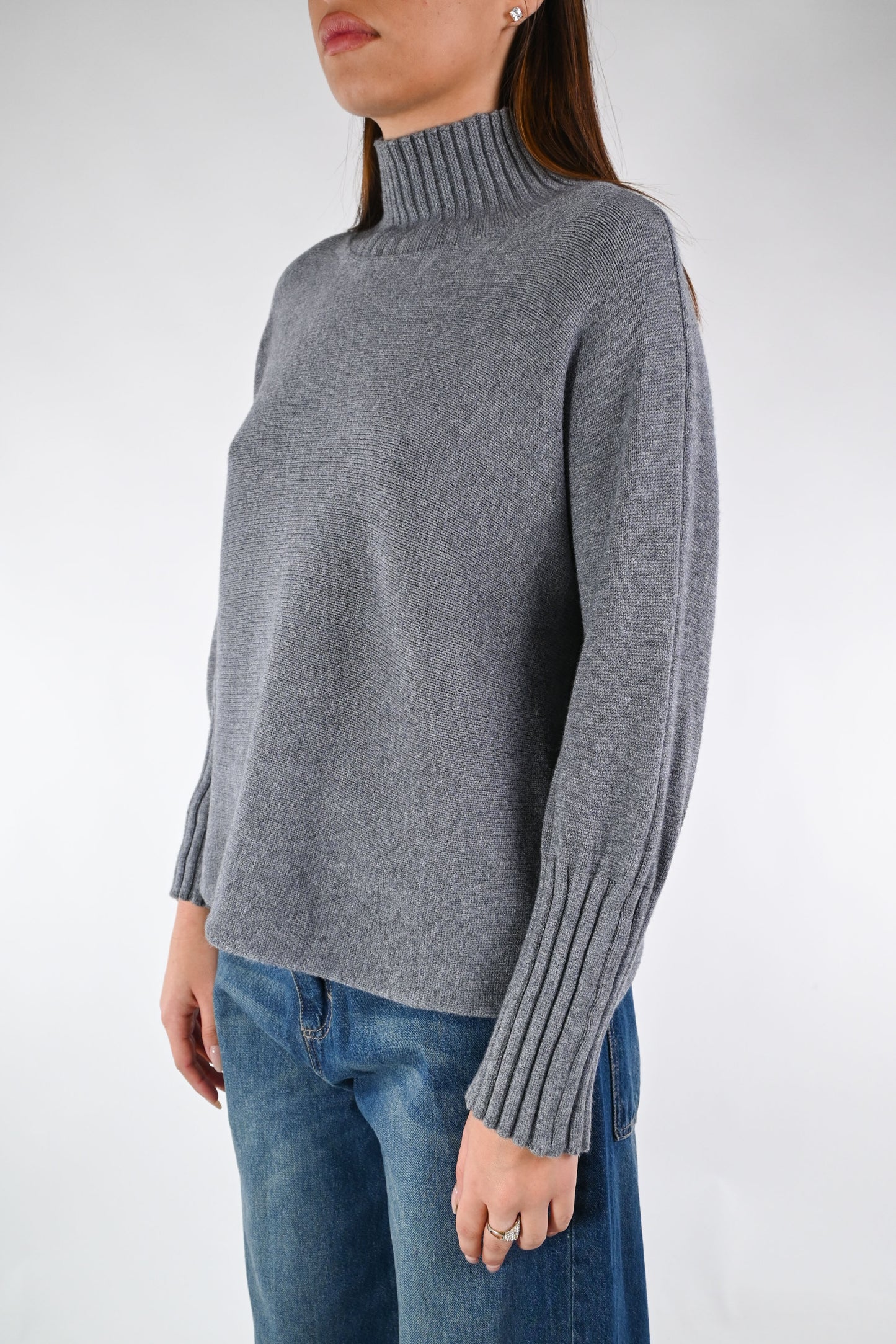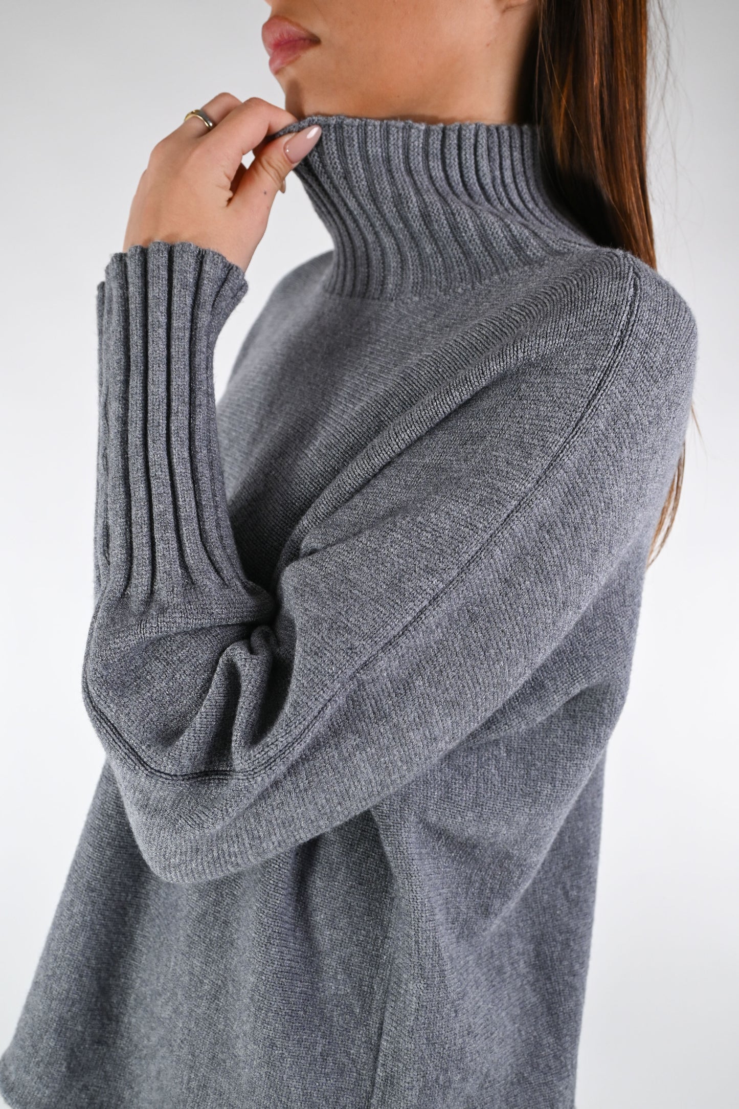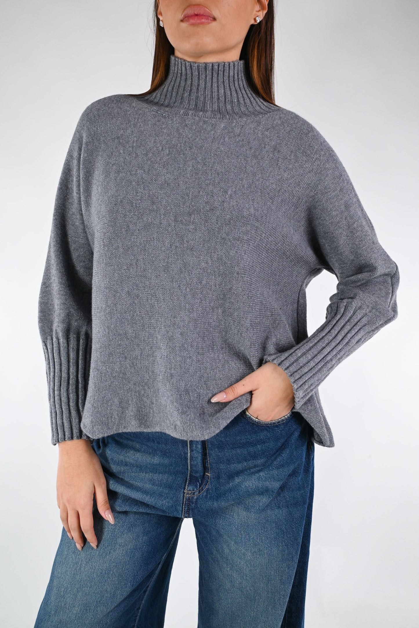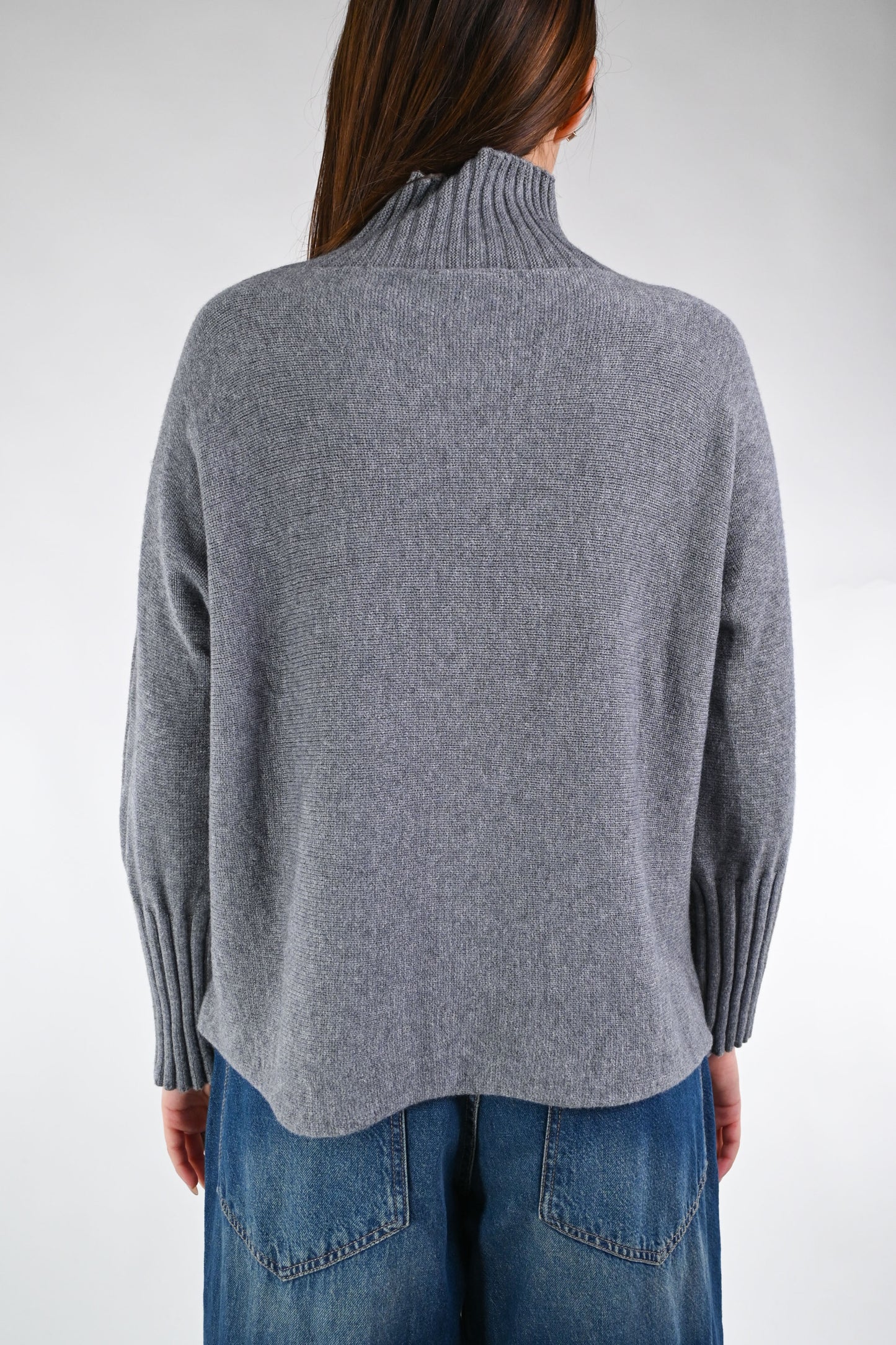 Maglia scatola con collo cratere, in calda viscosa elasticizzata, con collo e polsini a coste, colore grigio