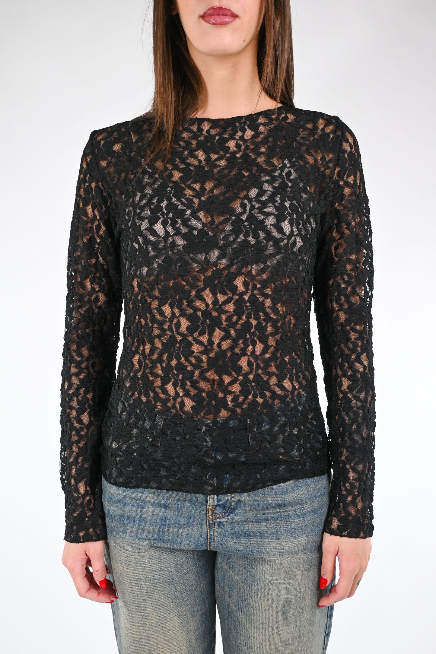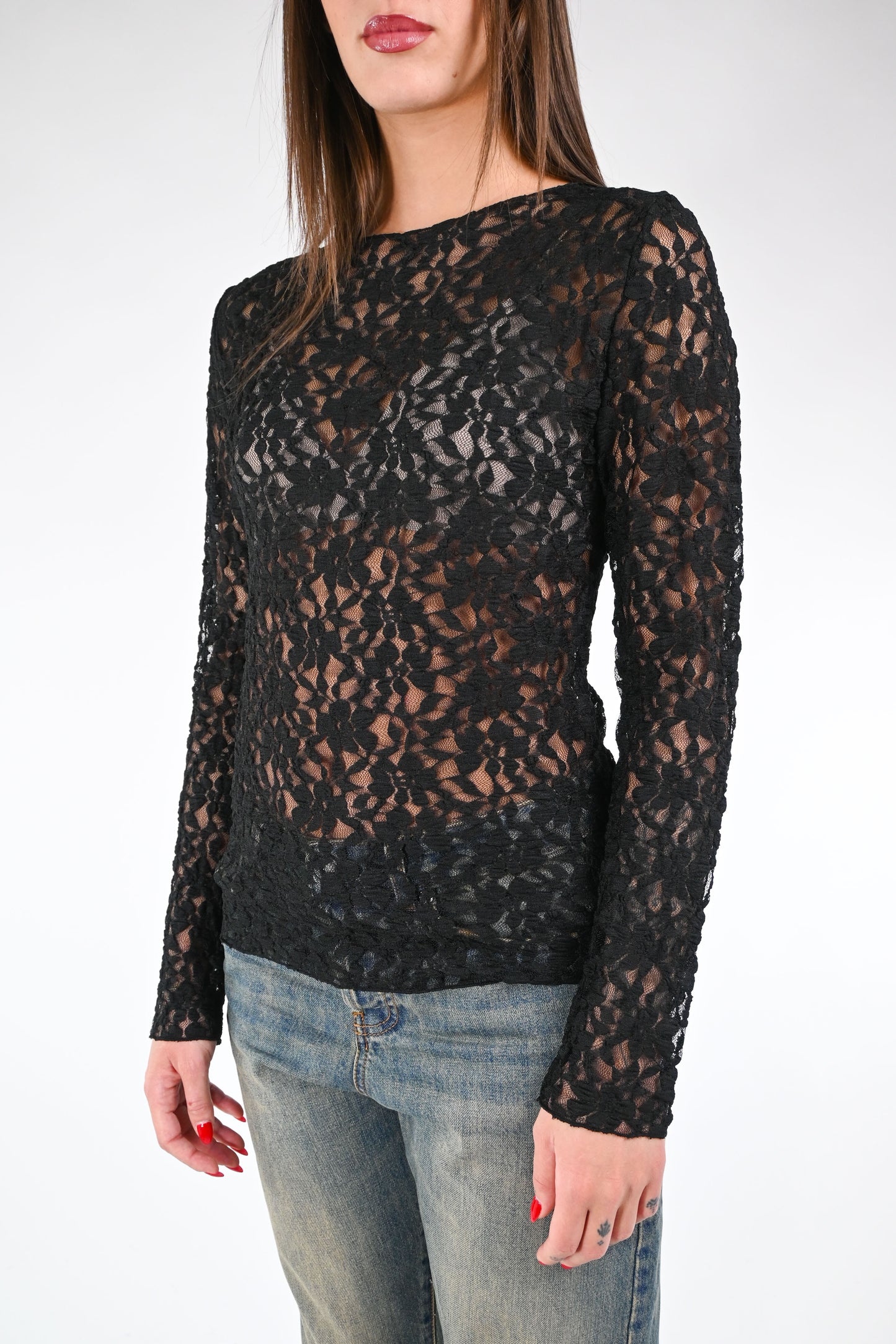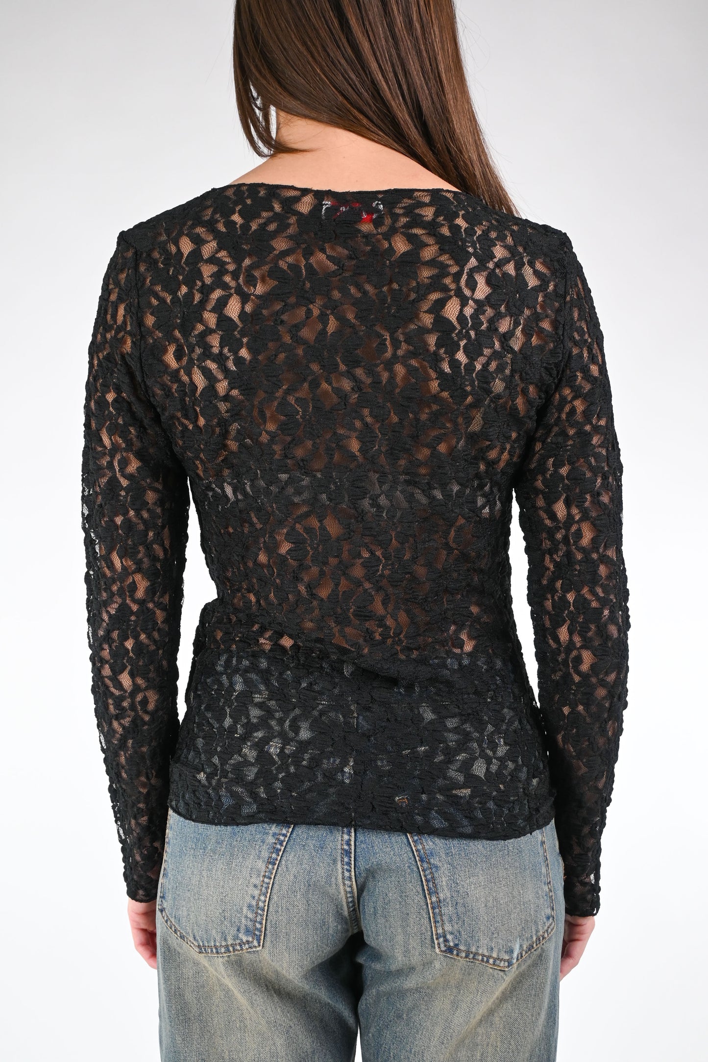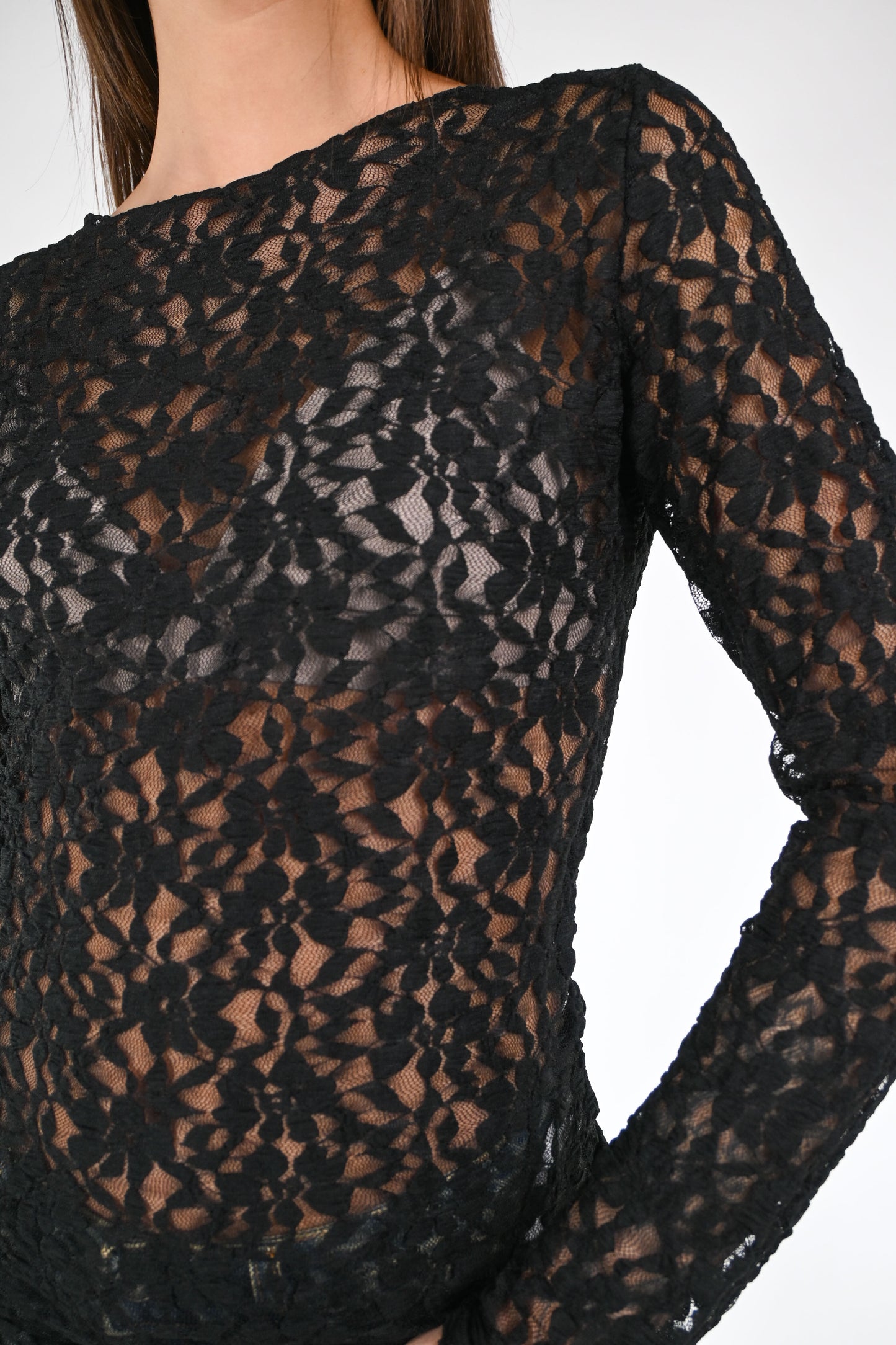 Blusa scollo barchetta in pizzo elasticizzato, manica lunga, colore nero