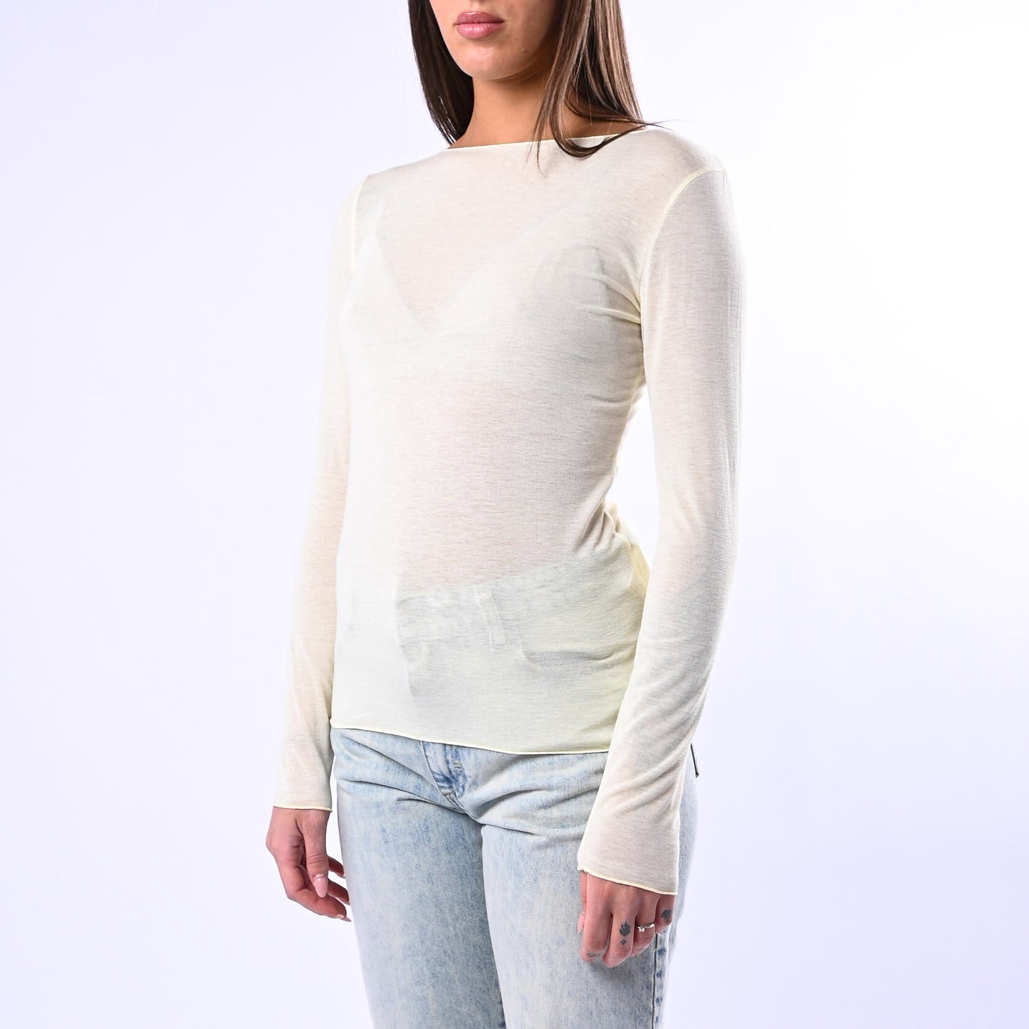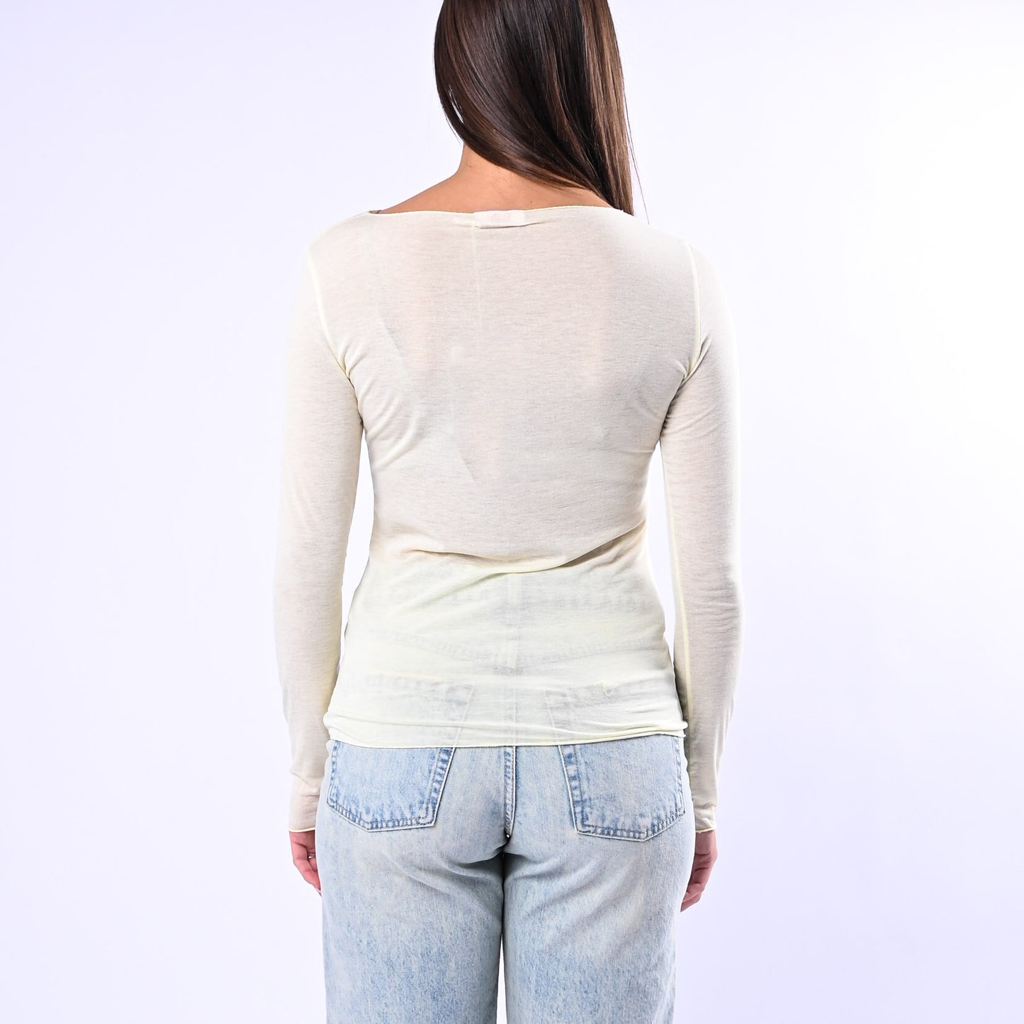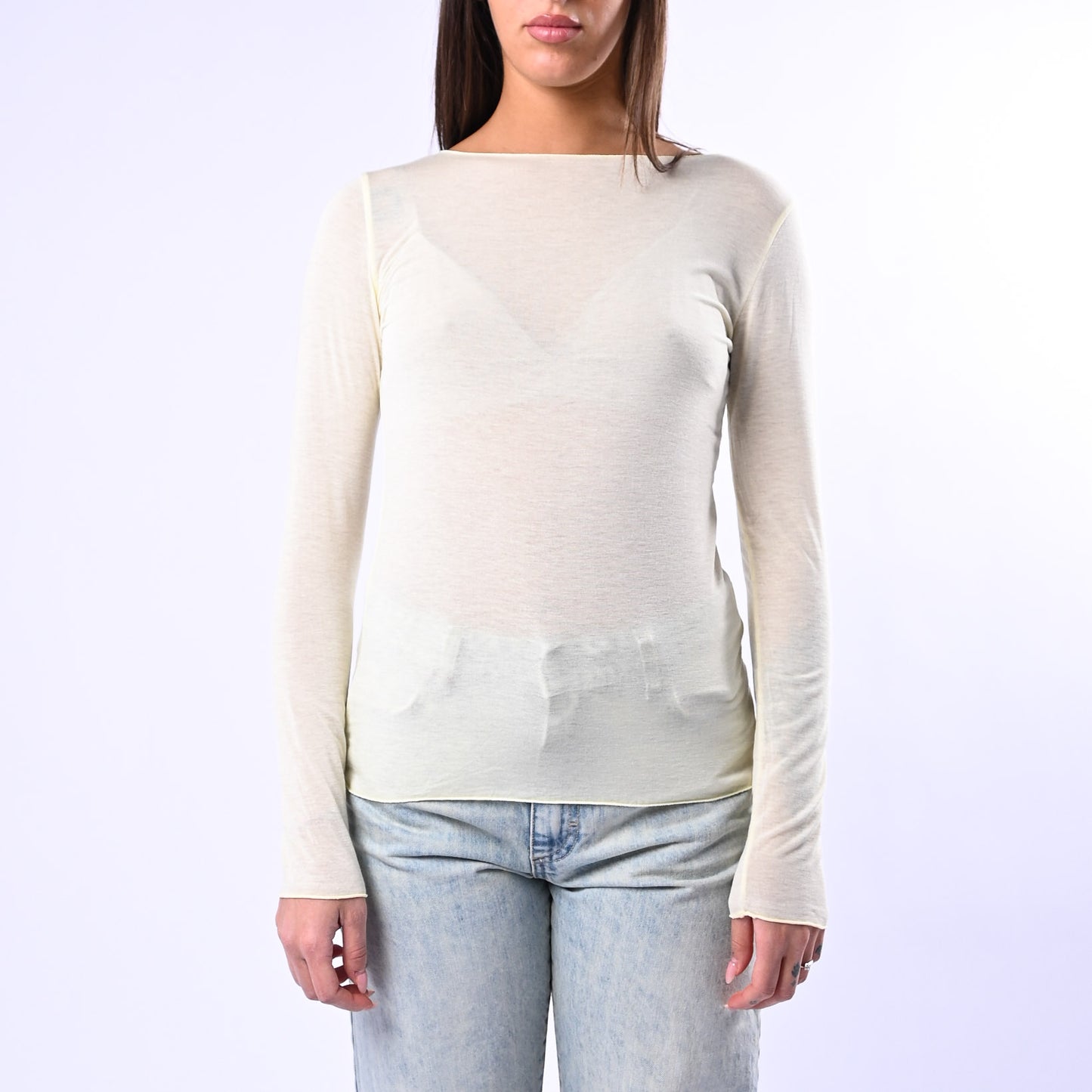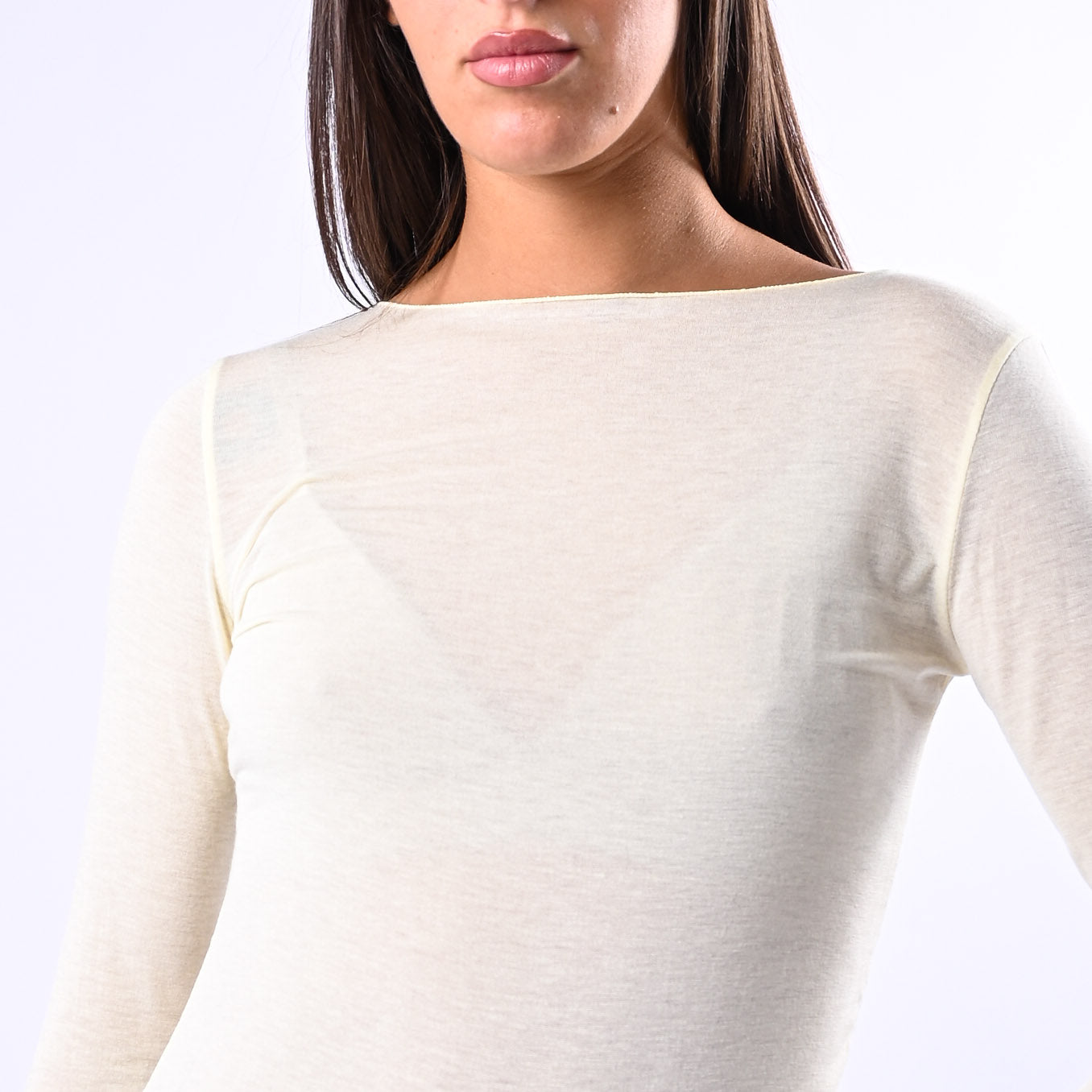 T-shirt elegante con scollo barchetta in leggero misto seta, maniche lunghe elasticizzate per una silhouette morbida e avvolgente. Un pezzo versatile dal design sobrio, ideale per creare look sofisticati sia in contesti casual che più formali.
