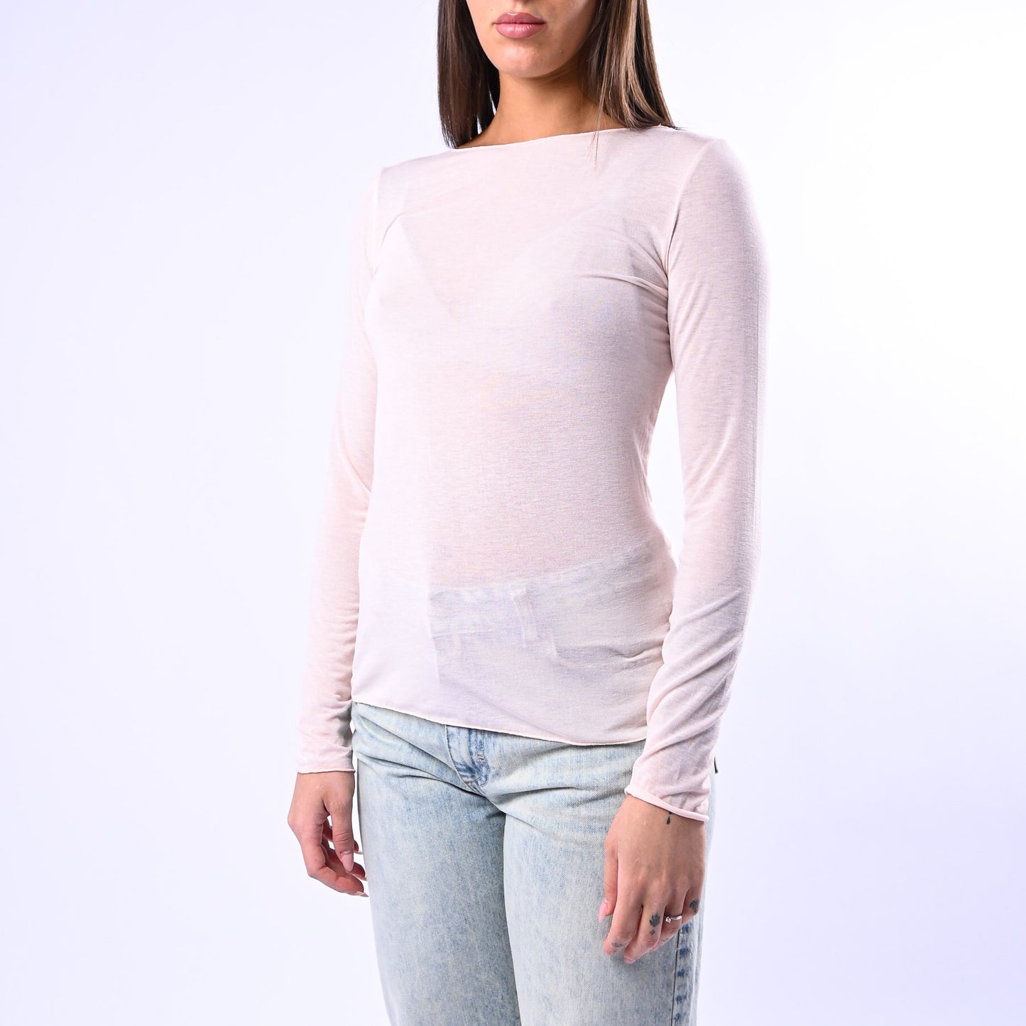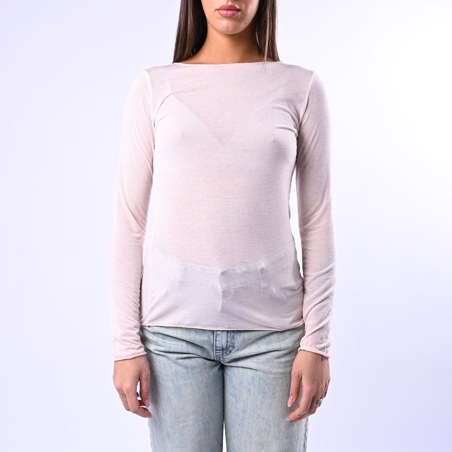 T-shirt elegante con scollo barchetta in leggero misto seta, maniche lunghe elasticizzate per una silhouette morbida e avvolgente. Un pezzo versatile dal design sobrio, ideale per creare look sofisticati sia in contesti casual che più formali.