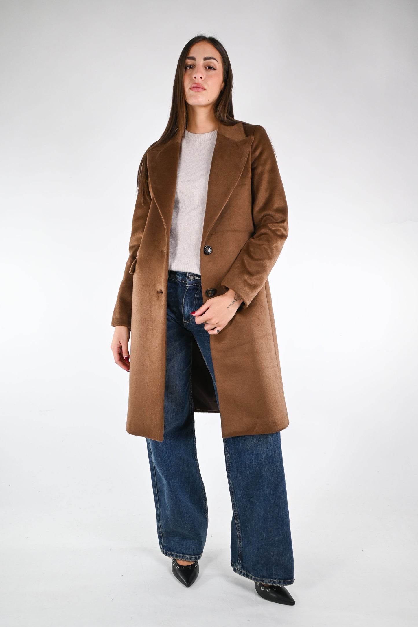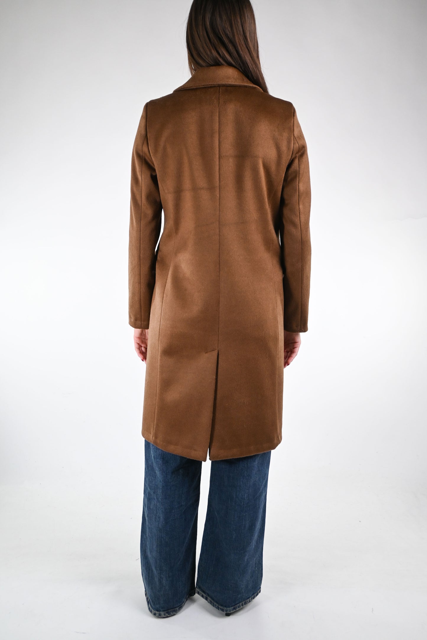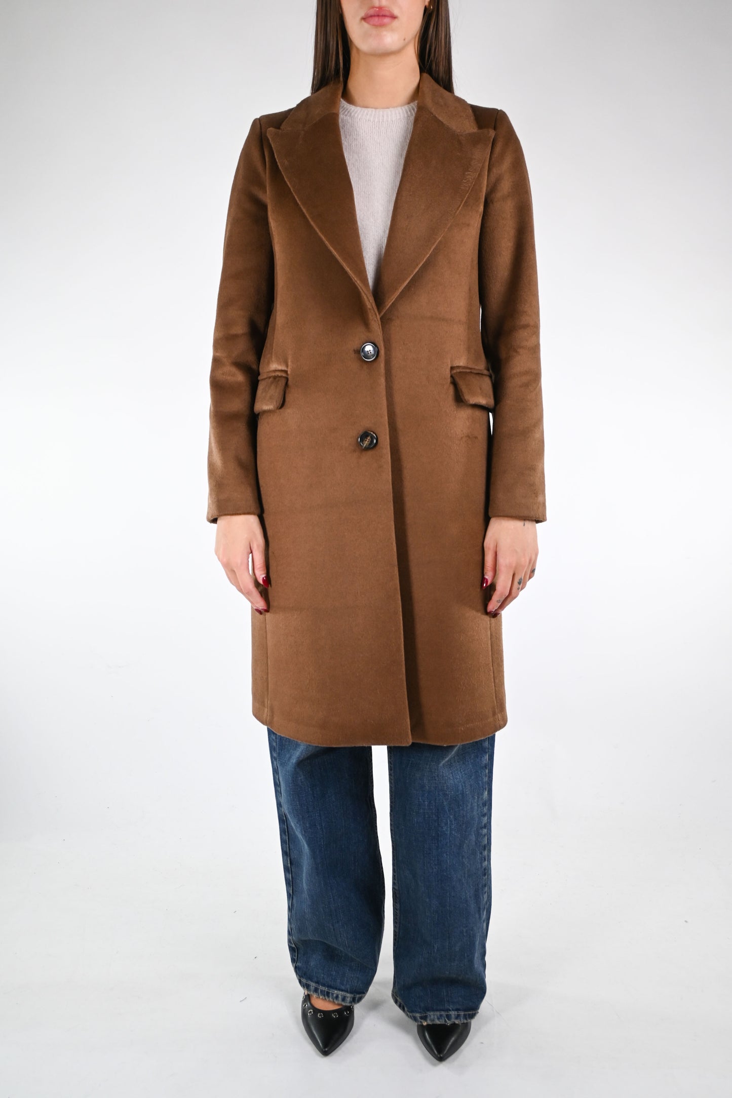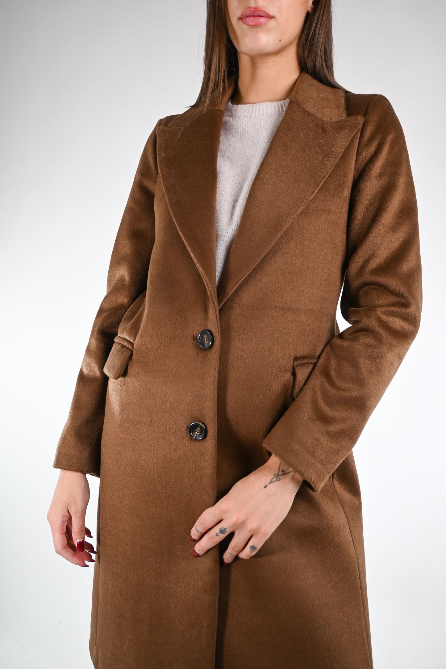 Cappotto dritto due bottoni in morbido tessuto mano morbida, leggermente peloso, con collo a lancia, spacco dietro, foderato, con tasche, colore biscotto