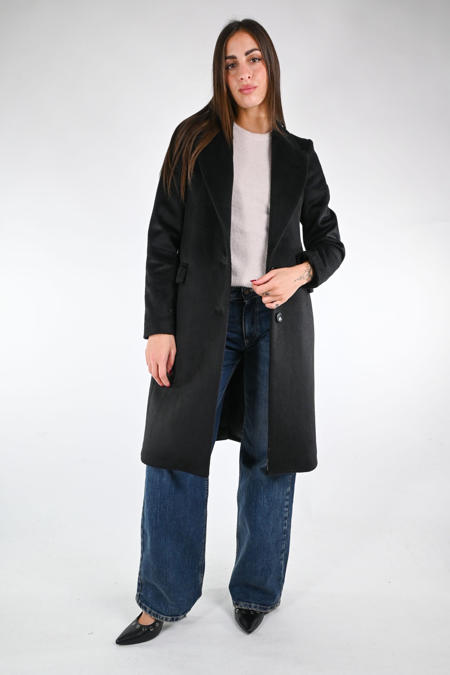 Cappotto dritto due bottoni in morbido tessuto mano morbida, leggermente peloso, con collo a lancia, spacco dietro, foderato, con tasche, colore nero